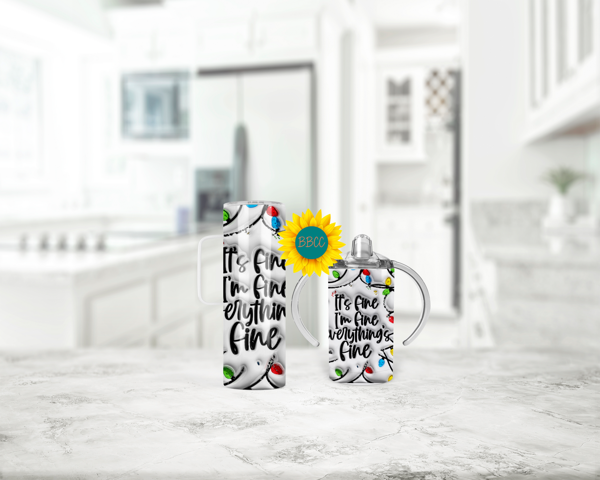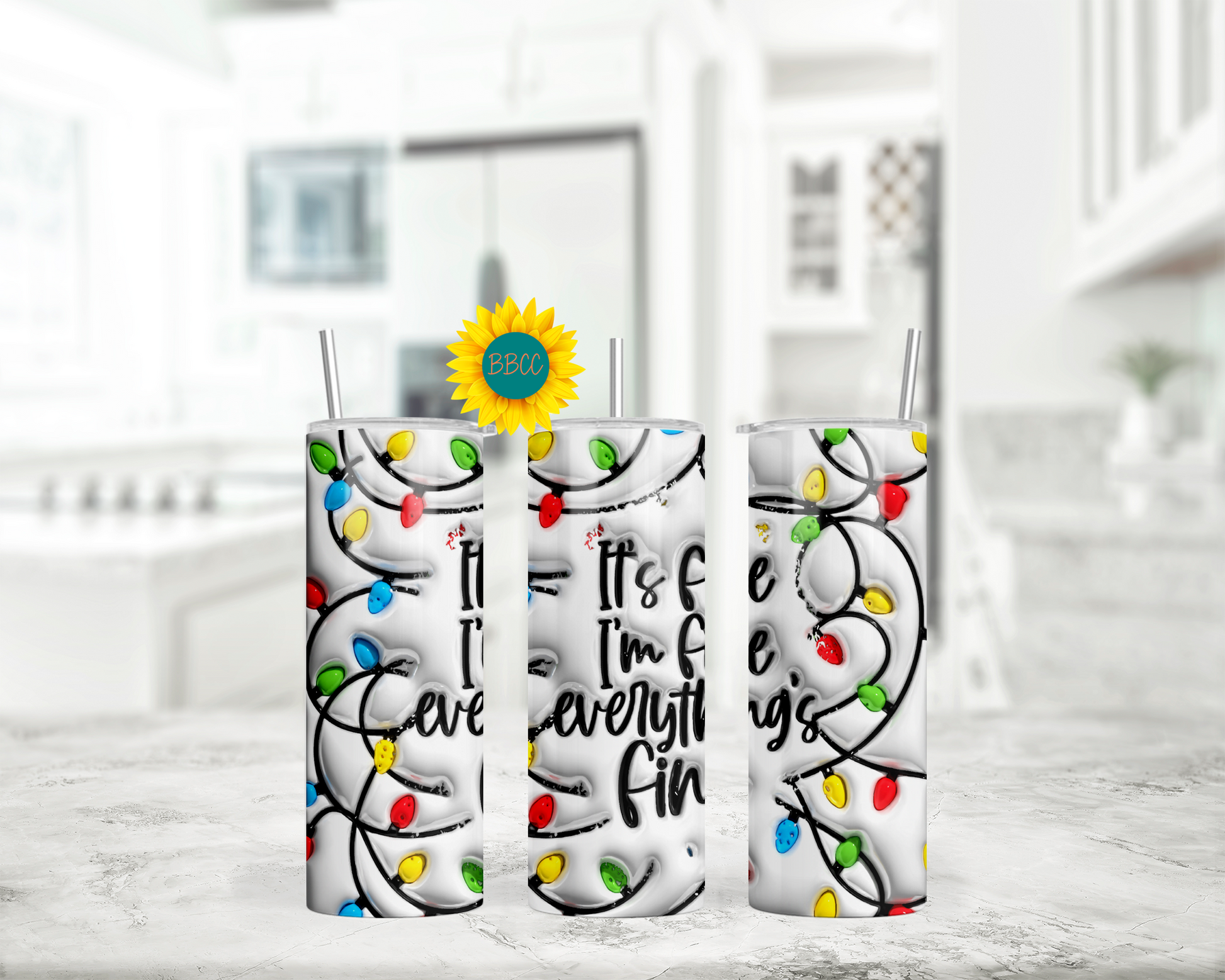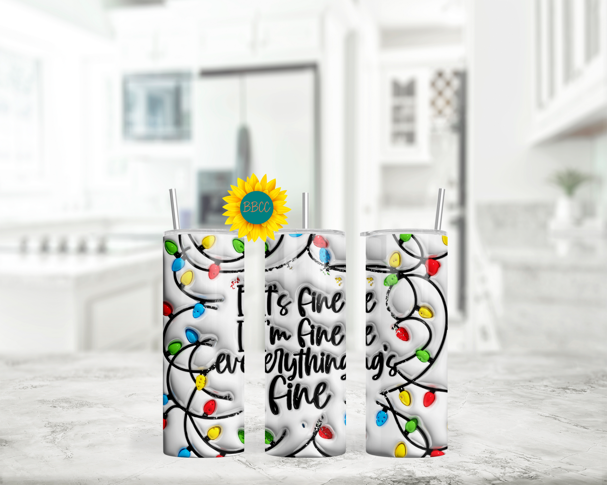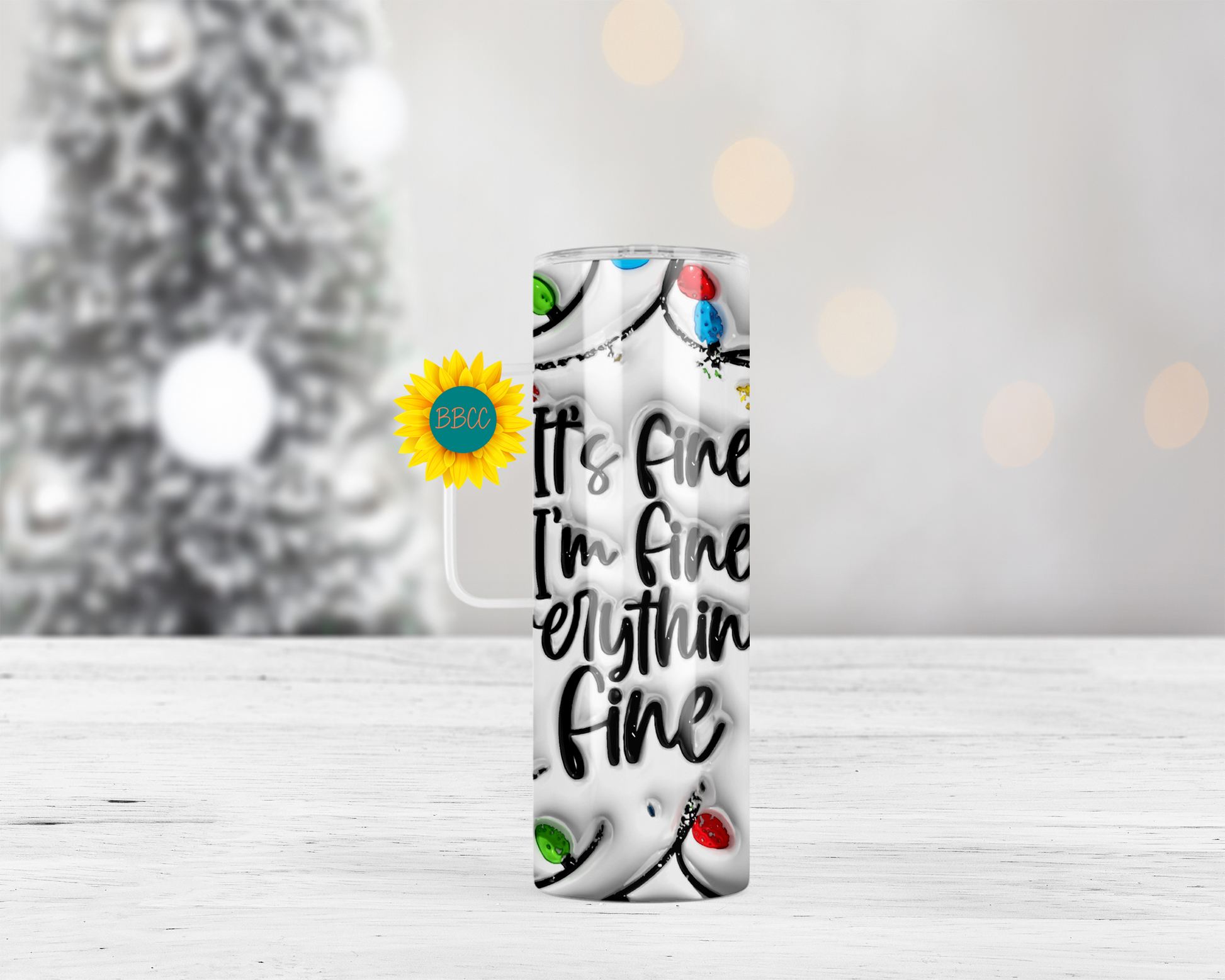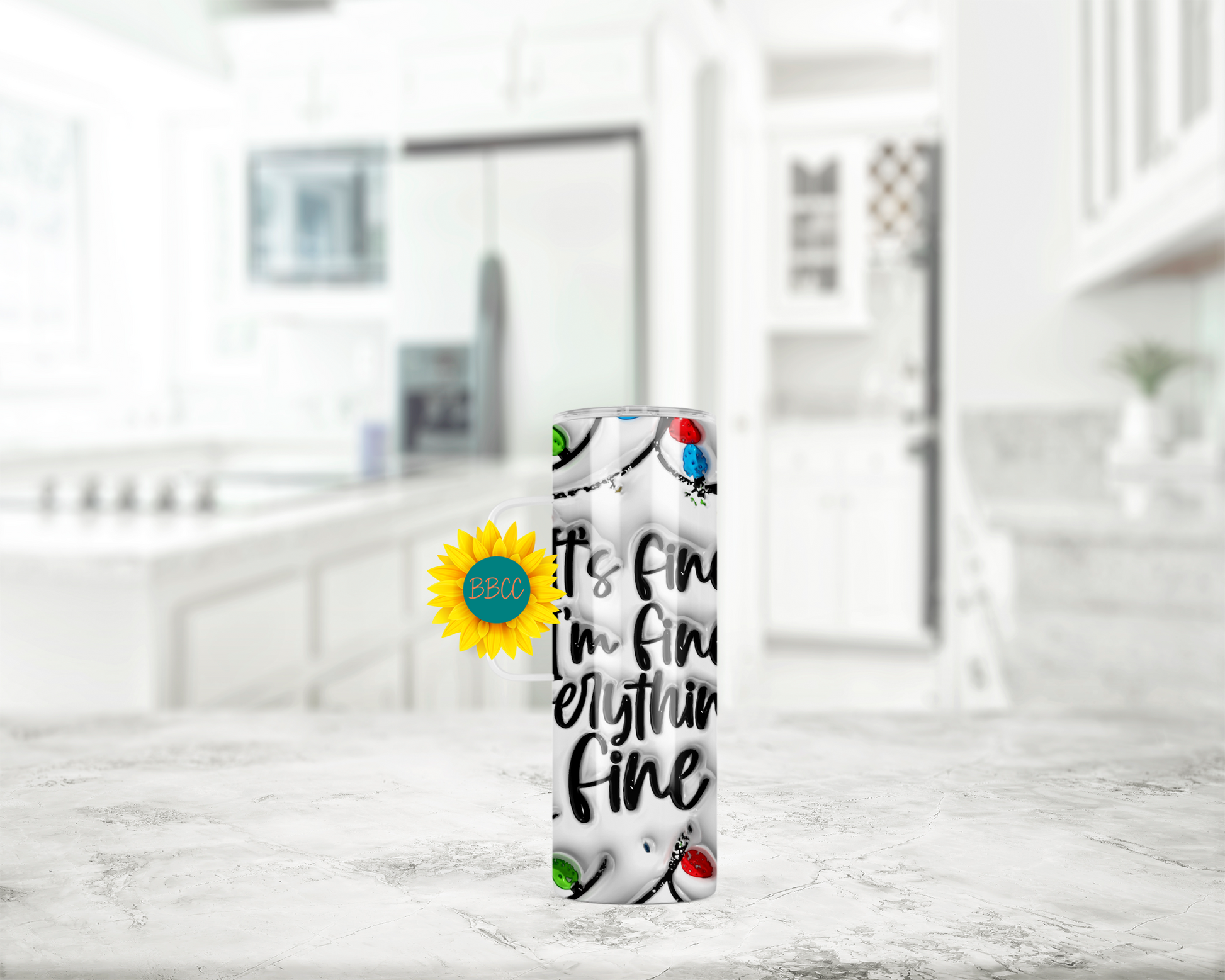 Get through the holiday chaos in style with our Everything's Fine Tumbler. This quirky 20 oz tumbler, available in straight style, features the perfect festive phrase "It's fine, I'm fine, Everything is fine" surrounded by twinkling Christmas lights. Keep calm and carry on with this must-have holiday accessory!