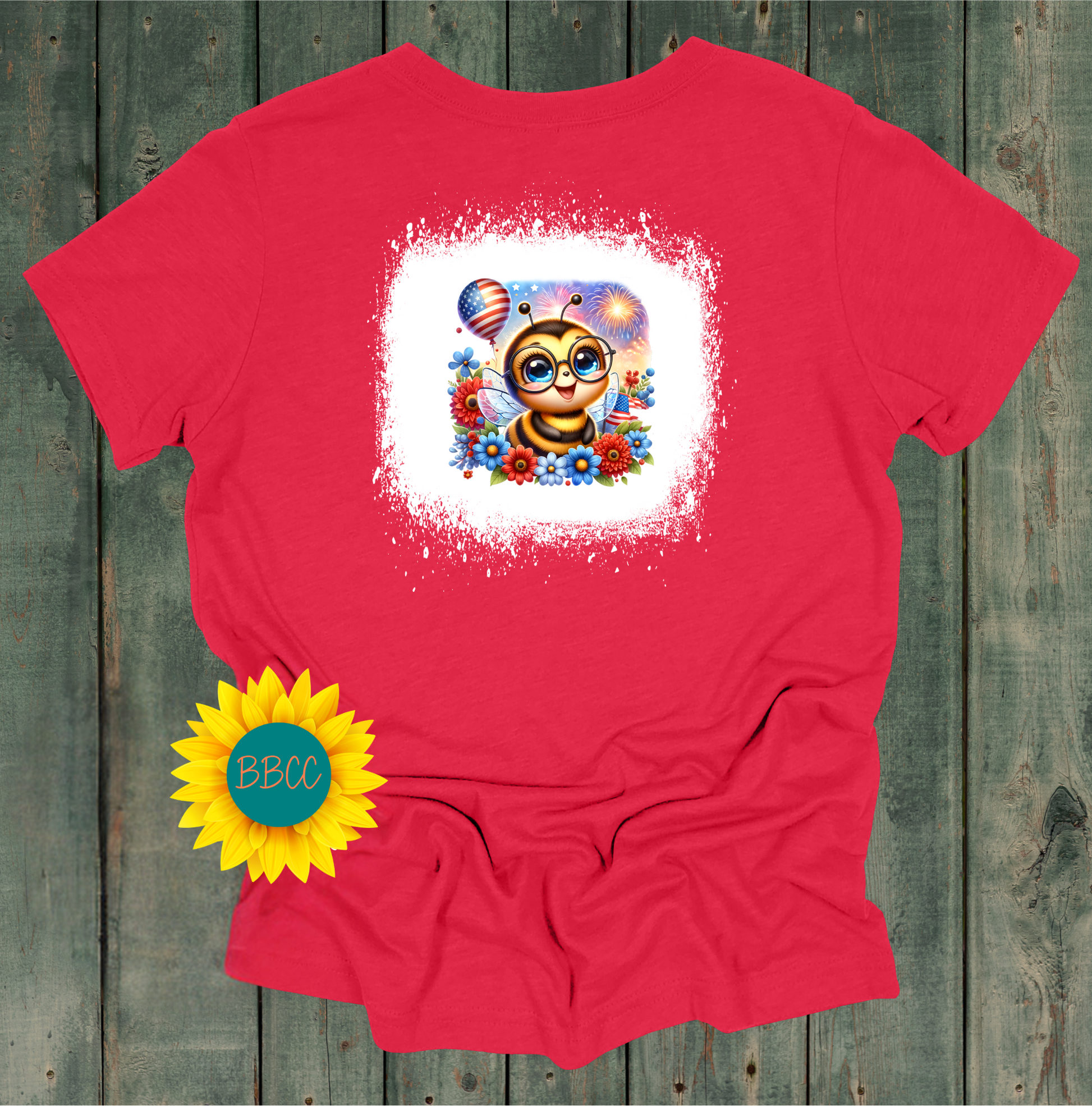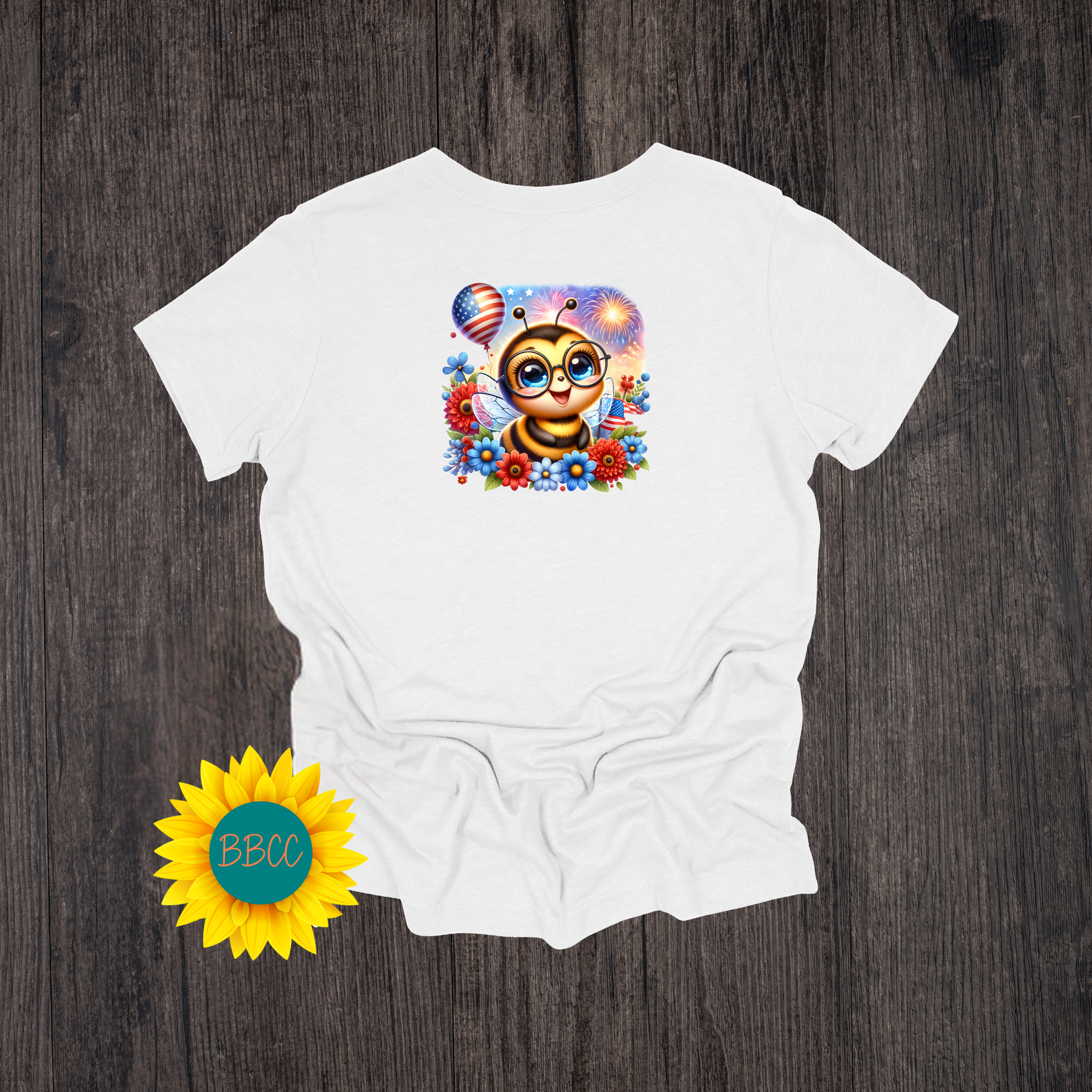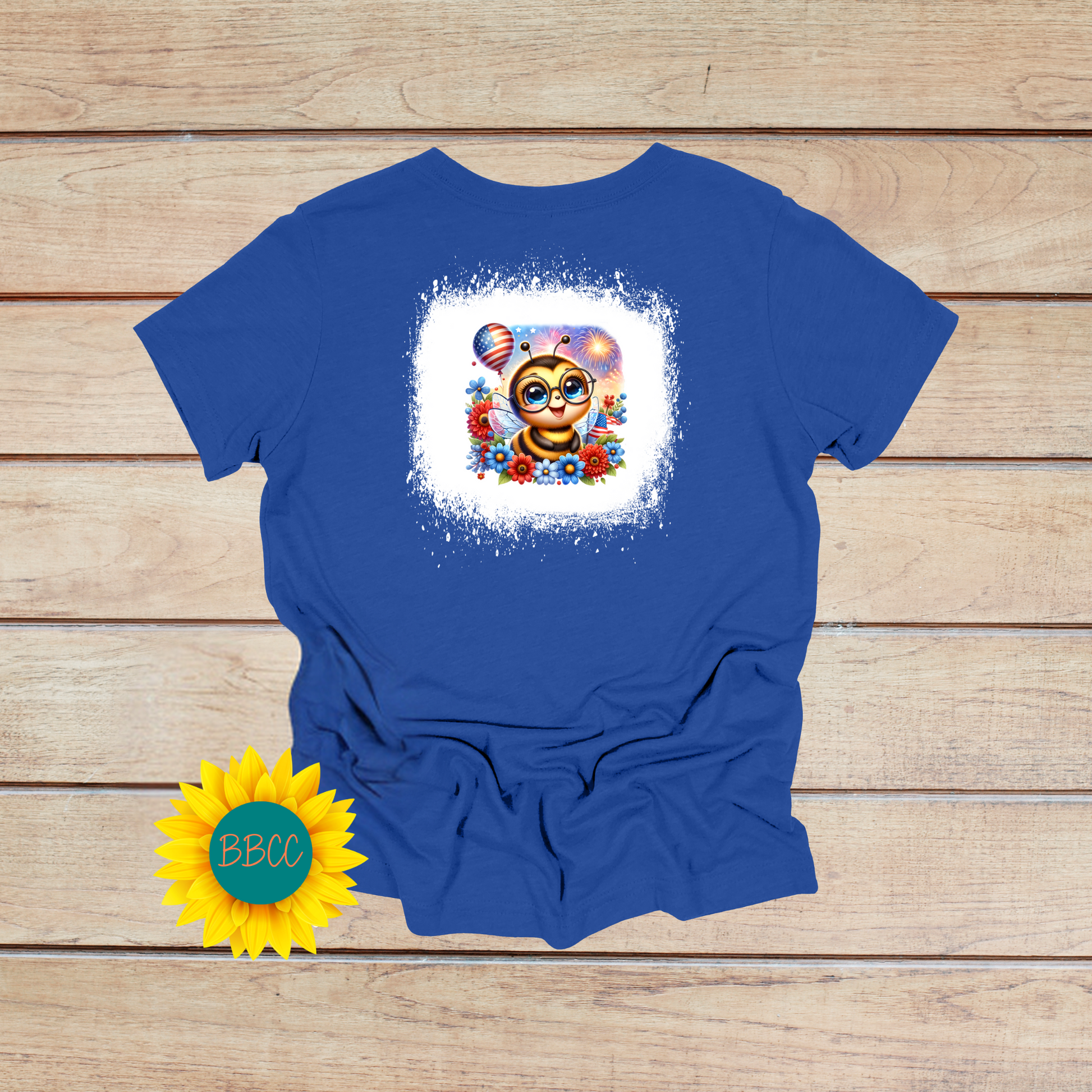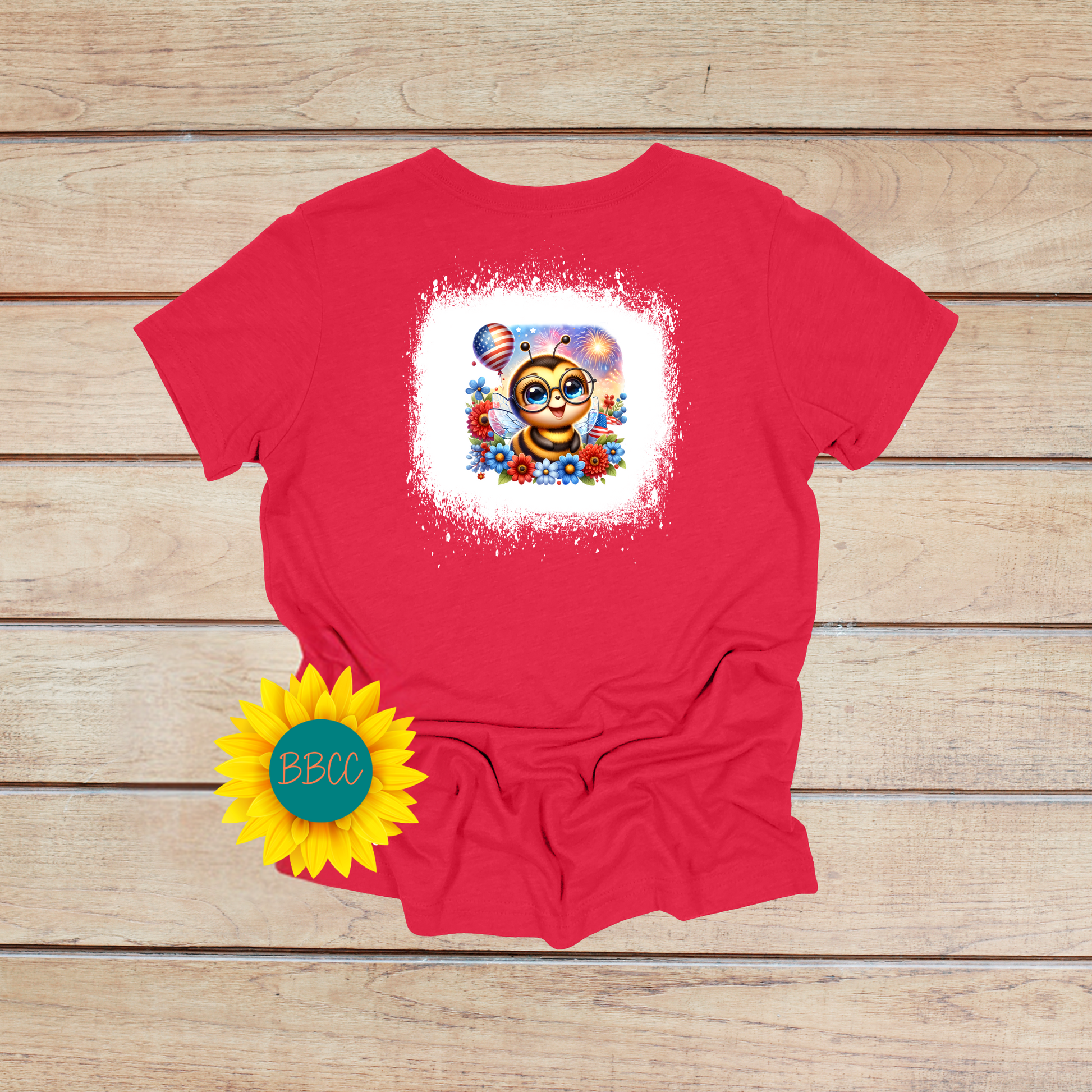 Get into the patriotic spirit with this adorable Bee T-shirt featuring a fun and quirky bee design. Available in red, white, or blue, with a unique bleached effect on the red and blue options for extra charm. Perfect for buzzing around in style this Independence Day!