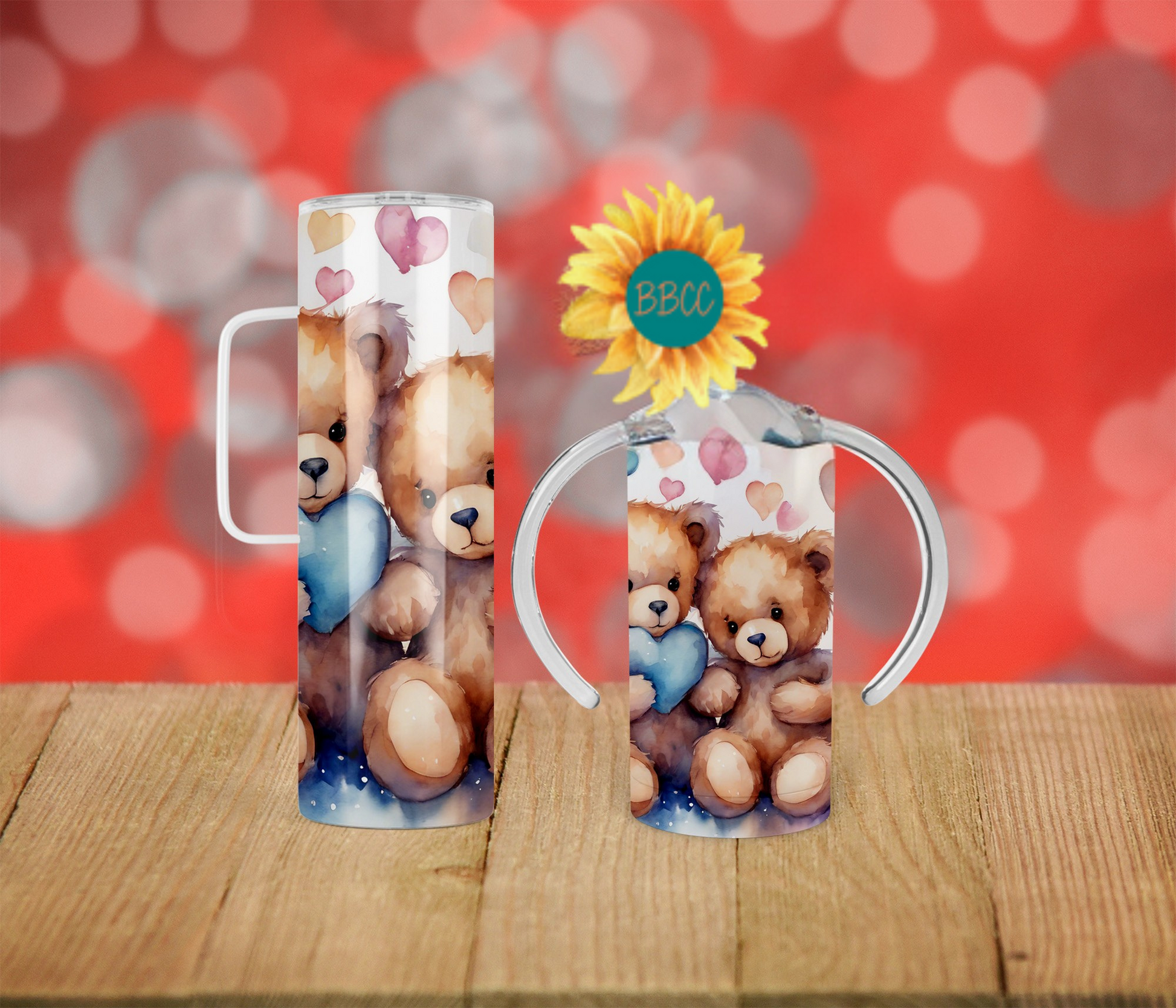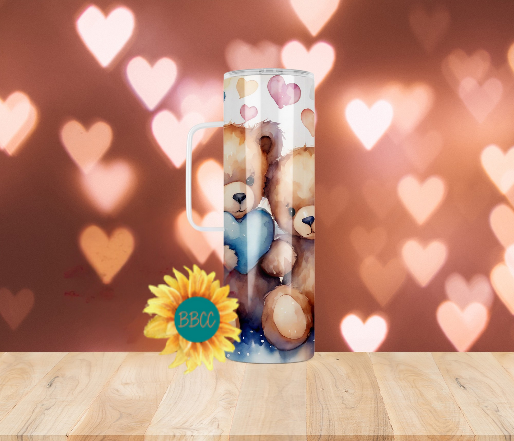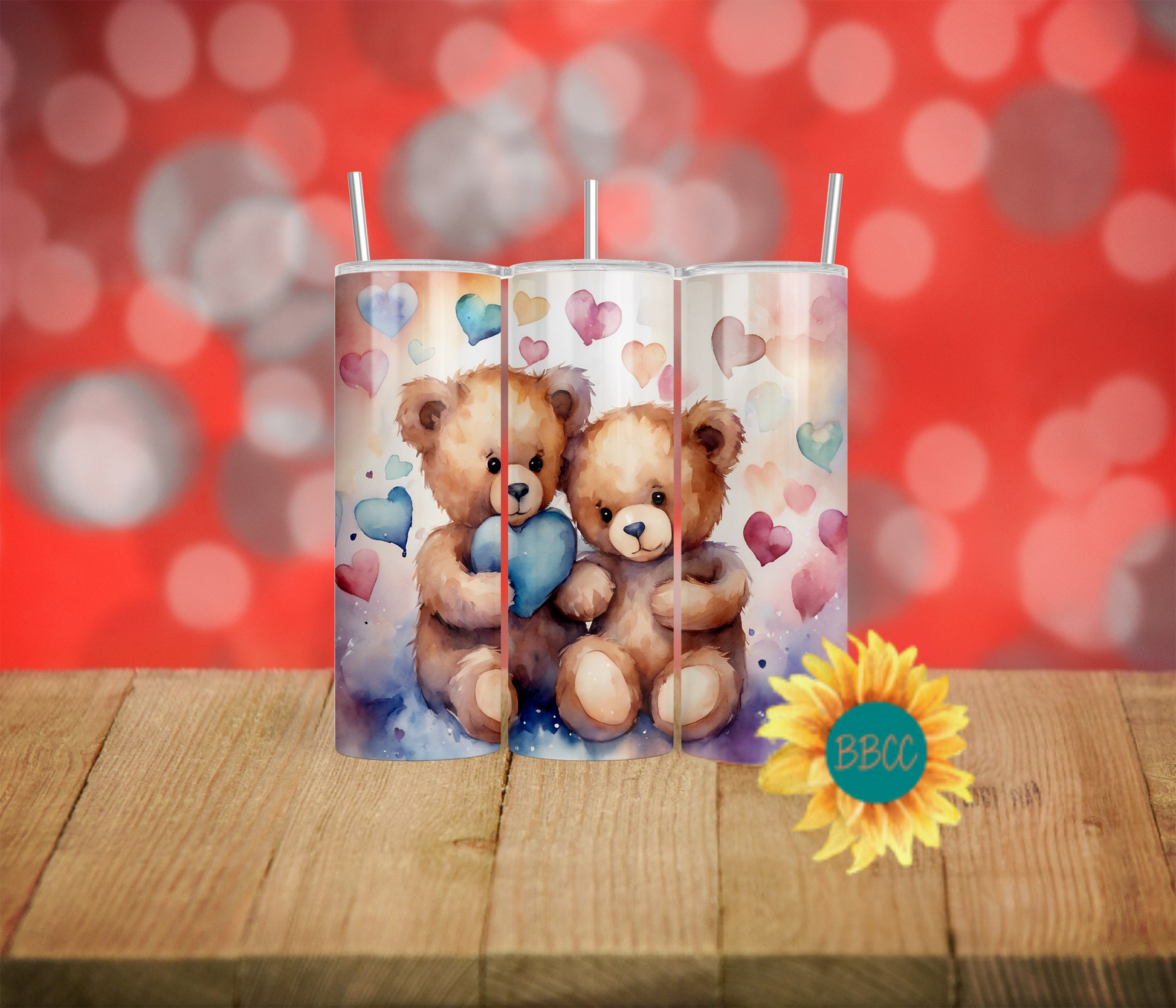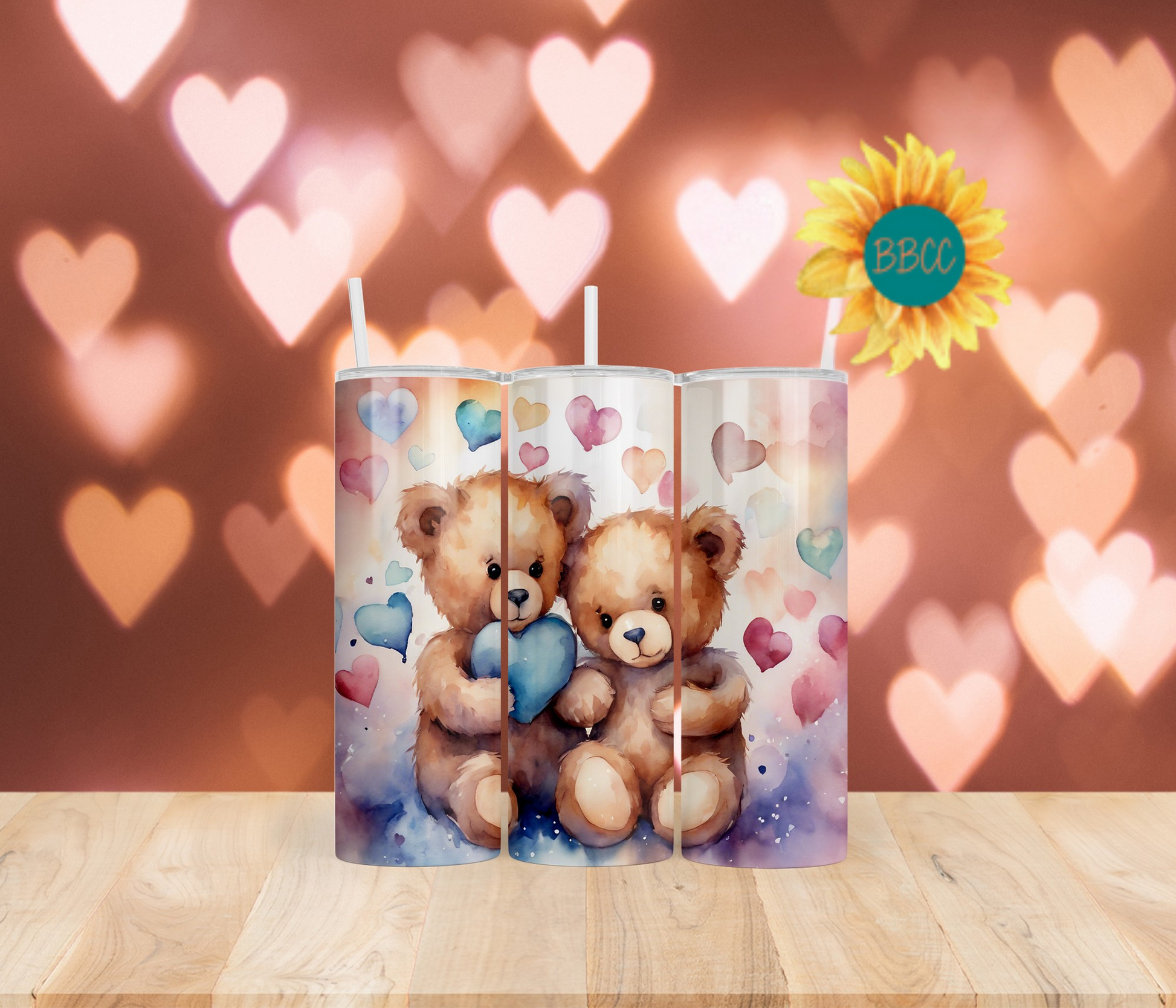 The Blue Bears Tumbler features adorable fuzzy bears holding a blue heart, surrounded by a variety of colorful hearts. Available in different sizes and combinations, this tumbler is perfect for any bear lover. Keep your drinks at the ideal temperature while proudly showcasing your love for bears with this charming and unique tumbler.