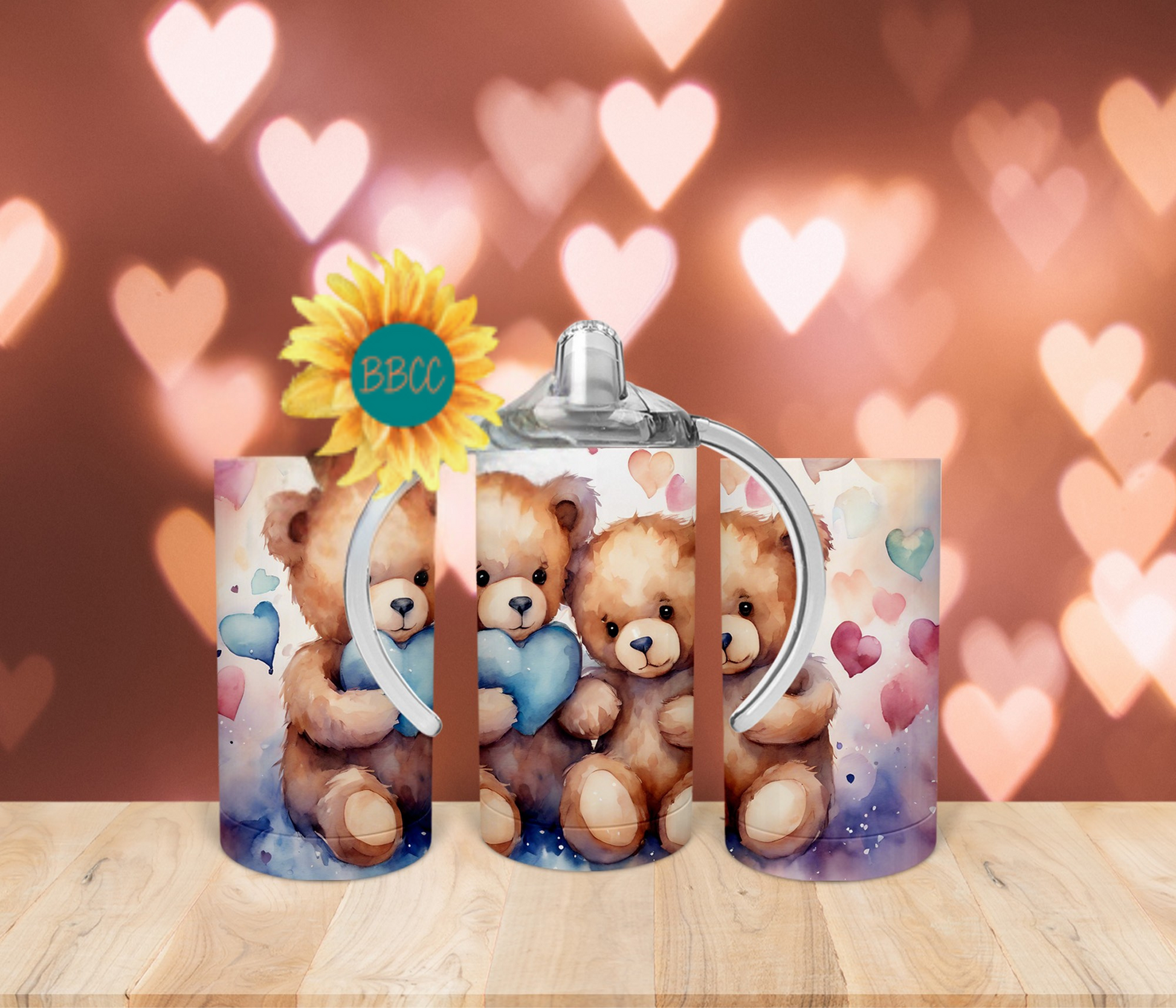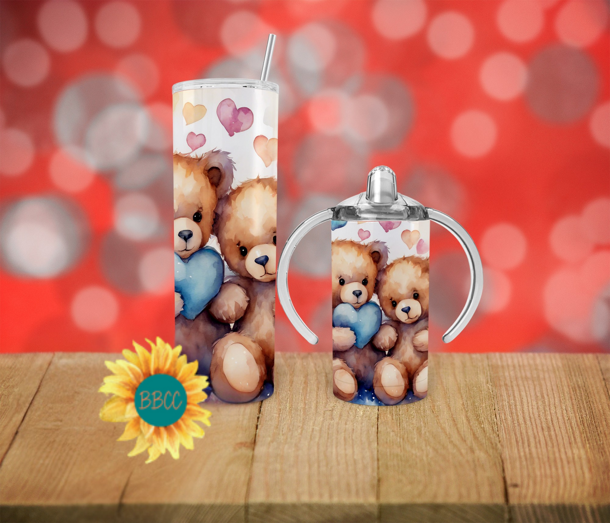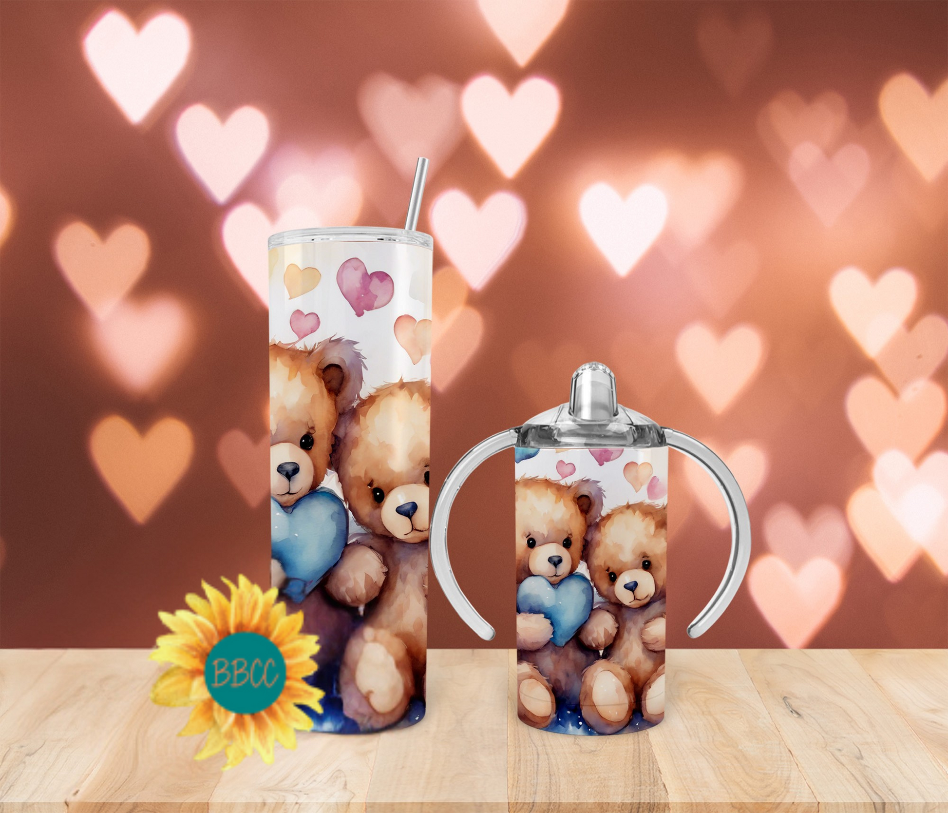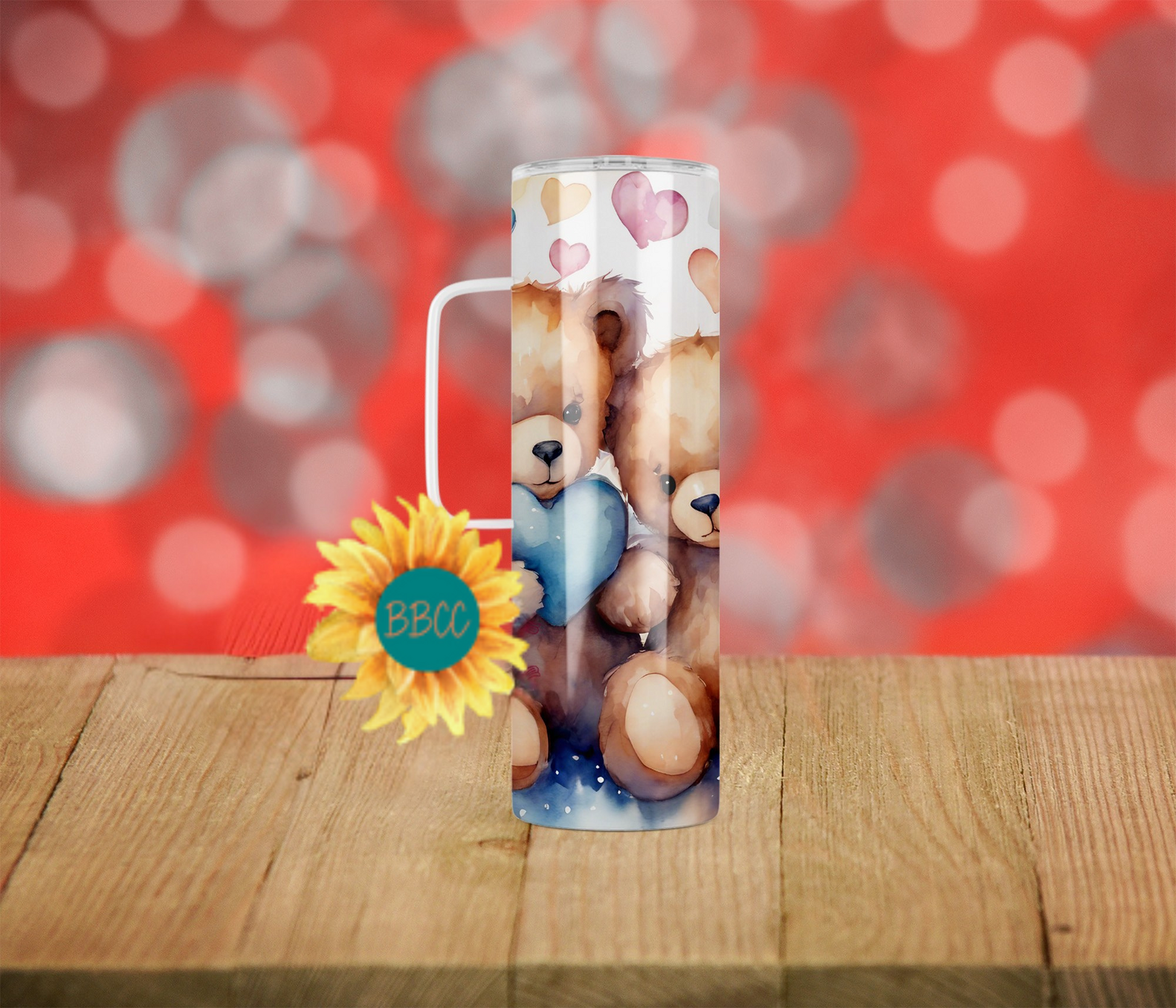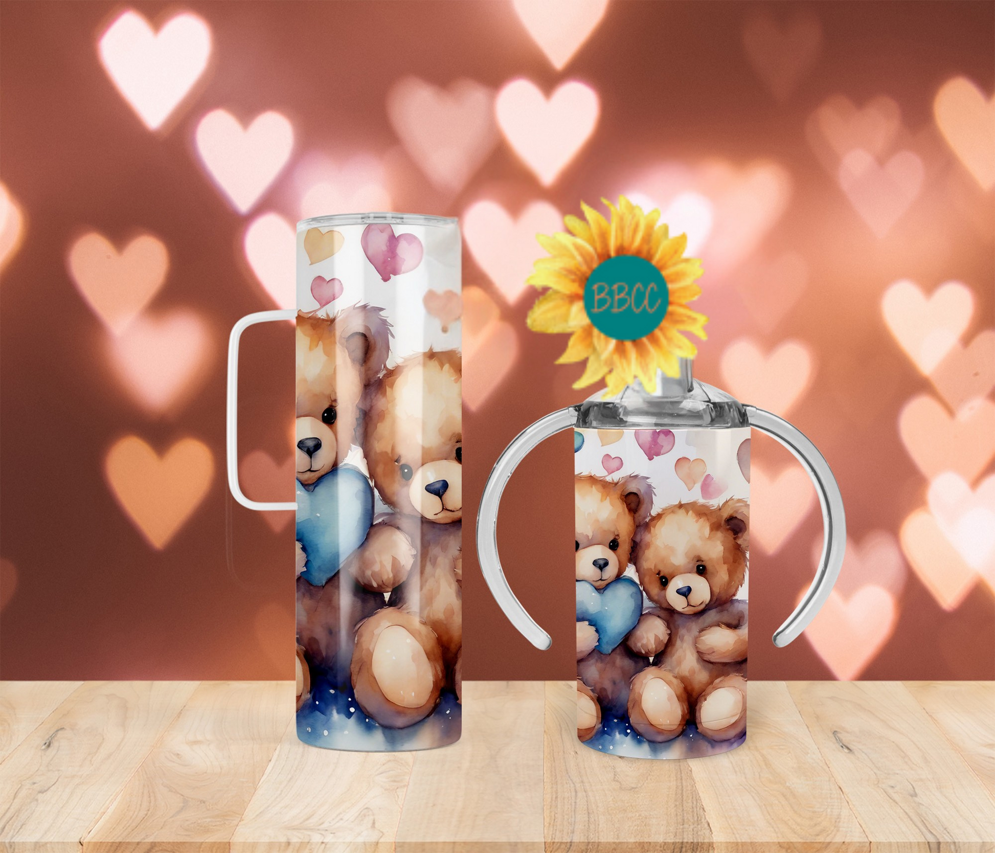 The Blue Bears Tumbler features adorable fuzzy bears holding a blue heart, surrounded by a variety of colorful hearts. Available in different sizes and combinations, this tumbler is perfect for any bear lover. Keep your drinks at the ideal temperature while proudly showcasing your love for bears with this charming and unique tumbler.