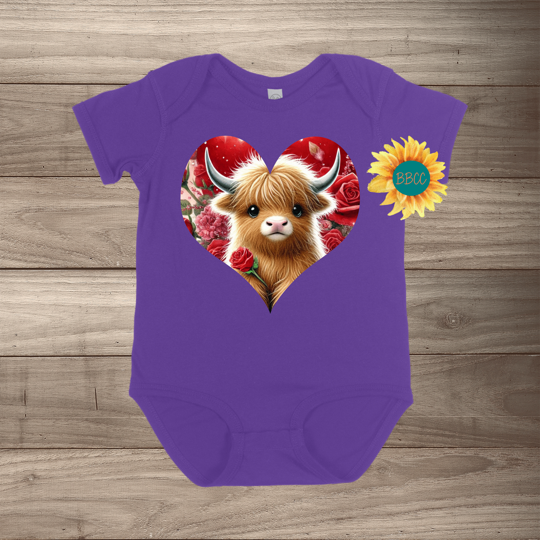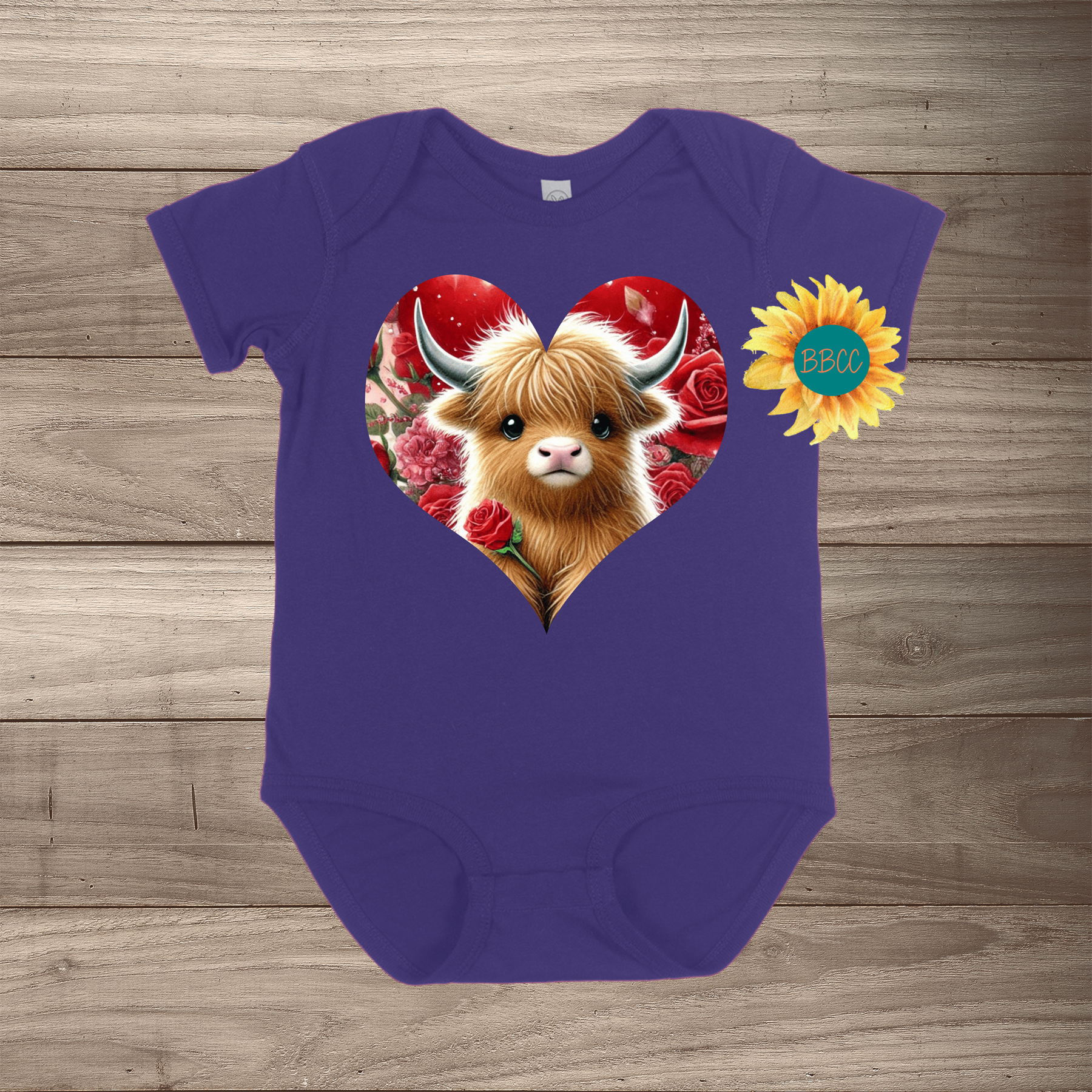 This adorable short sleeve romper features a sweet brown baby highland cow nestled among a bed of flowers on a vibrant red heart. Available in multiple colors and sizes up to 24 months, it’s the perfect blend of comfort and style for any baby’s wardrobe. A charming addition that’s sure to brighten up their day!