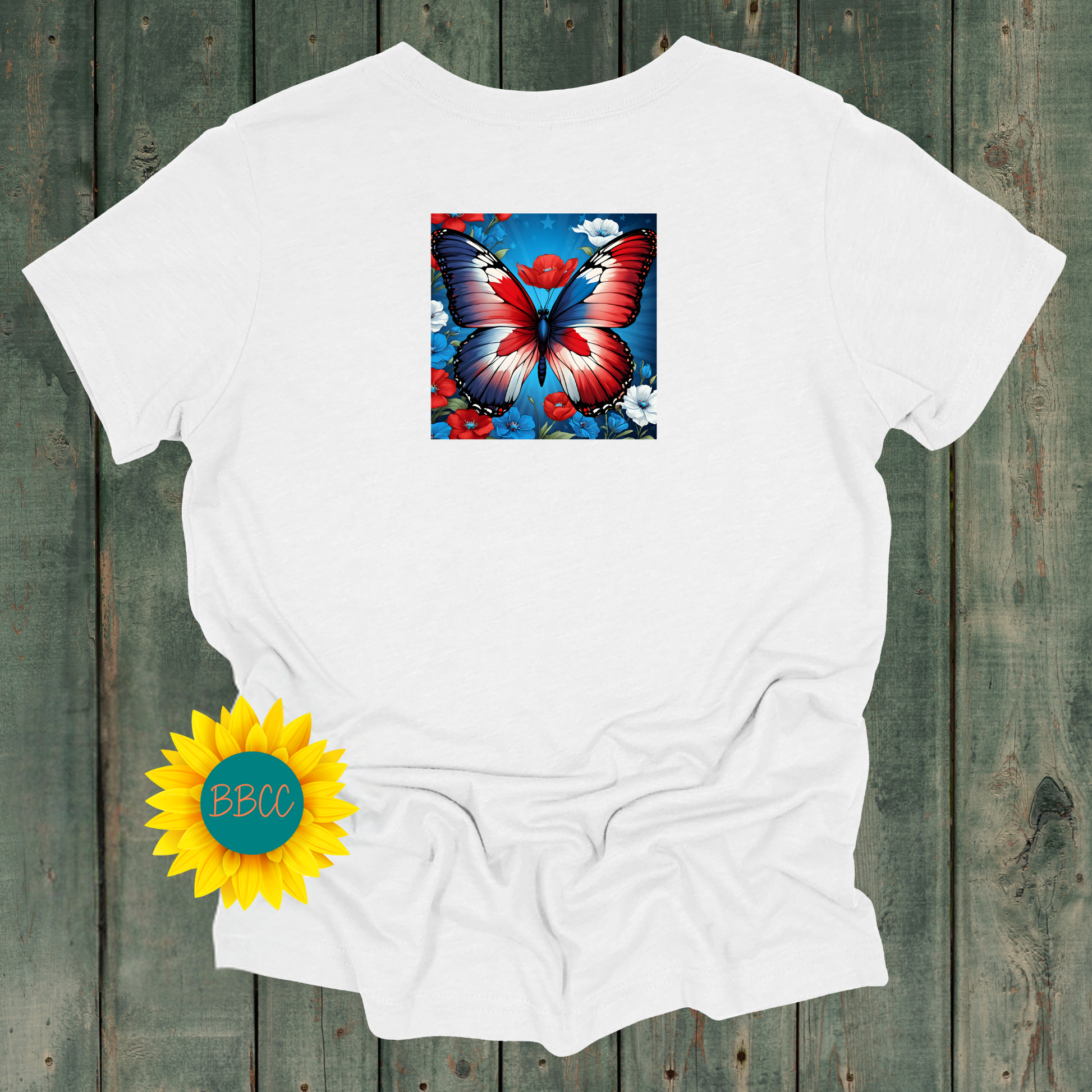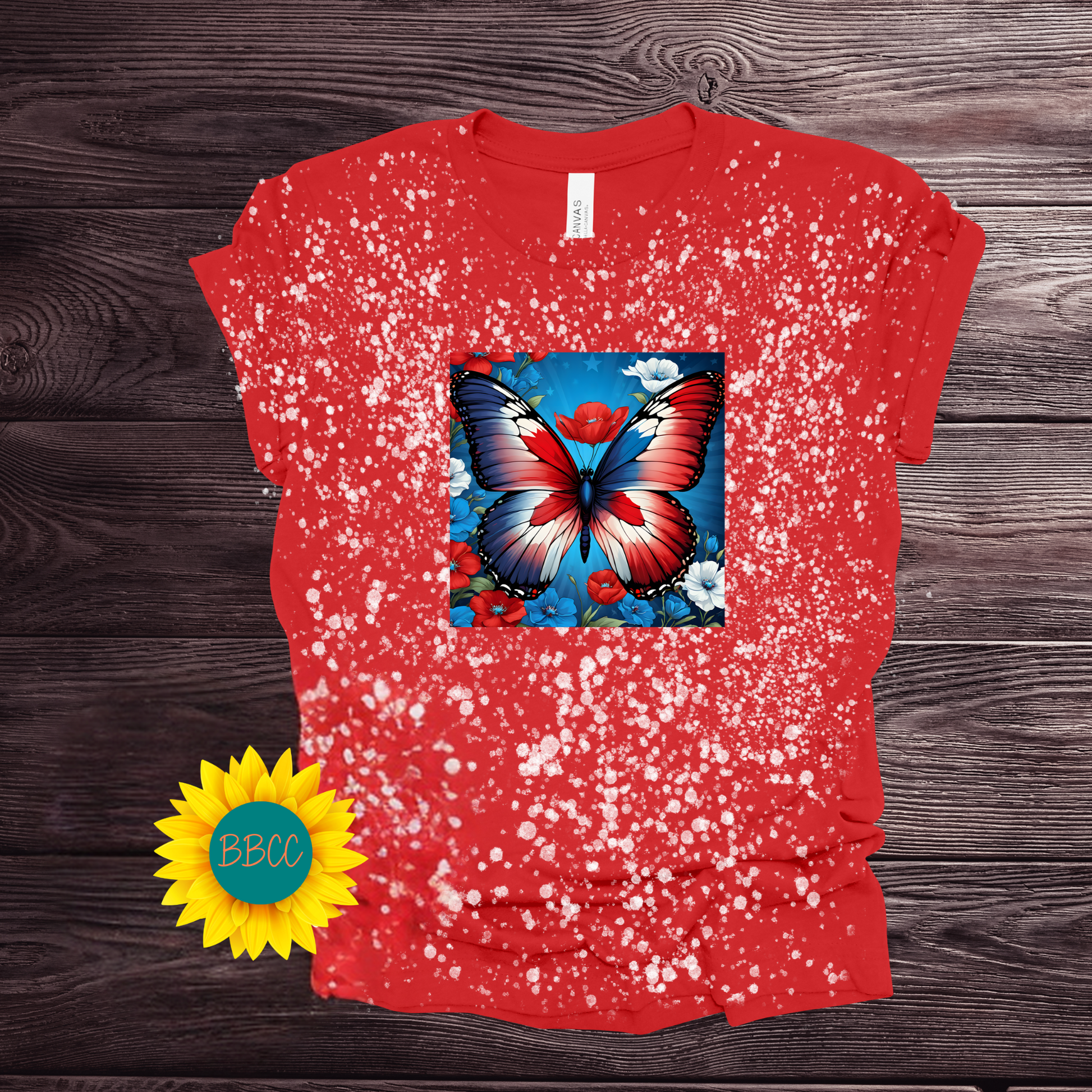 Make a statement with our vibrant Butterfly T-shirt, featuring a bold, colorful butterfly surrounded by lively flowers. Available in red, white, and blue, the red and blue options come with a one-of-a-kind bleached effect on the red and the blue for extra flair. Perfect for expressing your quirky and fun side!