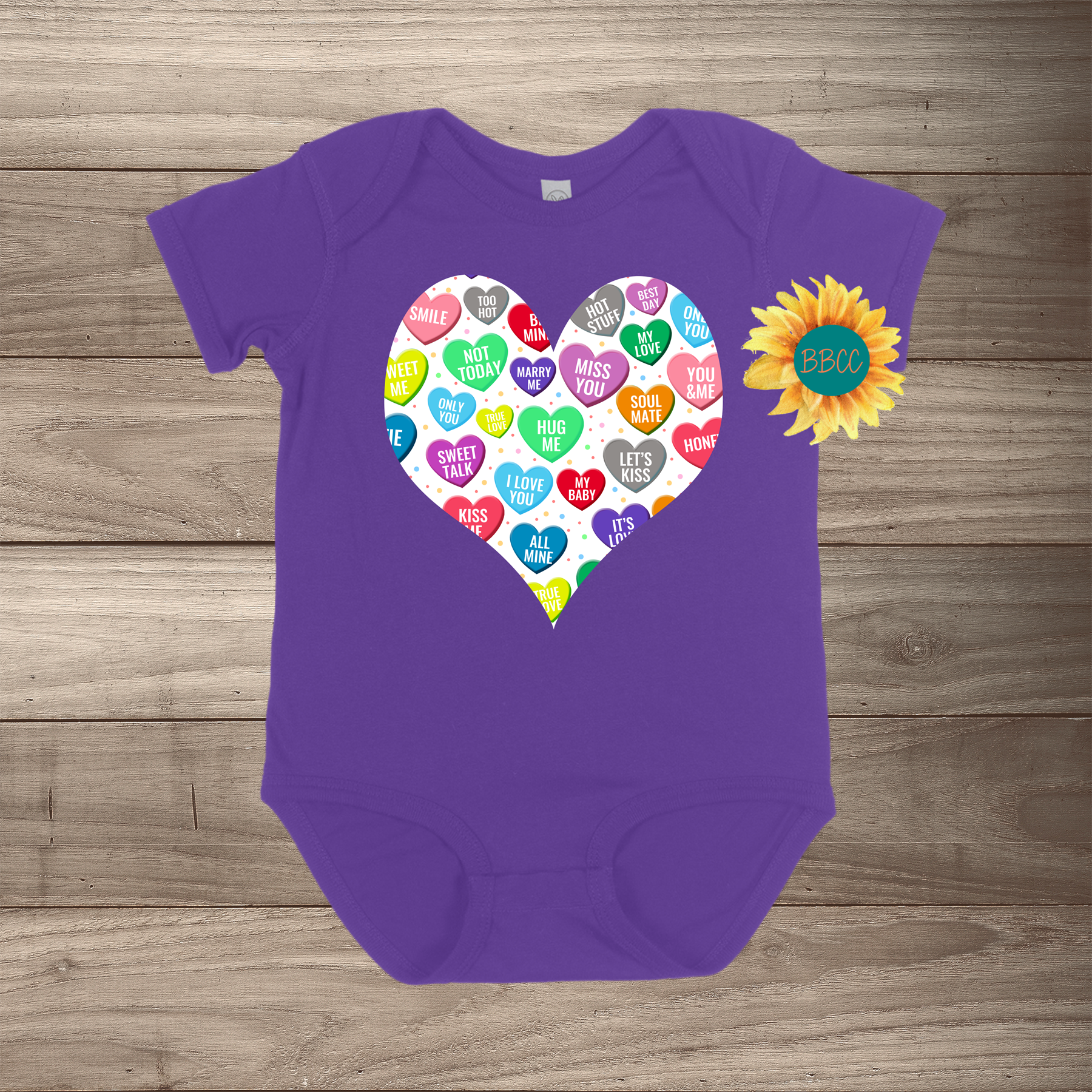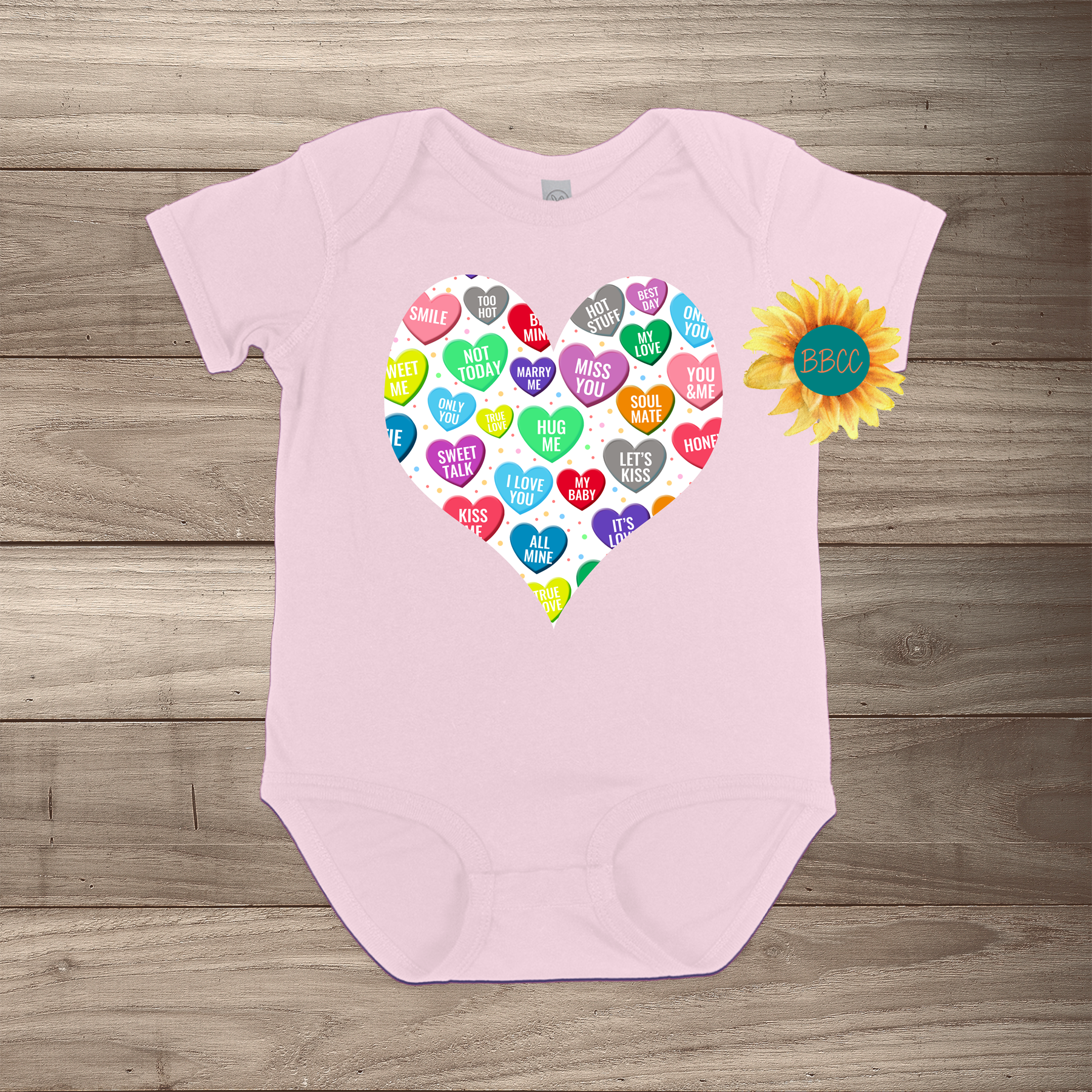 This adorable Candy Hearts Short Sleeve Romper features colorful candy conversation hearts on a white heart with playful polka dots. Available in sizes up to 24 months and multiple colors, it’s the perfect blend of cute and comfortable for your little one. Keep them stylish and cozy in this sweet onesie!