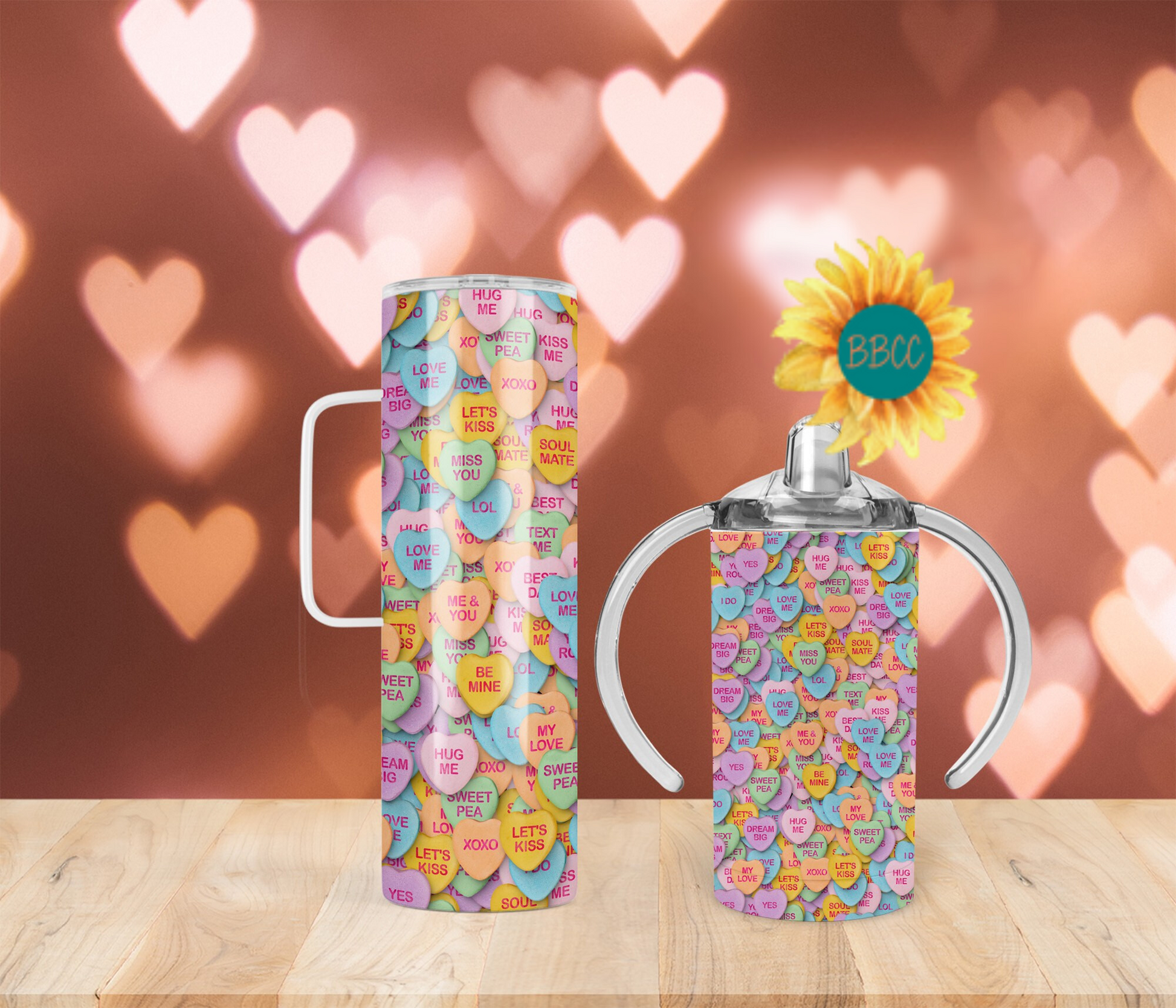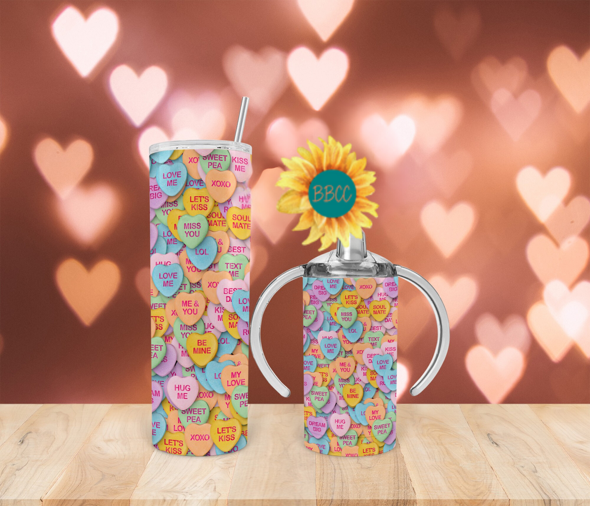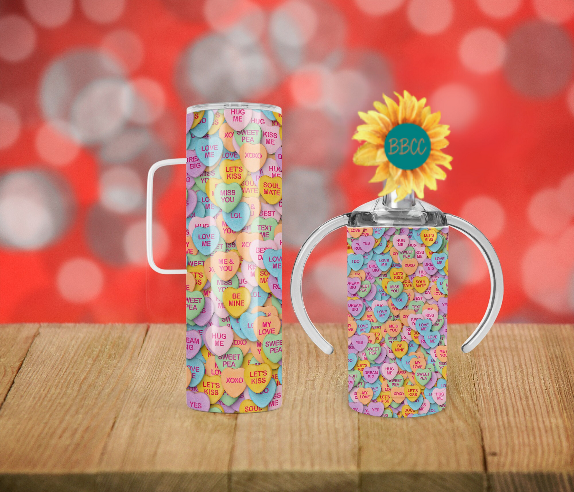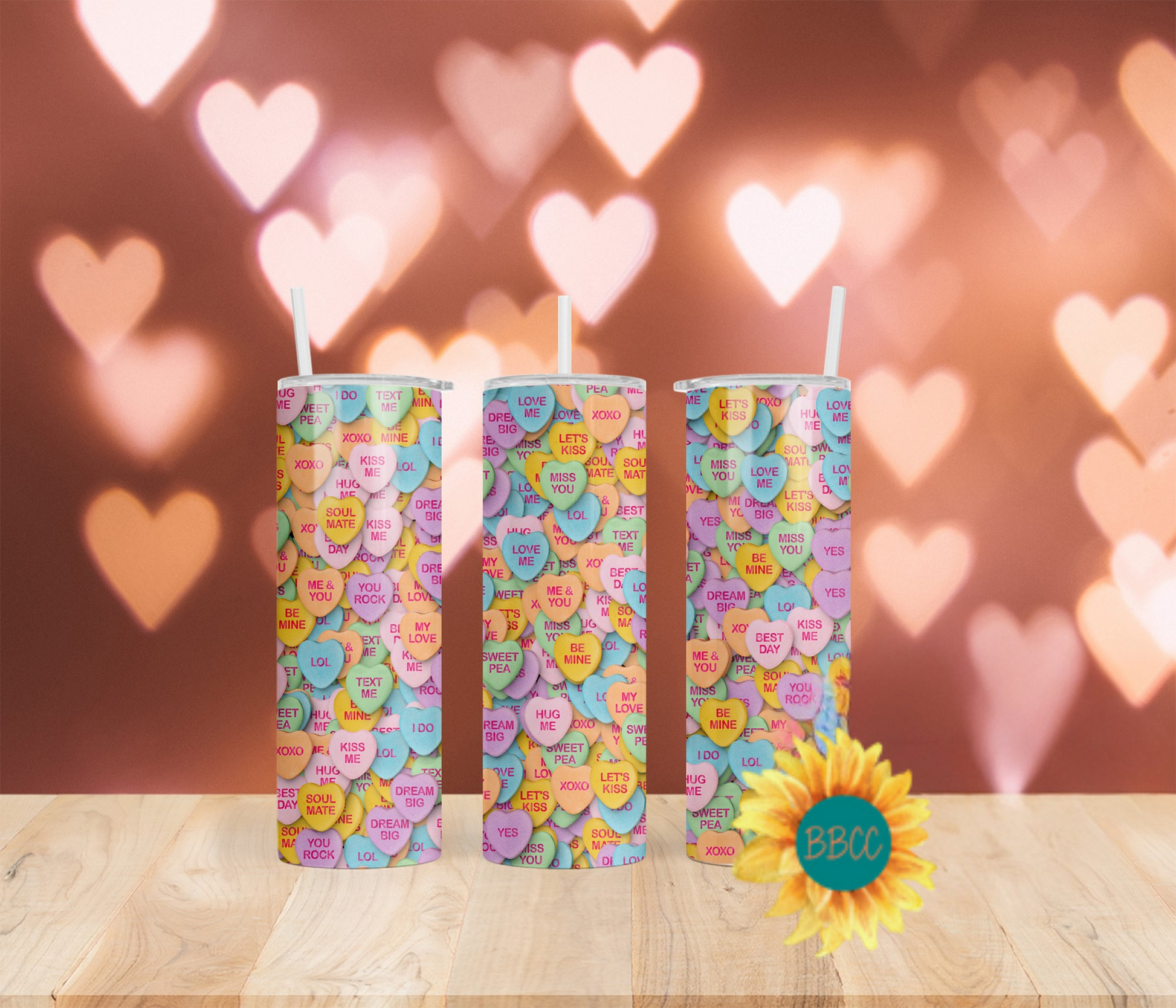 Immerse yourself in the sweetness of our Candy Hearts Tumbler, available in a variety of sizes and combinations. Each tumbler is adorned with playful conversation hearts, adding a fun, whimsical touch to your daily hydration routine. Stay hydrated in style with these charming and cheerful tumblers!