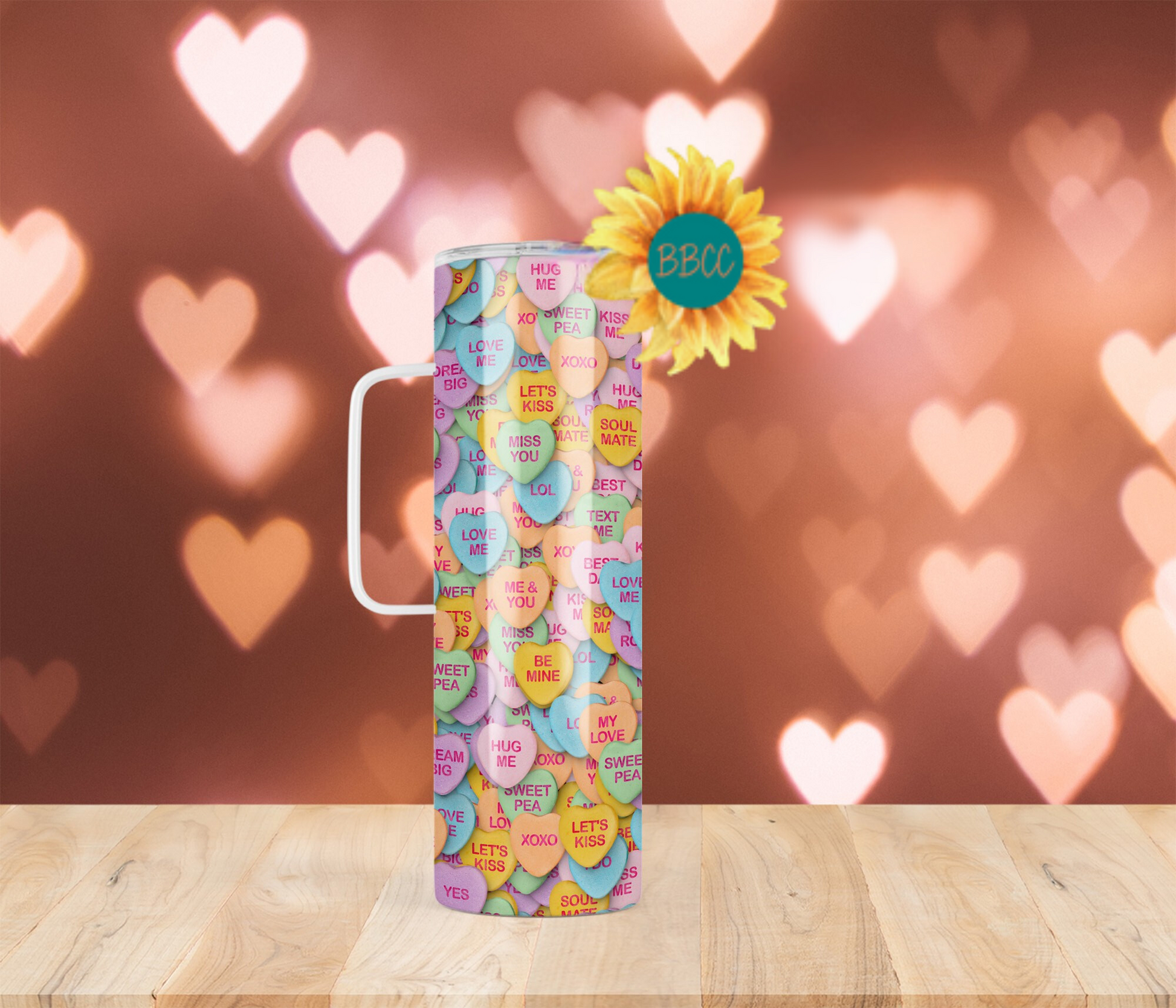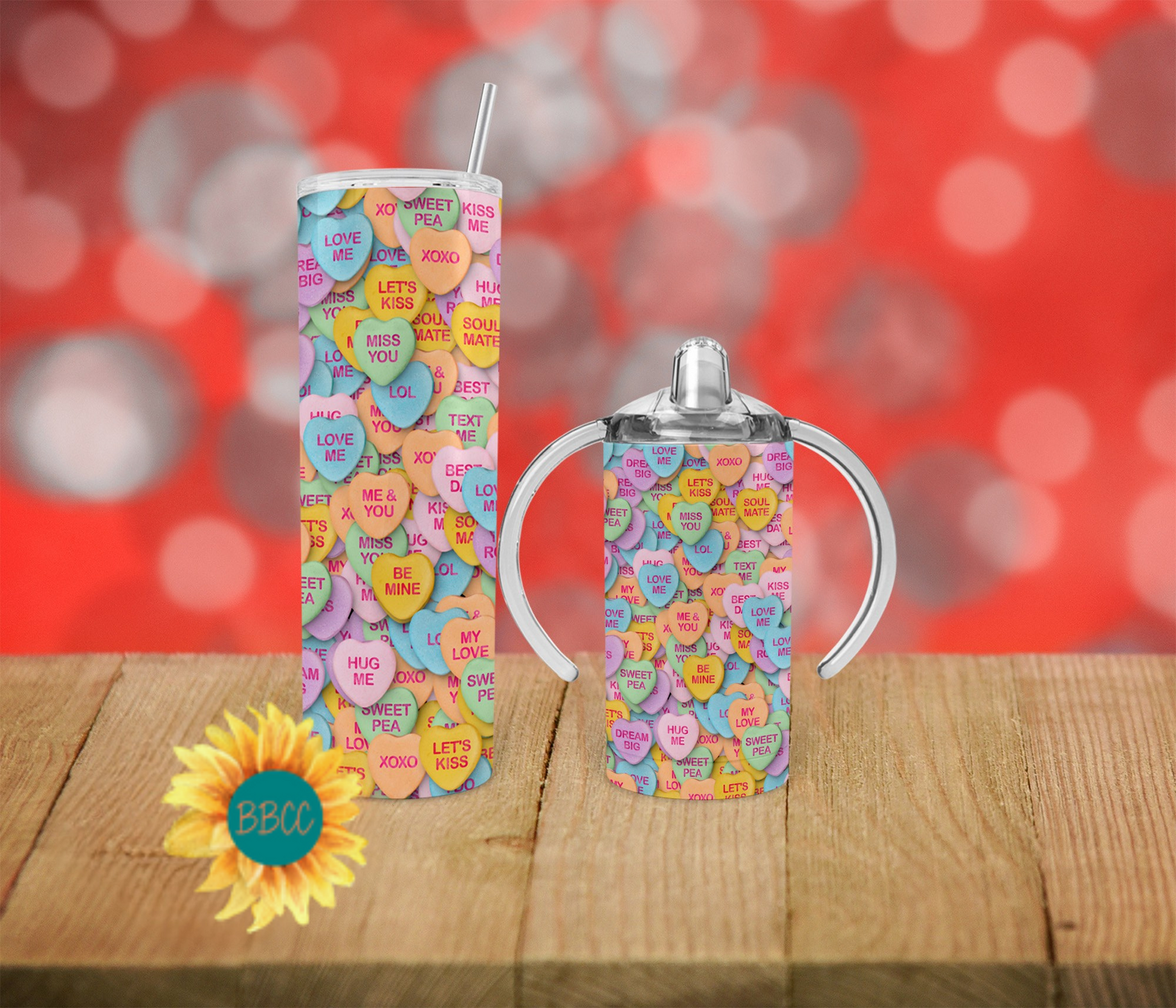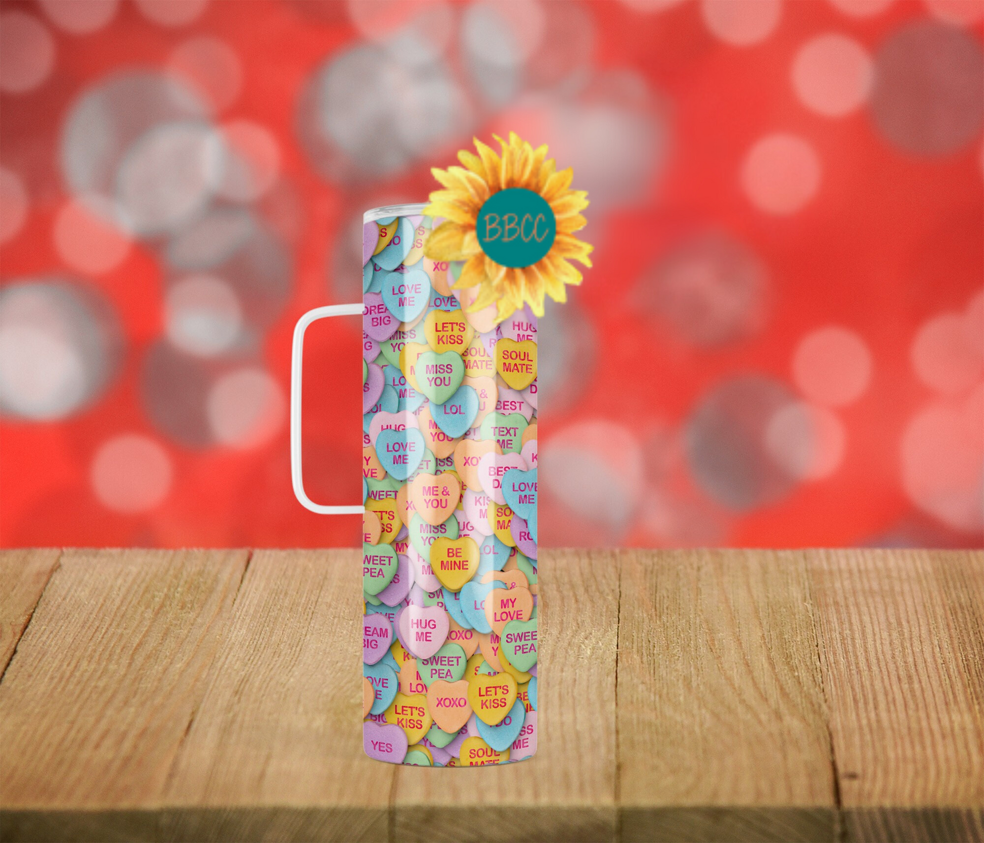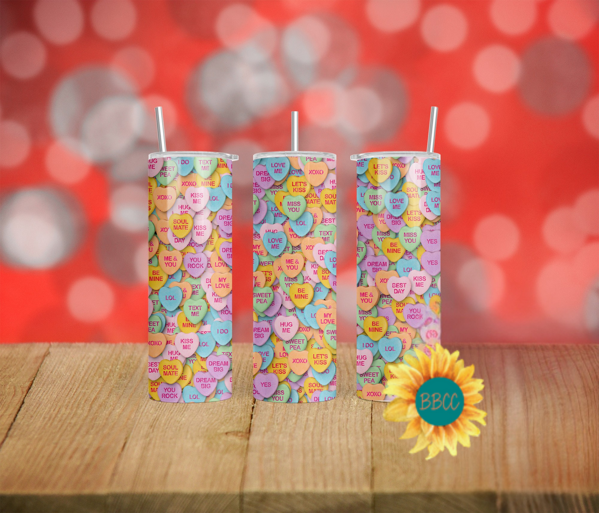 Immerse yourself in the sweetness of our Candy Hearts Tumbler, available in a variety of sizes and combinations. Each tumbler is adorned with playful conversation hearts, adding a fun, whimsical touch to your daily hydration routine. Stay hydrated in style with these charming and cheerful tumblers!
