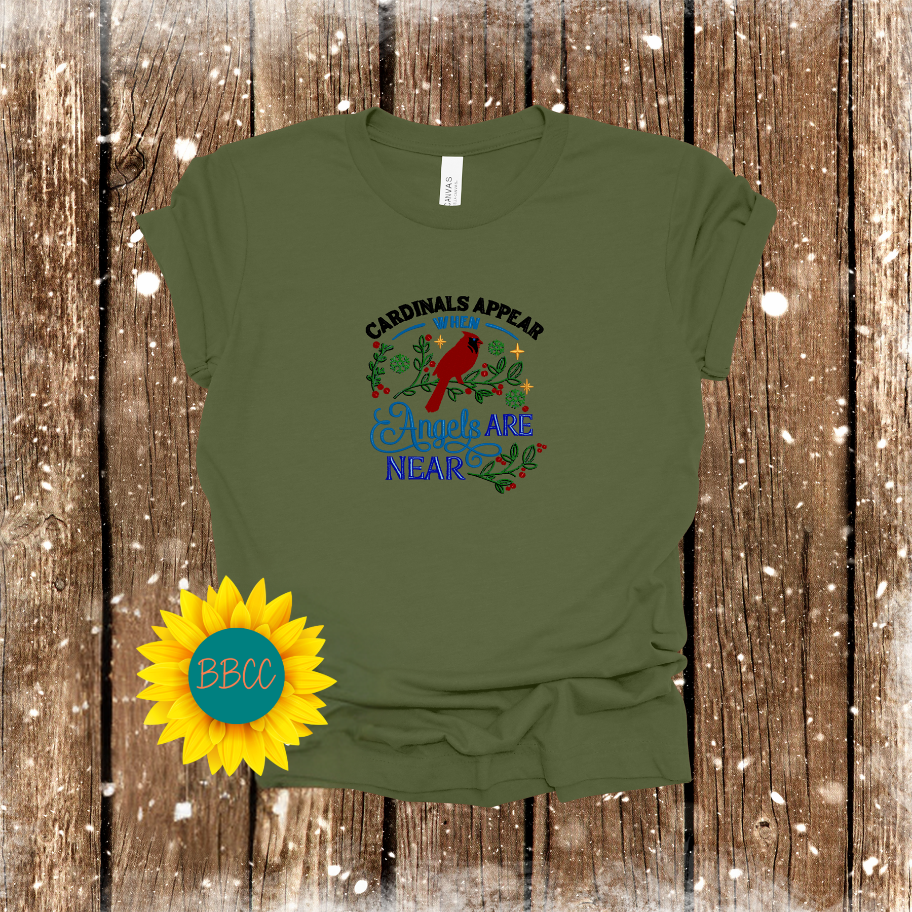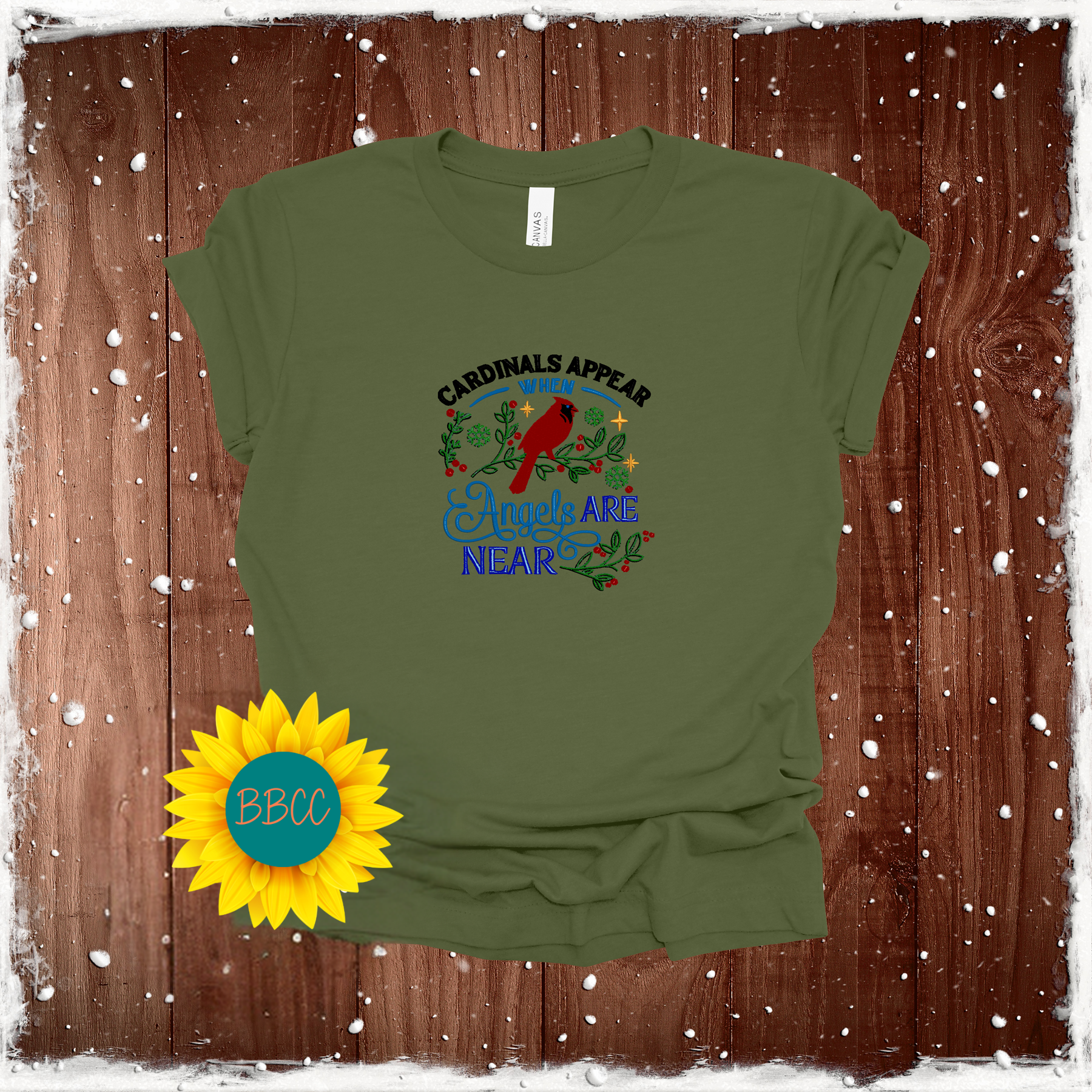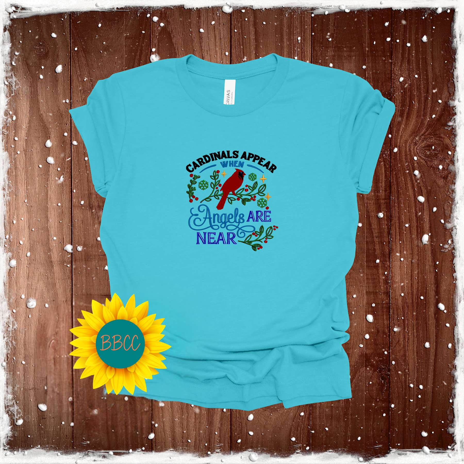 Available in ash, turquoise, red, and olive, this whimsical tee showcases a vibrant cardinal perched on a branch, accompanied by the heartwarming phrase, "Cardinals appear when angels are near." A perfect blend of nature and spirituality, this shirt is your go-to for expressing love for both. Let your spirit fly high in this charming, nature-inspired tee!