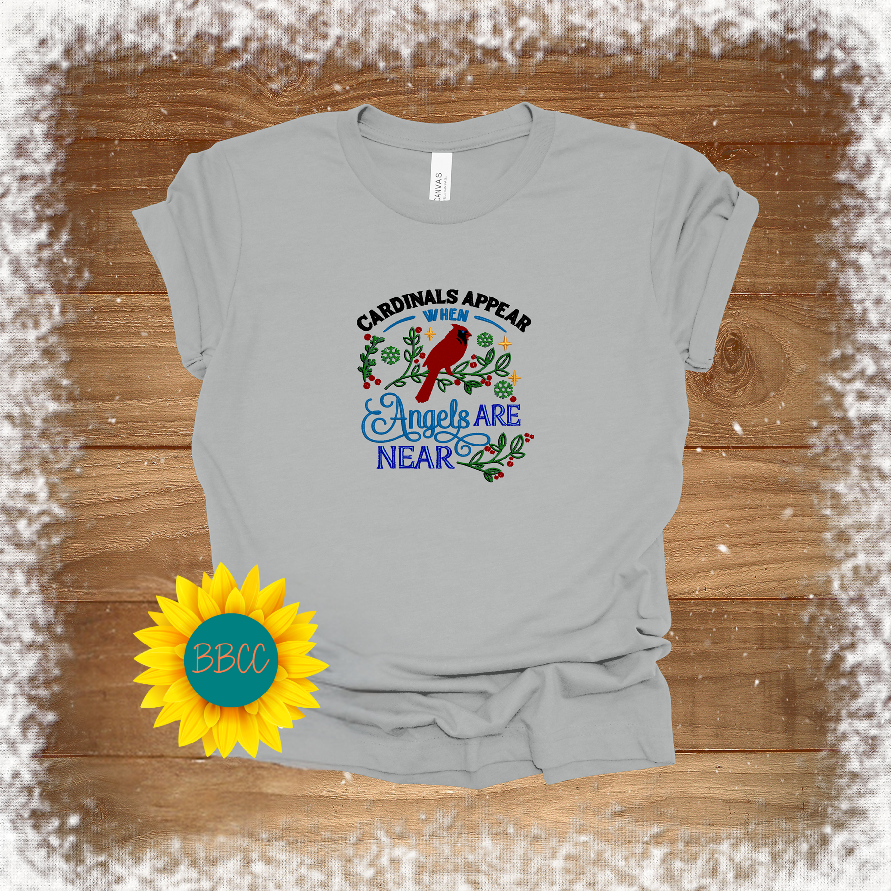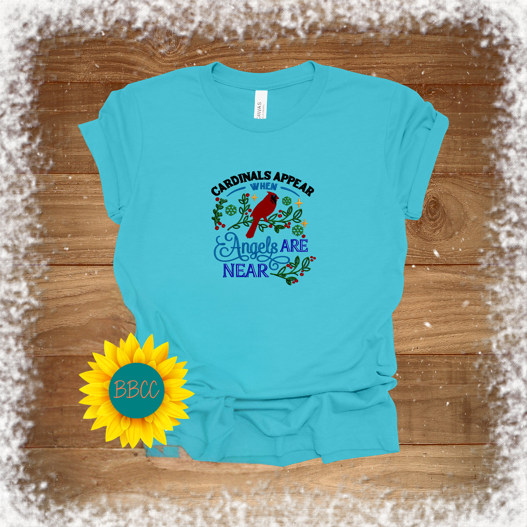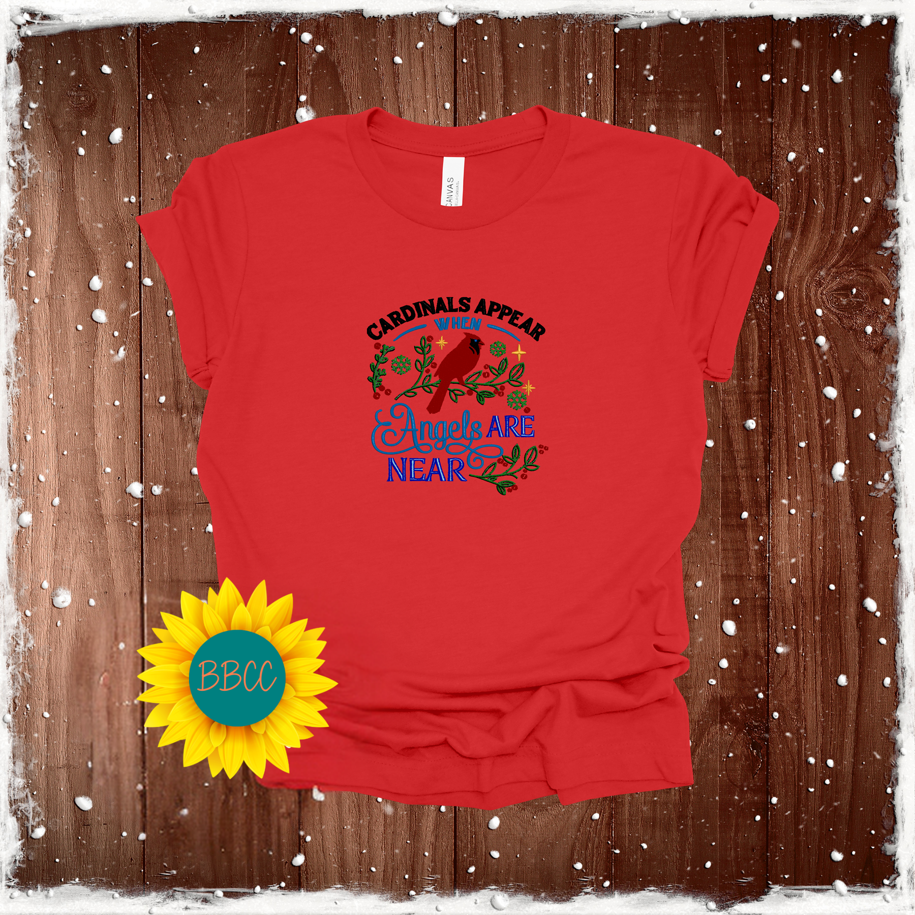 Available in ash, turquoise, red, and olive, this whimsical tee showcases a vibrant cardinal perched on a branch, accompanied by the heartwarming phrase, "Cardinals appear when angels are near." A perfect blend of nature and spirituality, this shirt is your go-to for expressing love for both. Let your spirit fly high in this charming, nature-inspired tee!