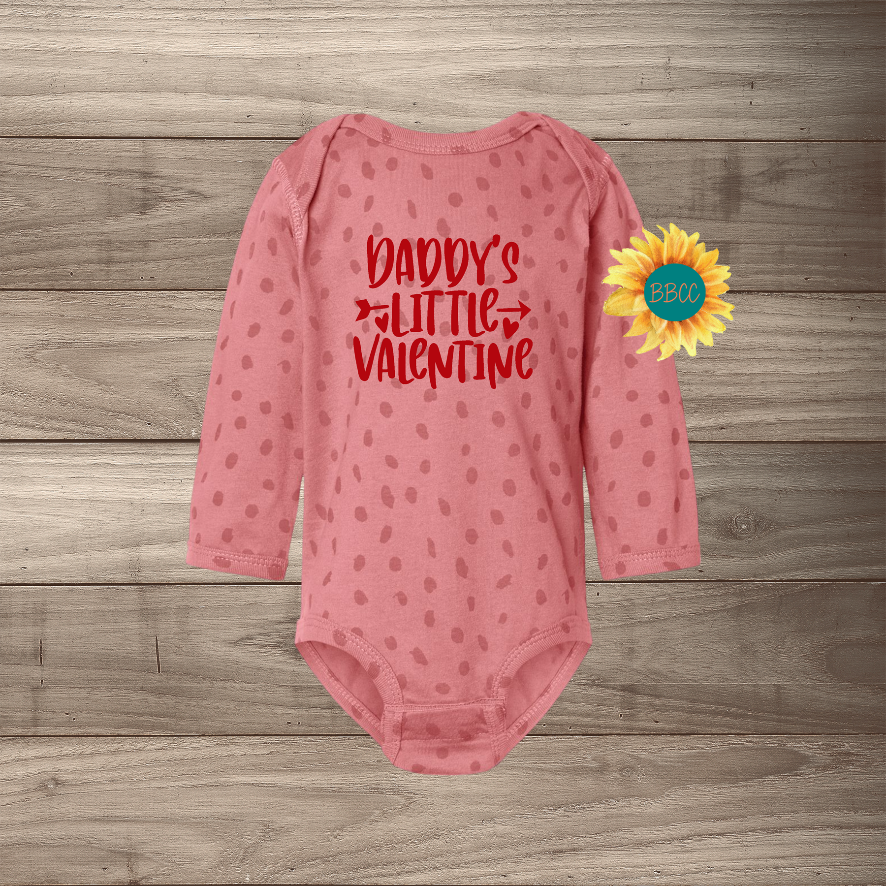 This adorable jumpsuit proudly proclaims your little one as Daddy’s Little Valentine. Available in a variety of colors, including two with spotted fabric, and in sizes up to 18 months, it’s the perfect way to celebrate Valentine’s Day in style. Let your little one shine as the cutest valentine around!