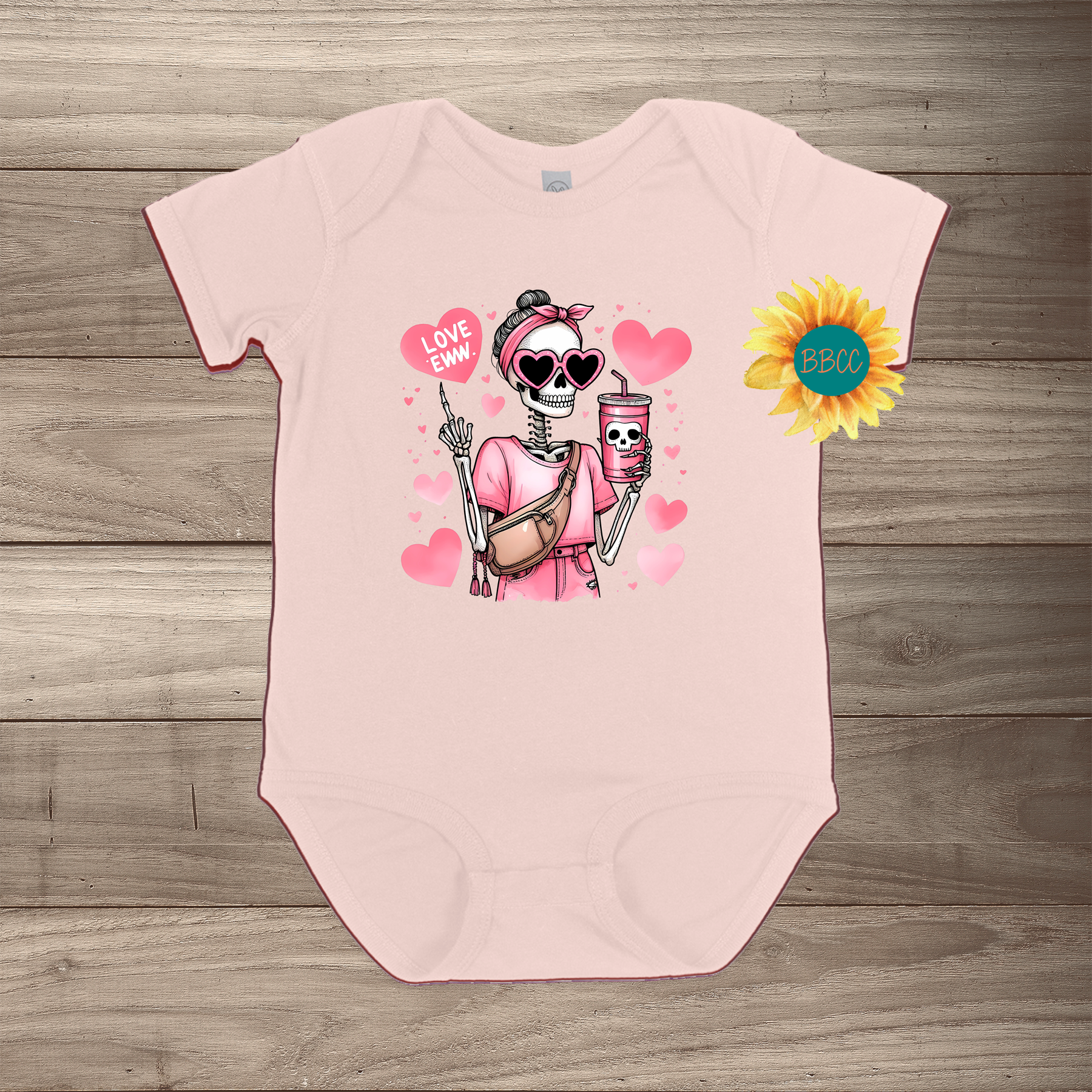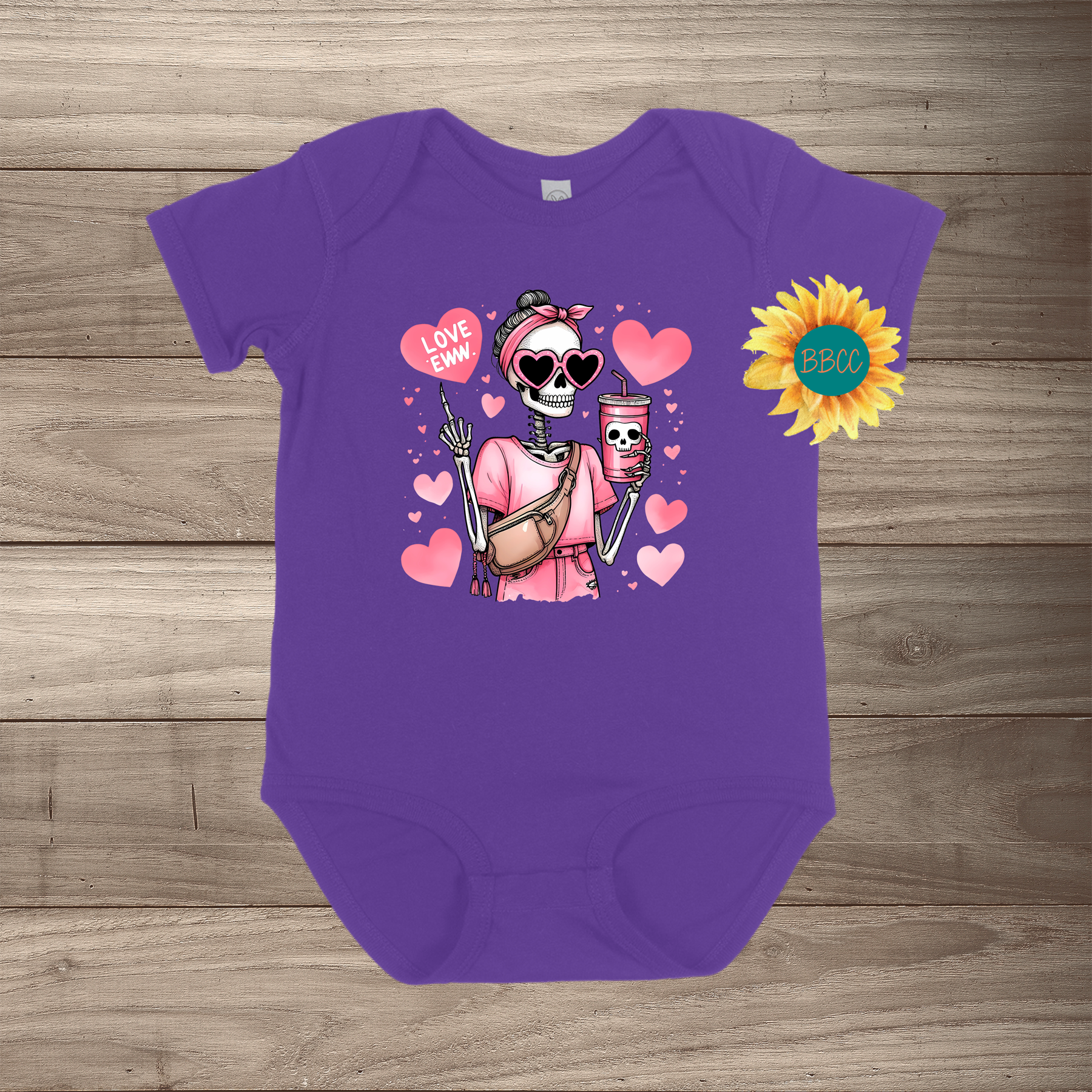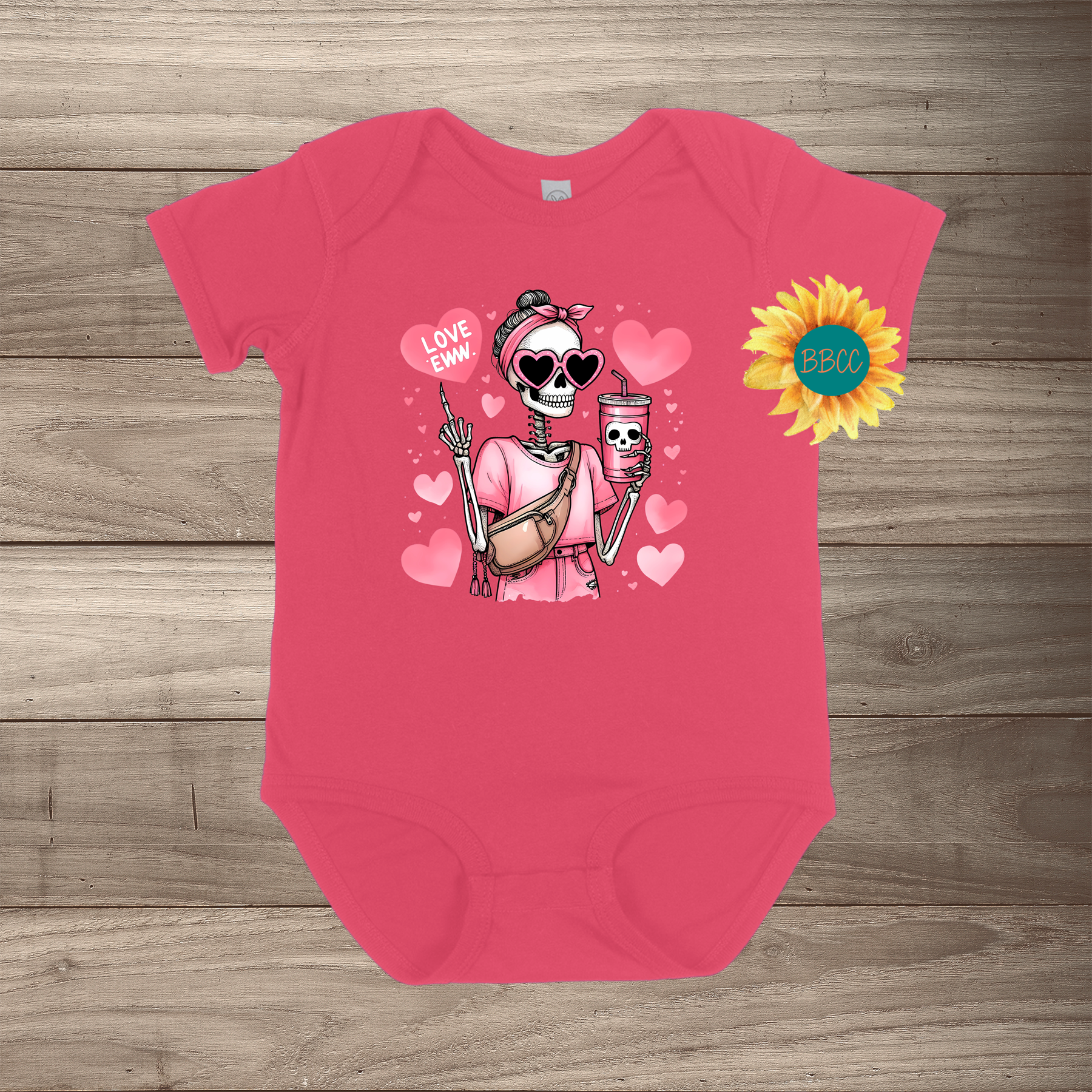 Dress your little one in style with our Eww Love Short Sleeve Romper, featuring an adorable skeleton holding a coffee cup with heart-shaped sunglasses, surrounded by playful pink hearts. It’s the perfect balance of edgy and cute! Available in a variety of colors and sizes up to 24 months, this romper will have your baby stealing the spotlight wherever they go.