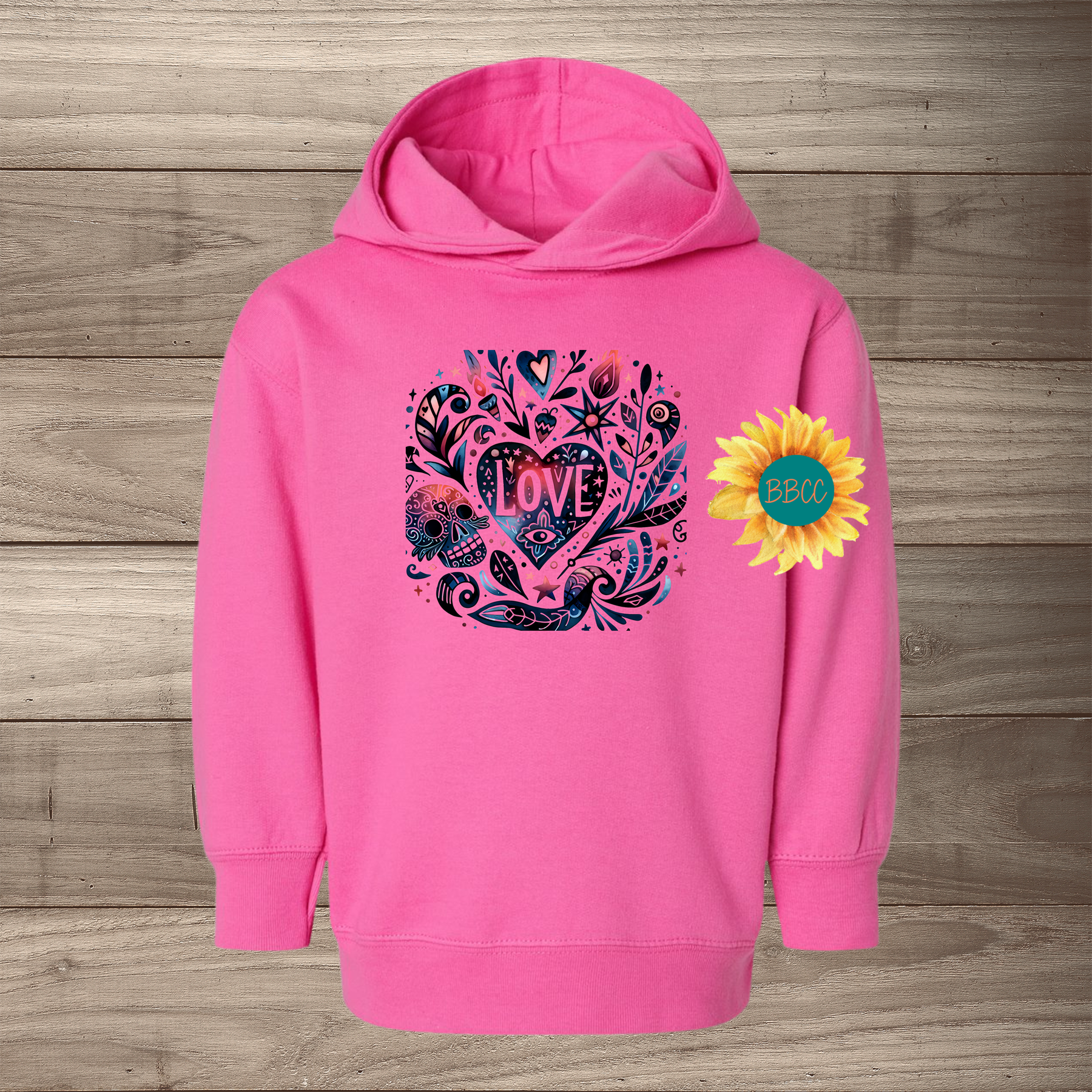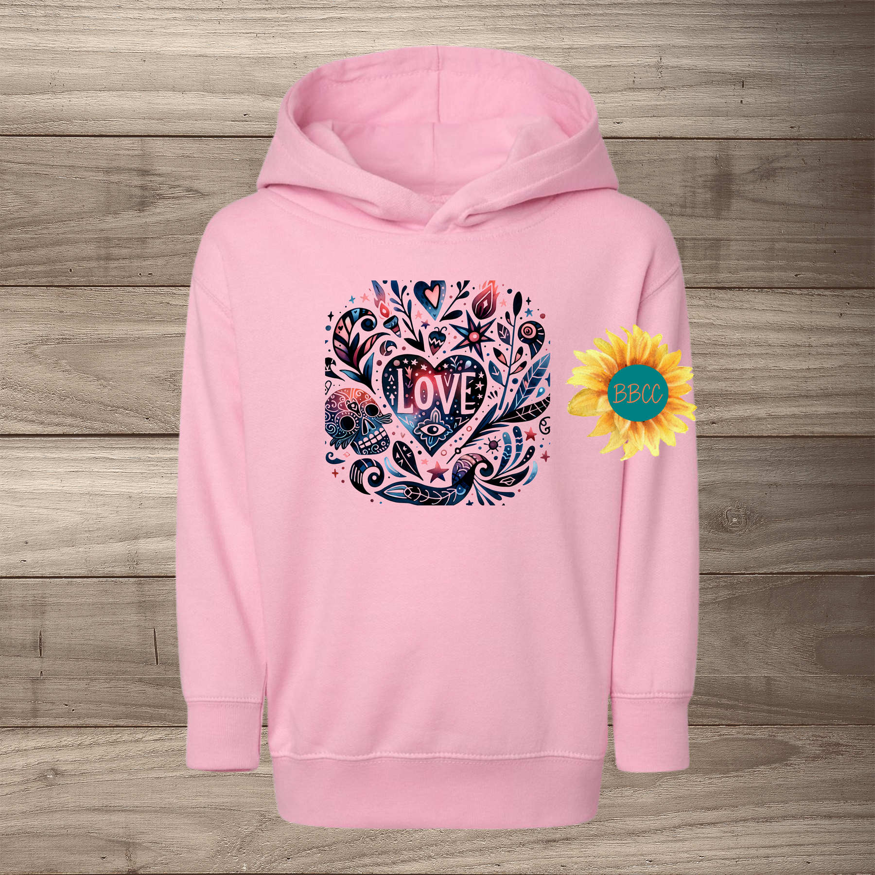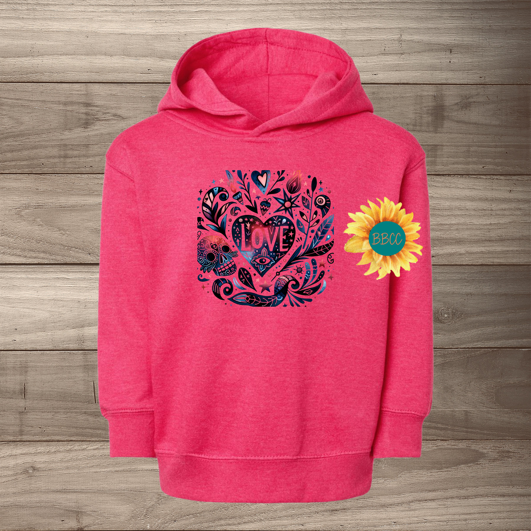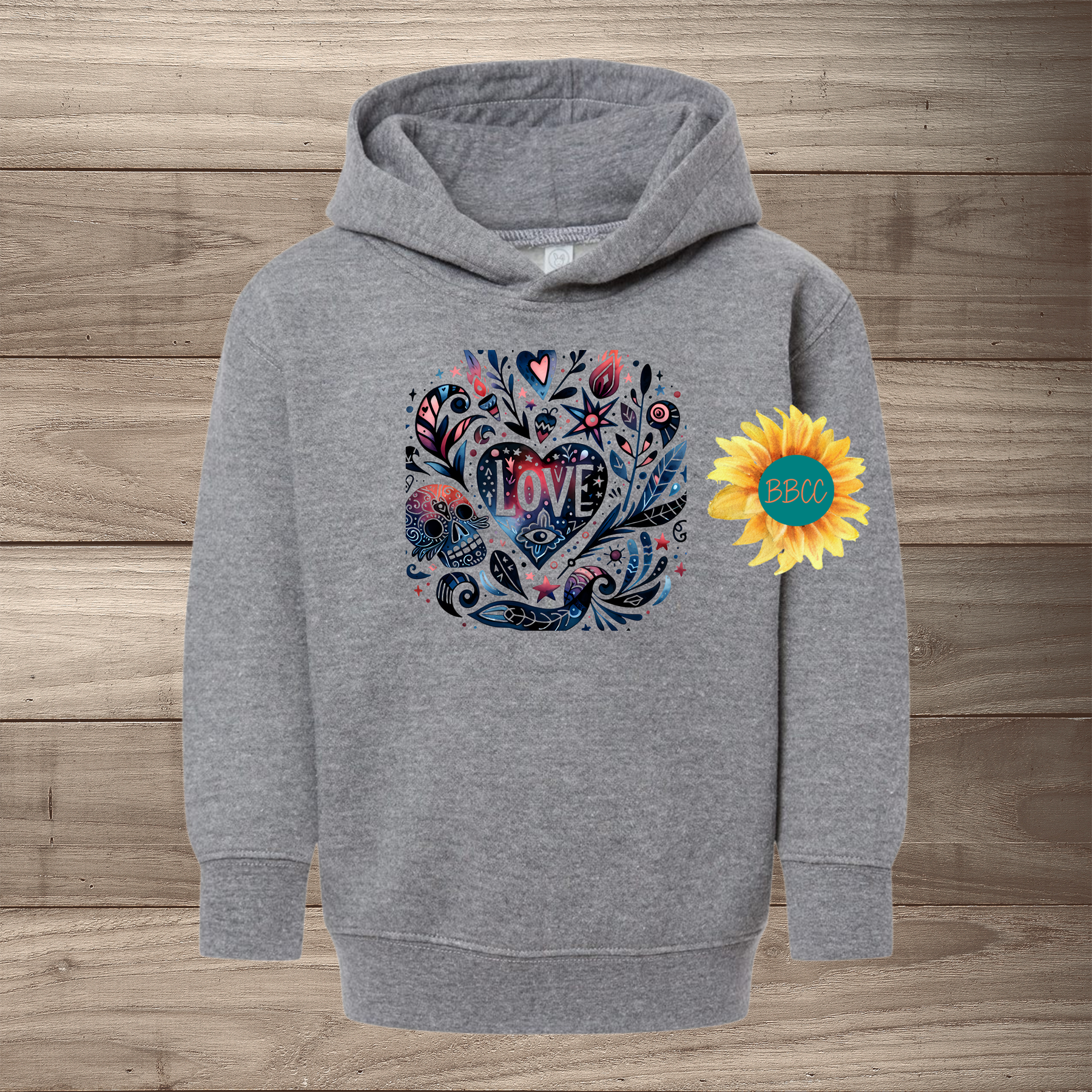 This stylish Fancy Love Hoodie features a unique design with a heart that incorporates the word LOVE, a sugar skull, and intricate decorative elements. Available in a variety of colors and sizes 2T, 4T and 5/6, it's perfect for adding a cute touch to any outfit. Express your love for fashion with this must-have hoodie.
