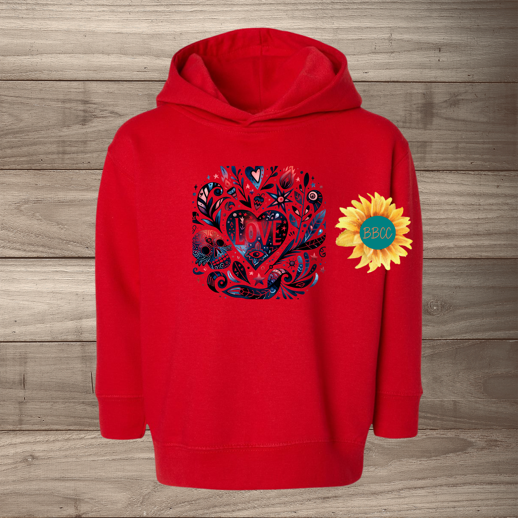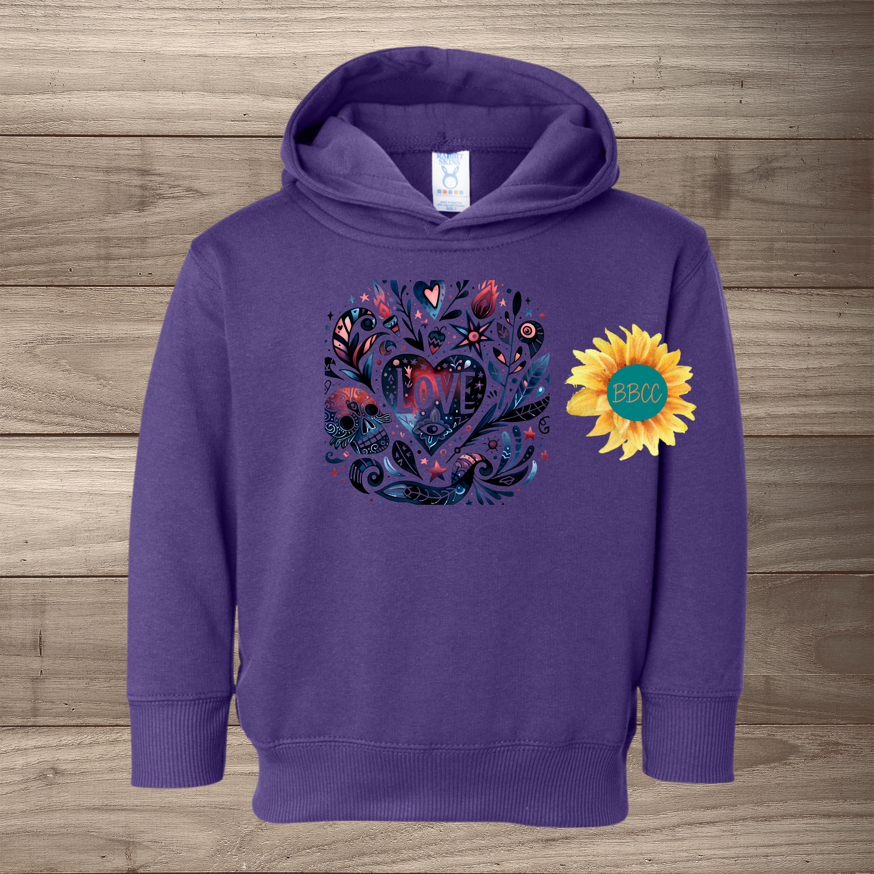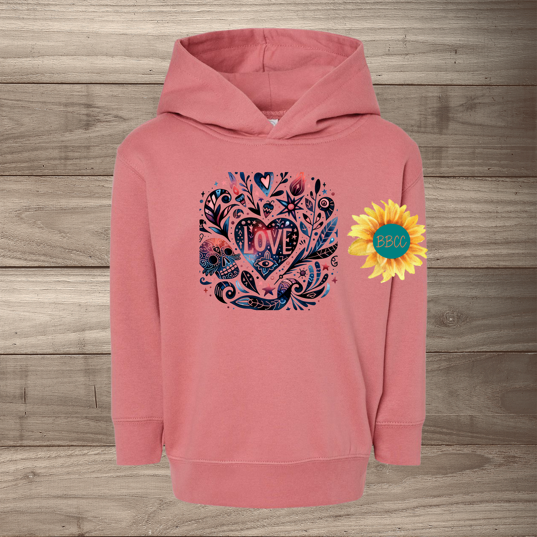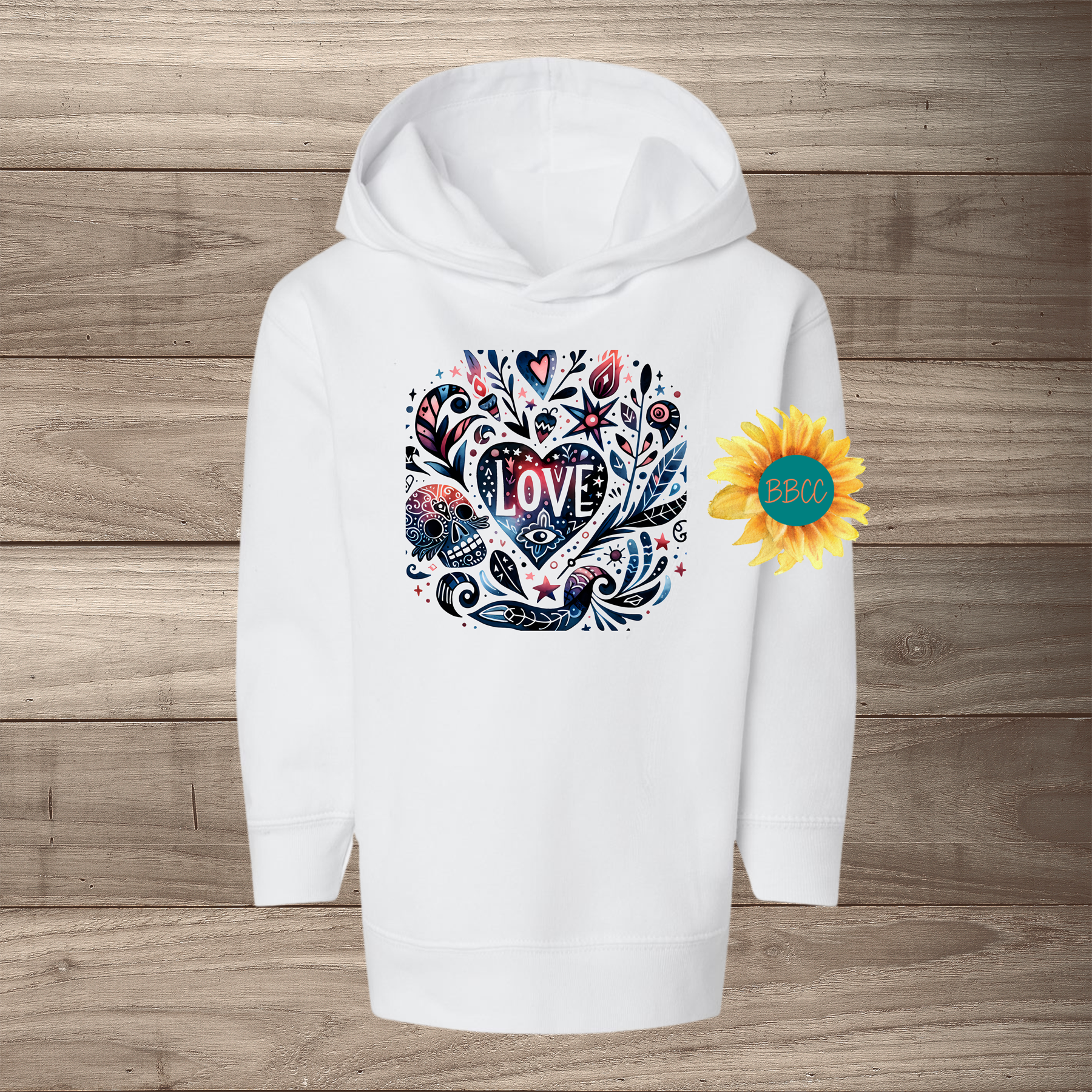 This stylish Fancy Love Hoodie features a unique design with a heart that incorporates the word LOVE, a sugar skull, and intricate decorative elements. Available in a variety of colors and sizes 2T, 4T and 5/6, it's perfect for adding a cute touch to any outfit. Express your love for fashion with this must-have hoodie.