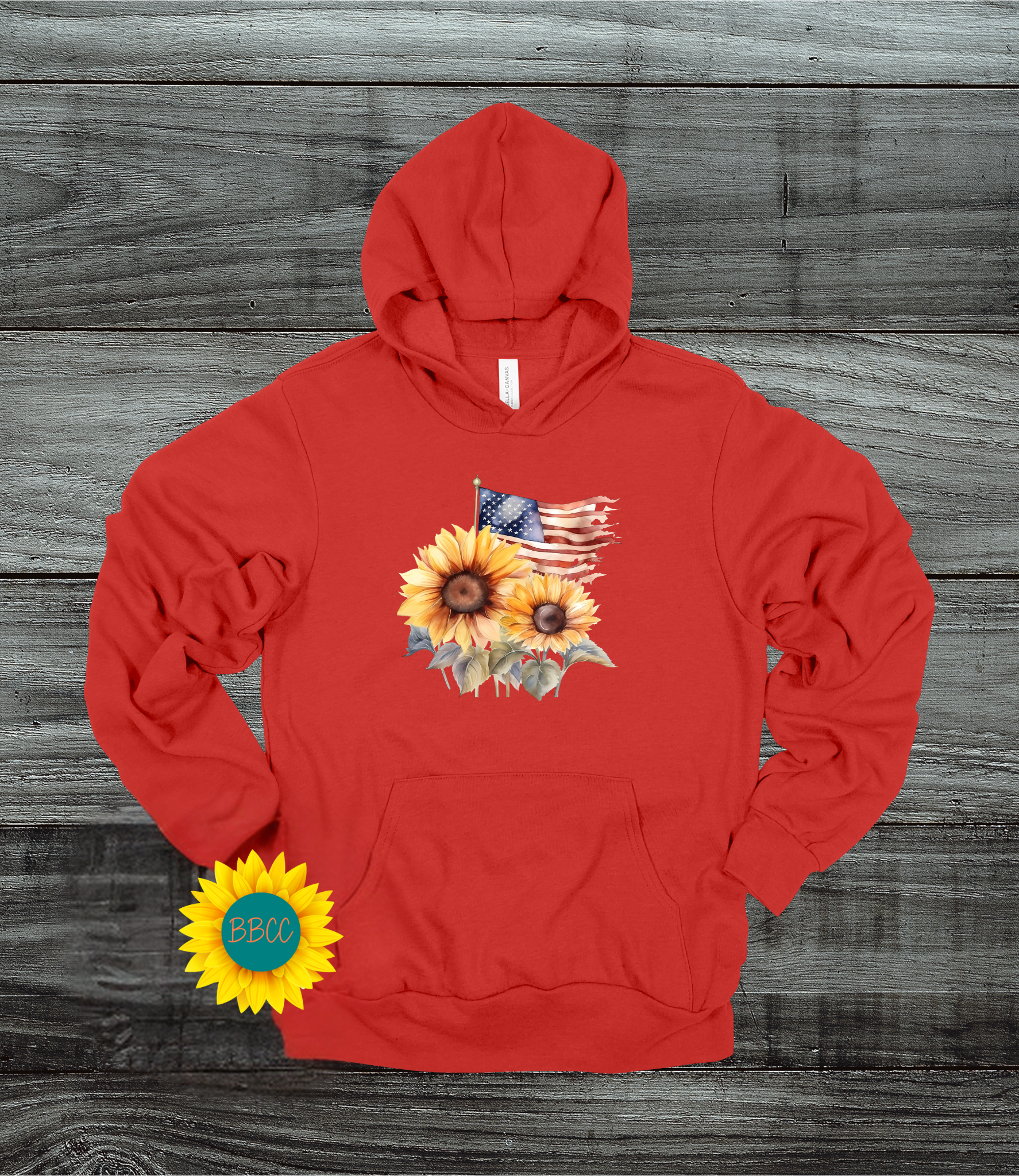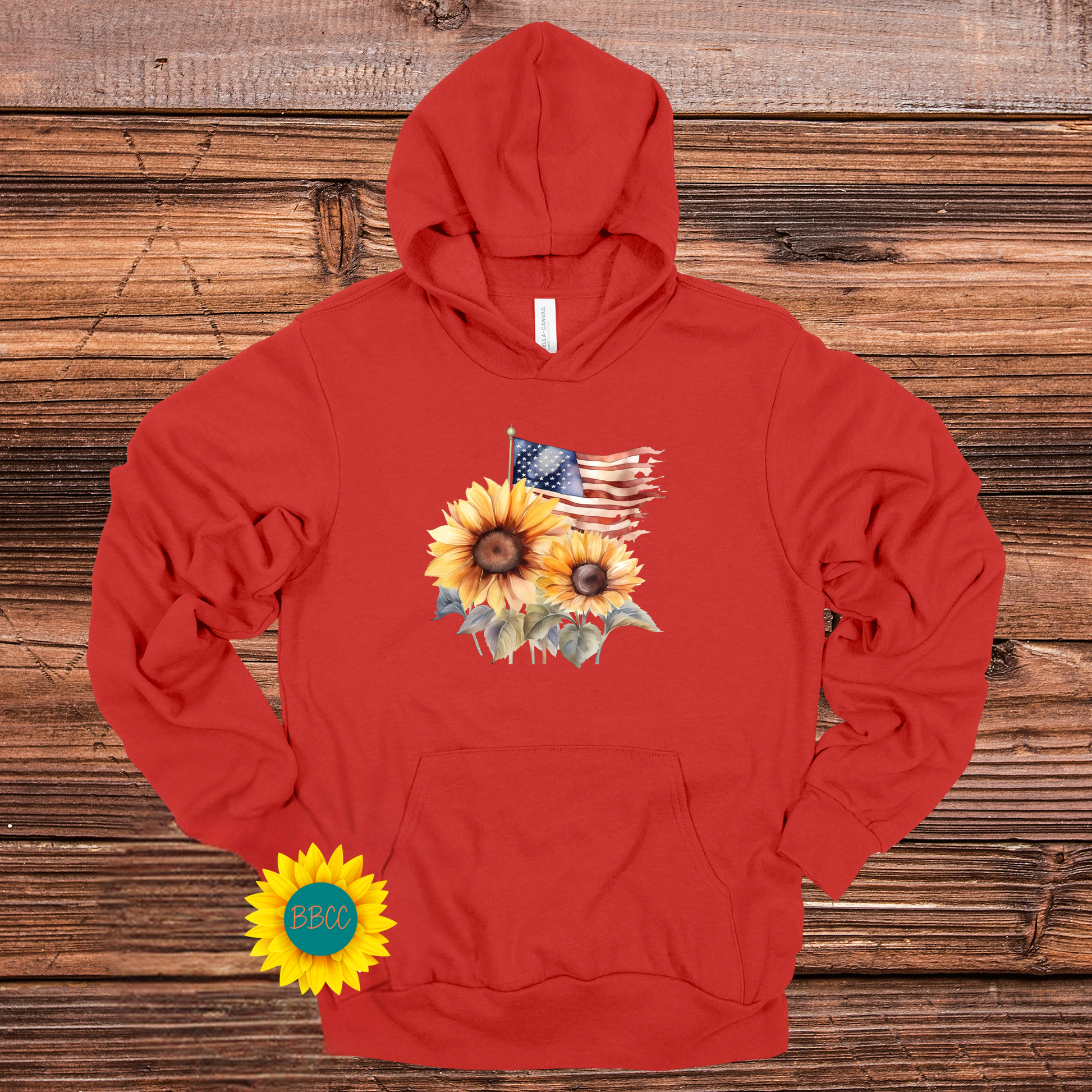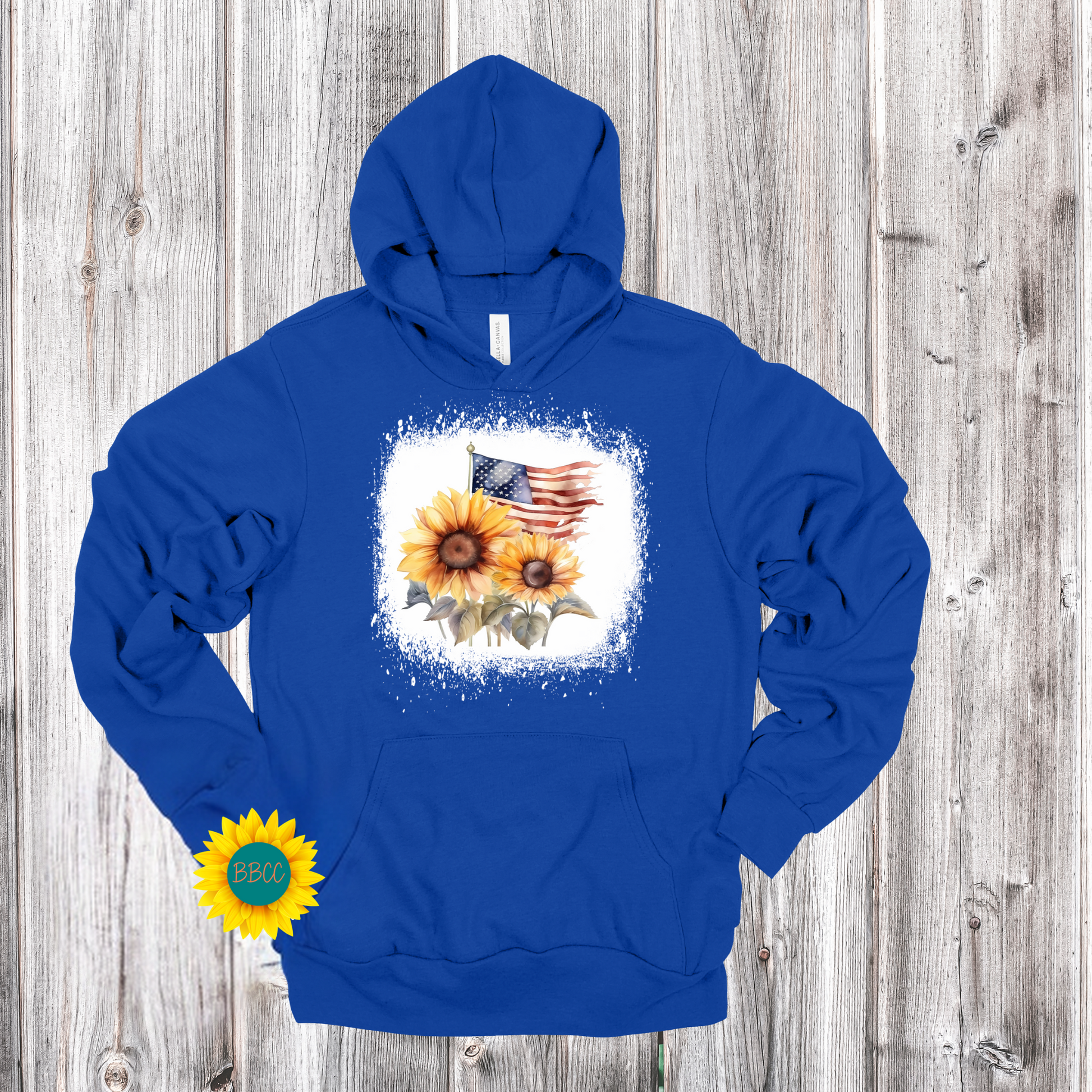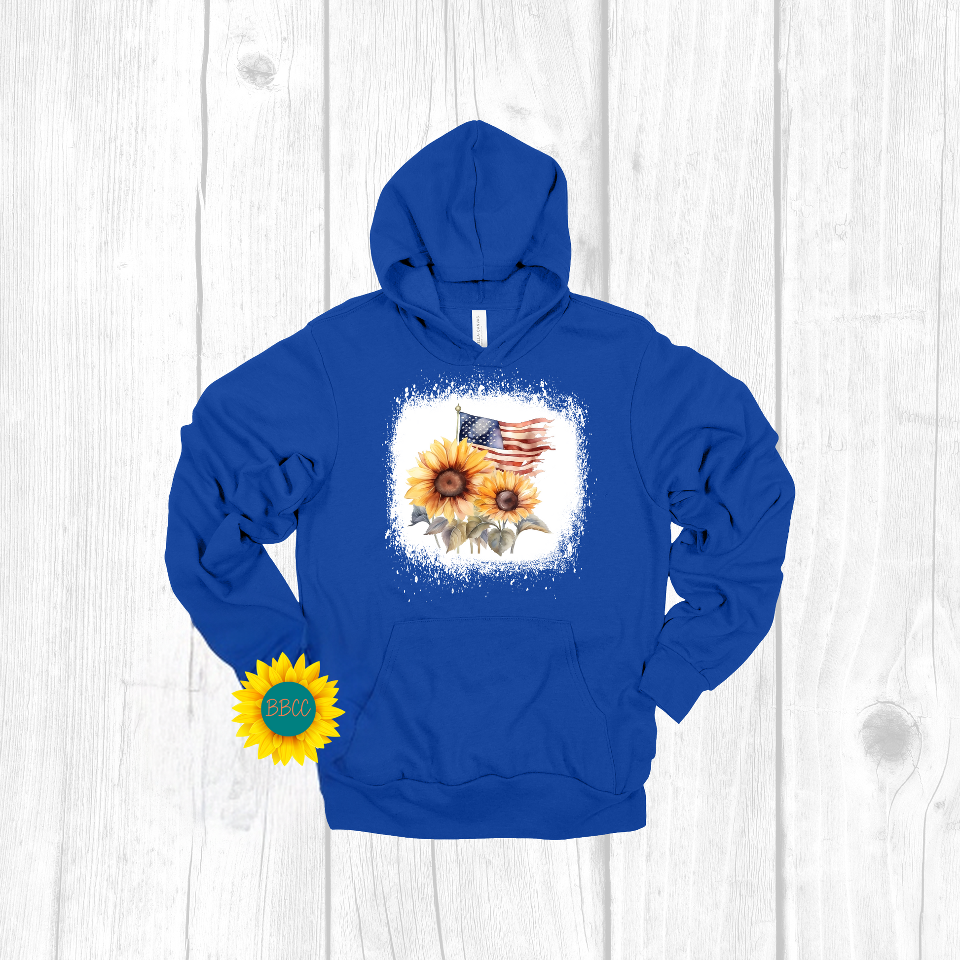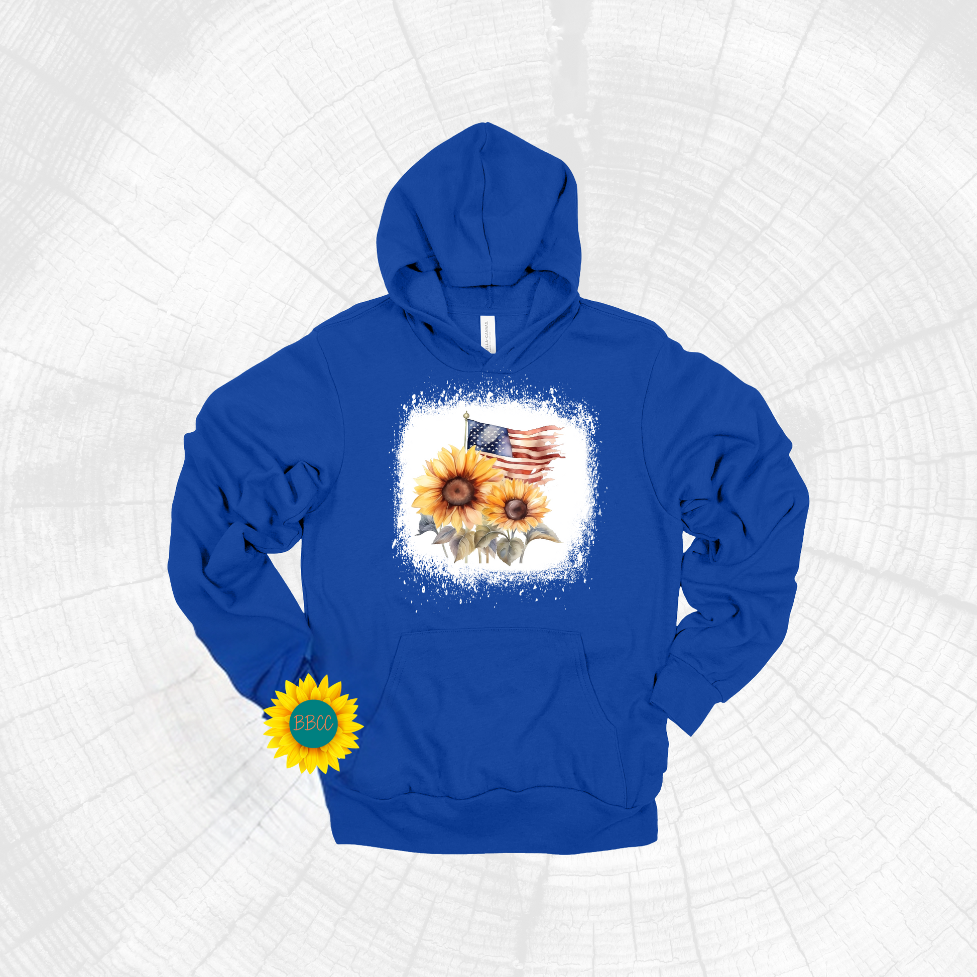 Love sunflowers and patriotism? The Flag Heart Hoodie is for you! With a tattered flag design and vibrant sunflowers, choose from red, white, or blue. The blue option even has a bleached area for a unique touch. Get ready to show off your quirky and fun style with this hoodie!