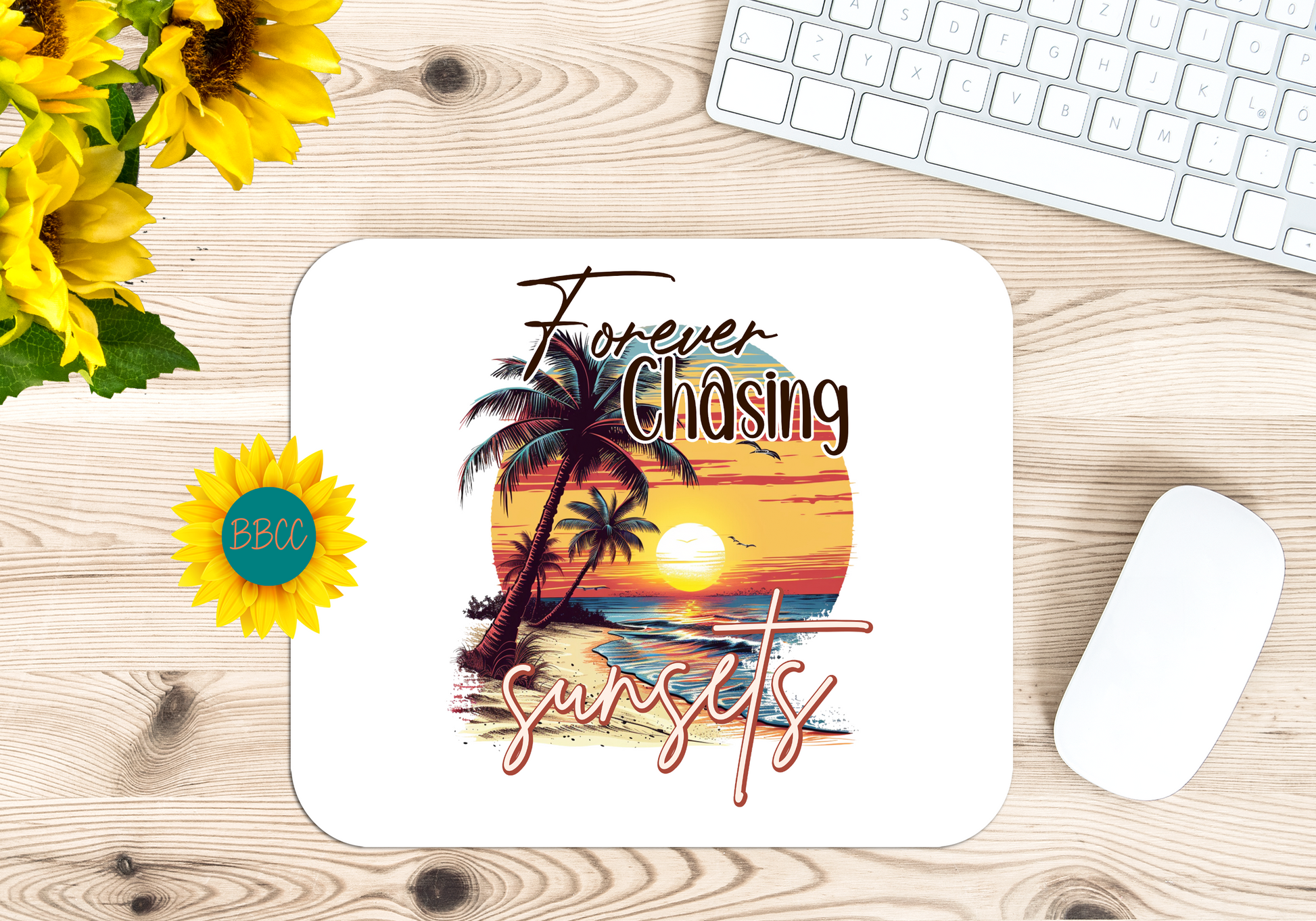 Add some coastal charm to your desk with this dreamy sunset mousepad. Featuring a vibrant tropical beach scene and the phrase "Forever Chasing Sunsets," it's perfect for sunset lovers, wanderlusters, and those who crave golden hour vibes all day long.