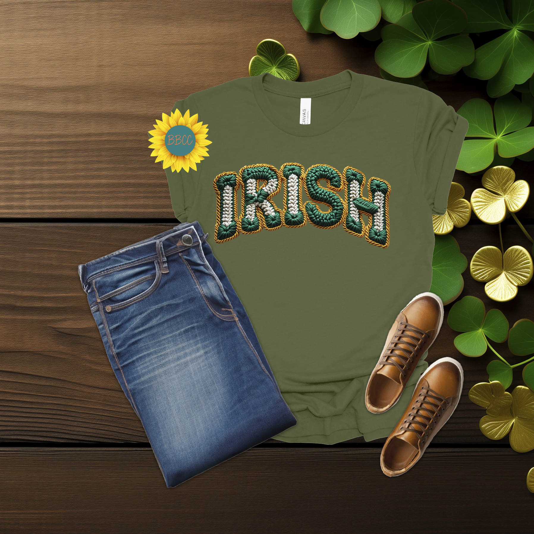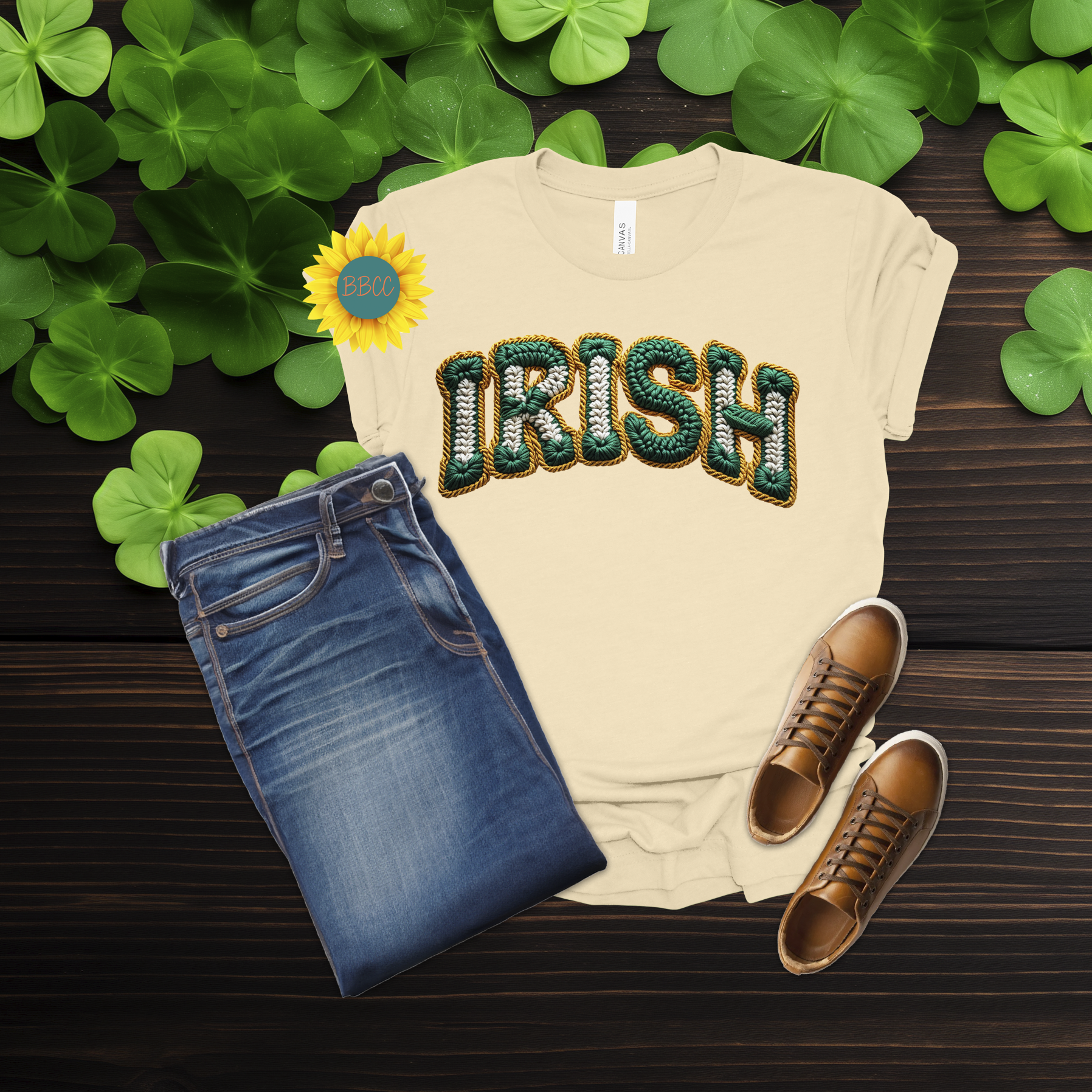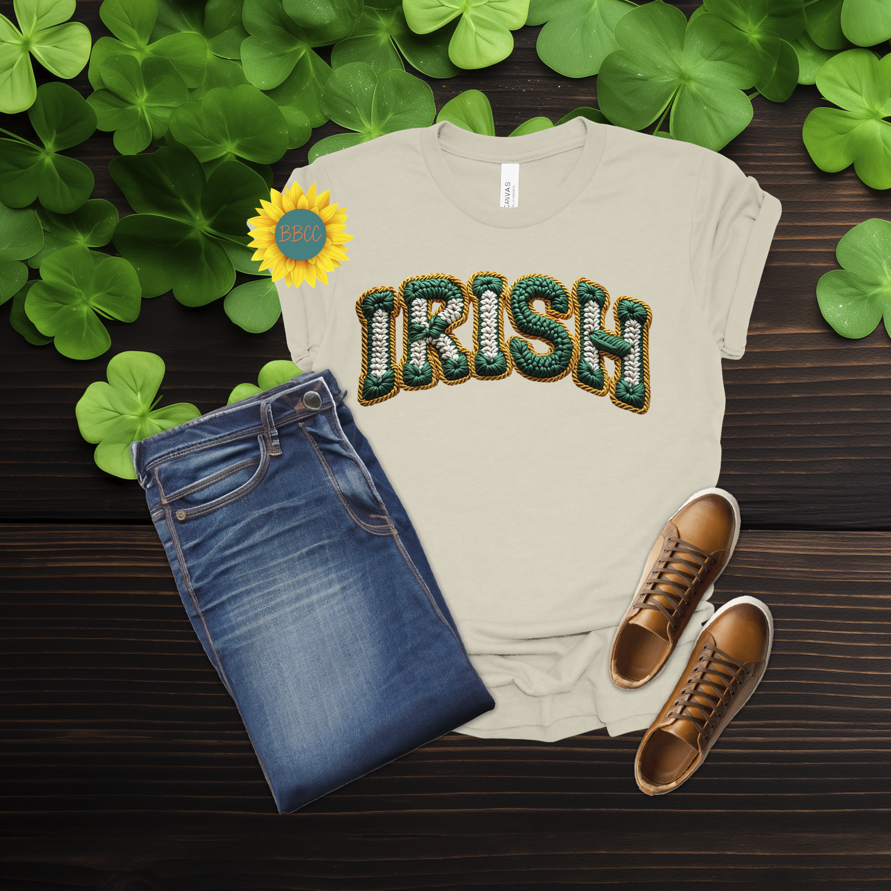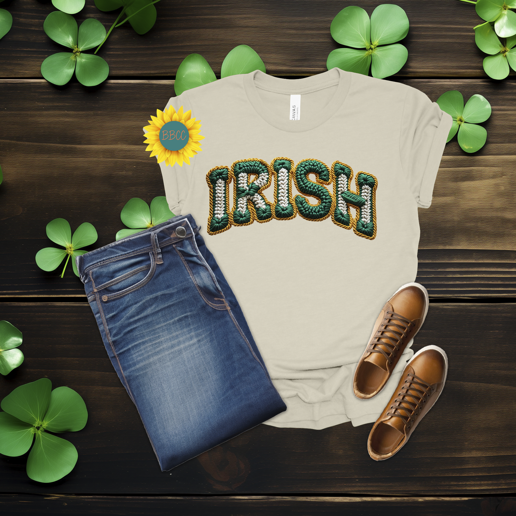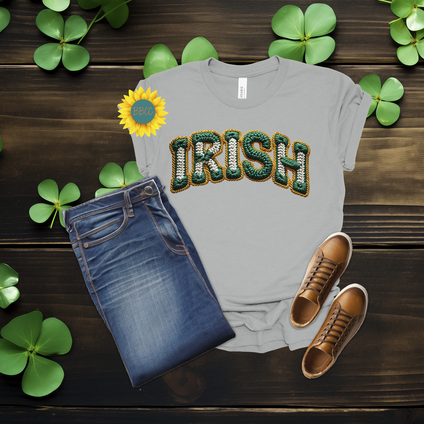This Irish Faux Yarn Lettering T-Shirt features bold green “Irish” lettering designed to look like textured yarn while remaining smooth and printed—no raised or stitched texture. The faux yarn effect gives it a cozy, festive feel without sacrificing comfort.