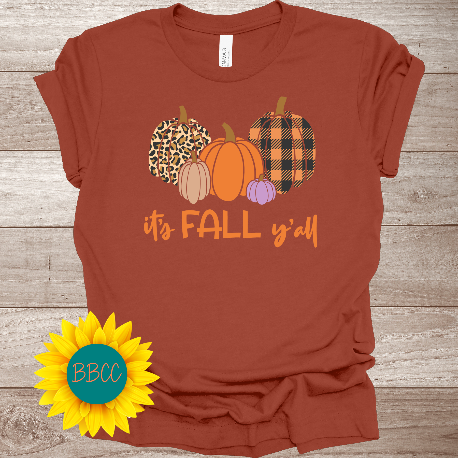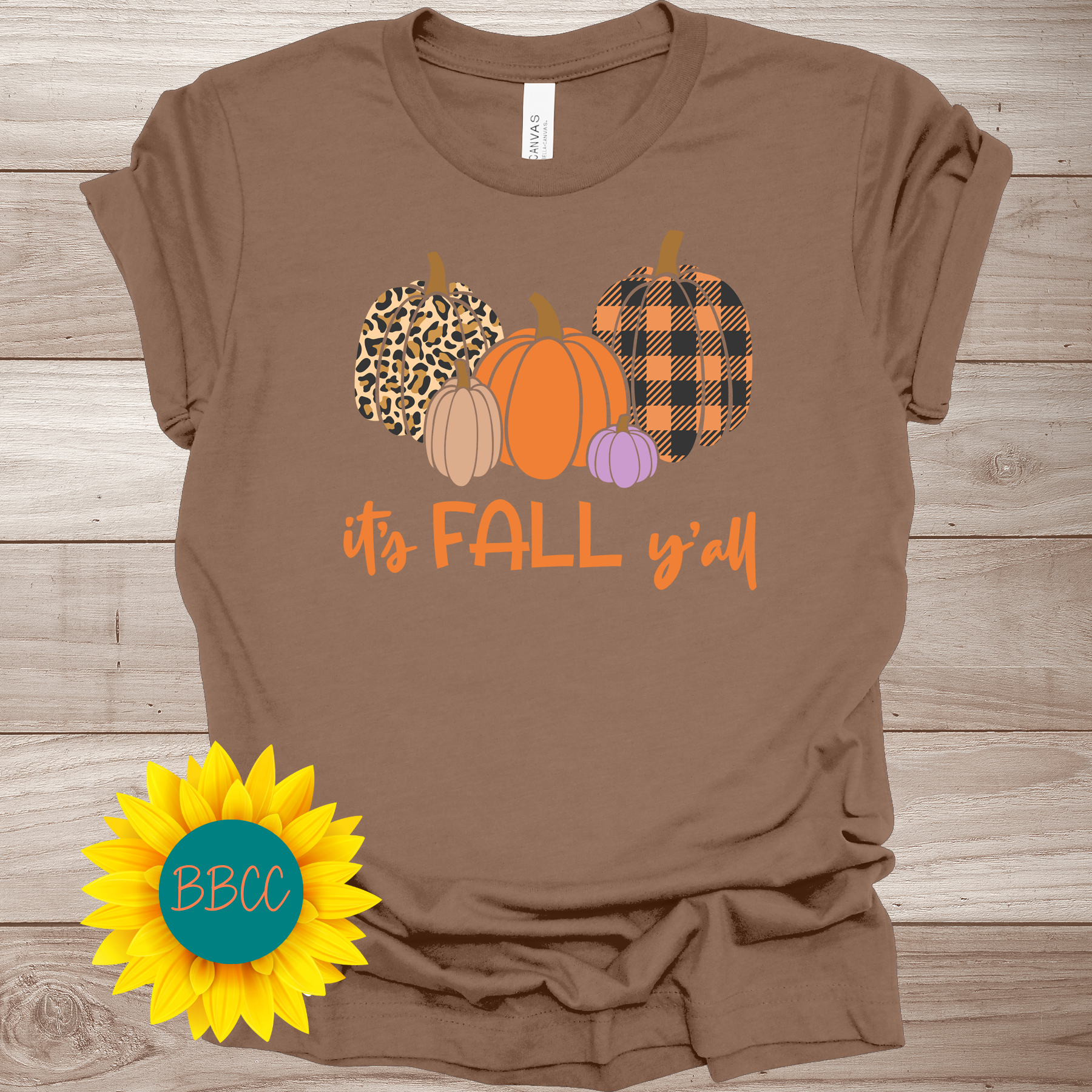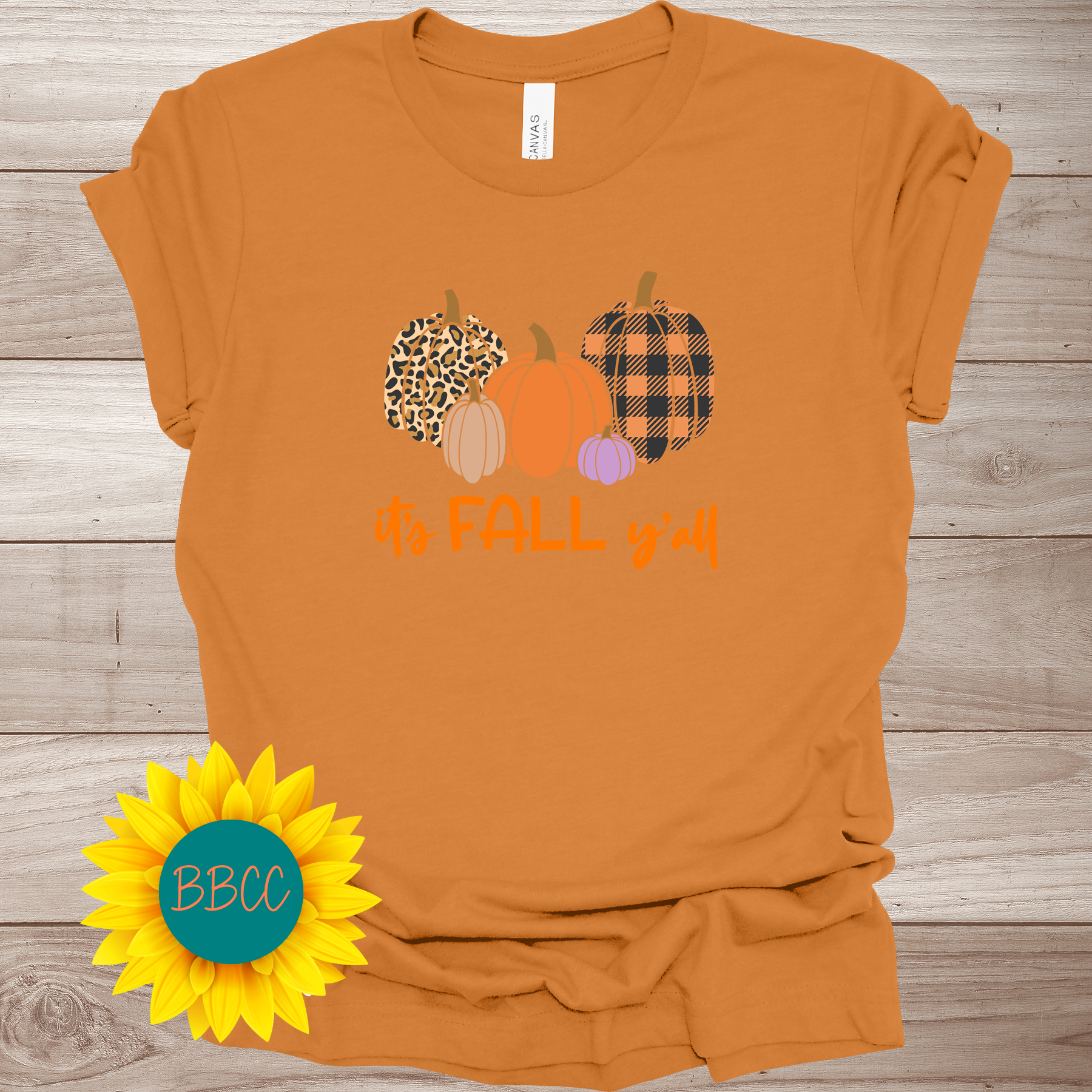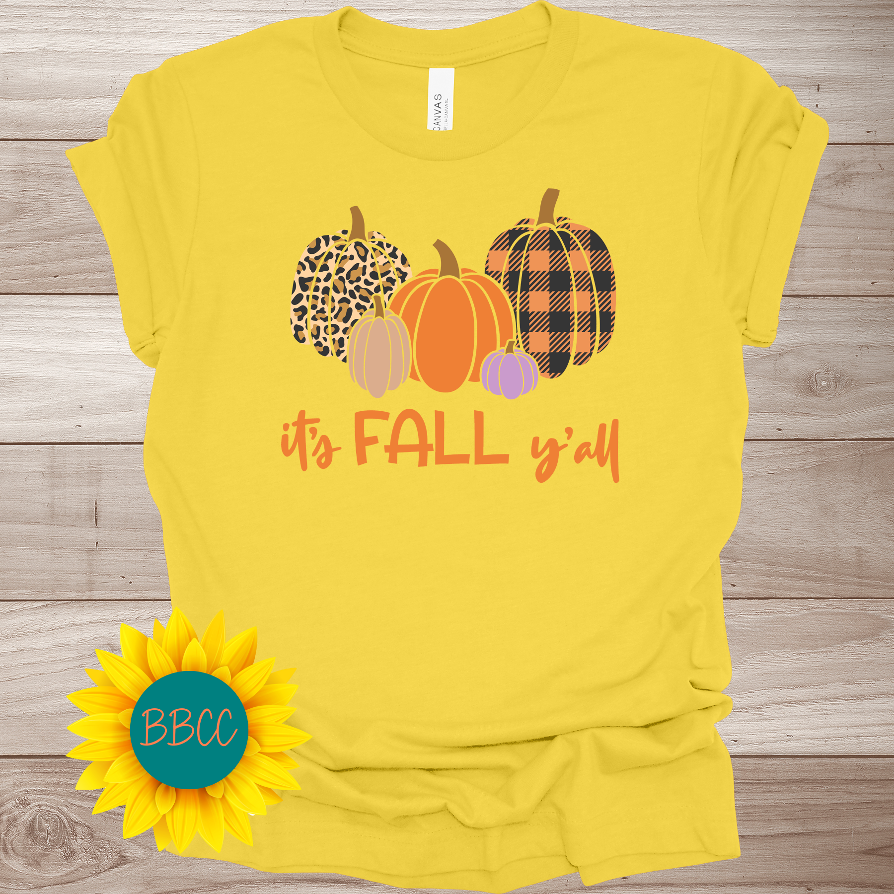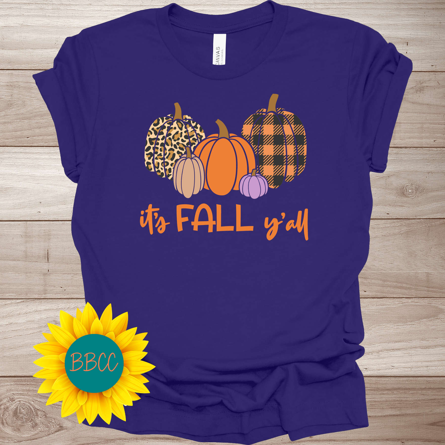 Get in the spirit of autumn with our "It's Fall Y'all" t-shirt! Featuring 5 pumpkins, 1 animal print, and 4 solid color options - orange, purple, beige, and orange and black plaid. Perfect for any fall occasion and a stylish way to show off your love for the season.