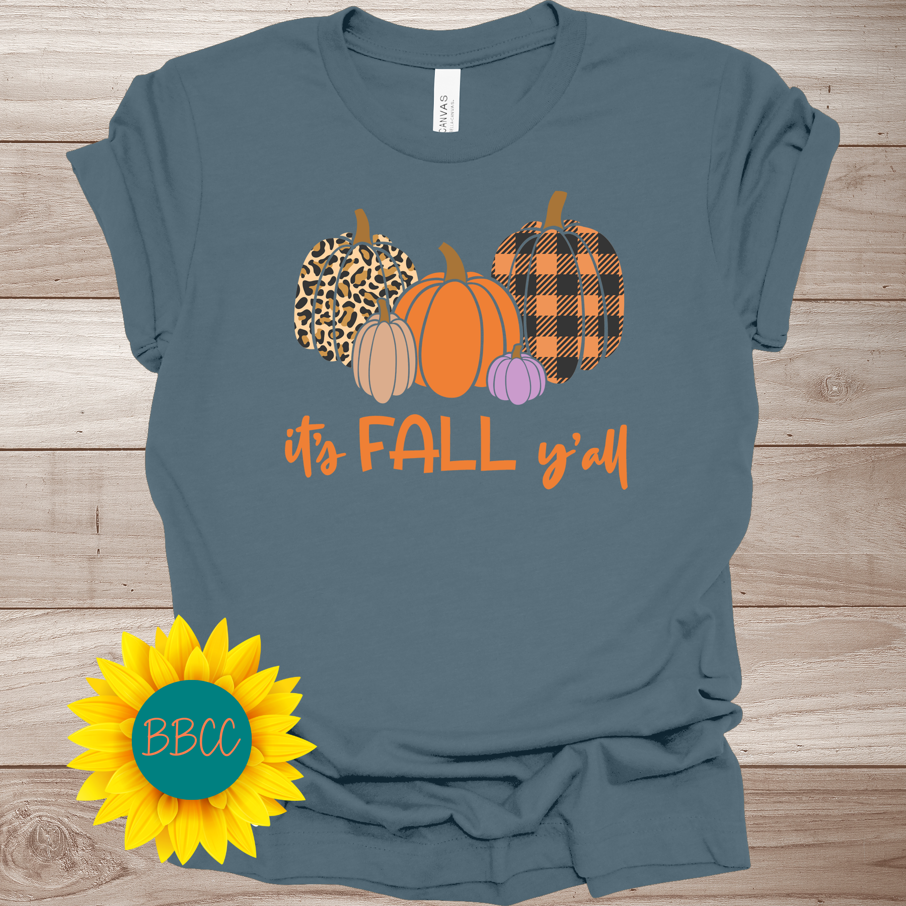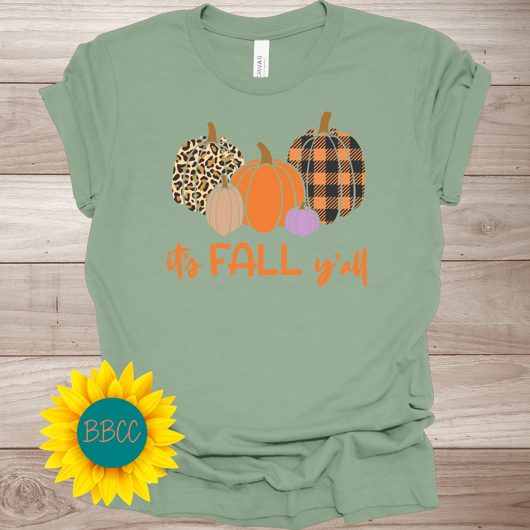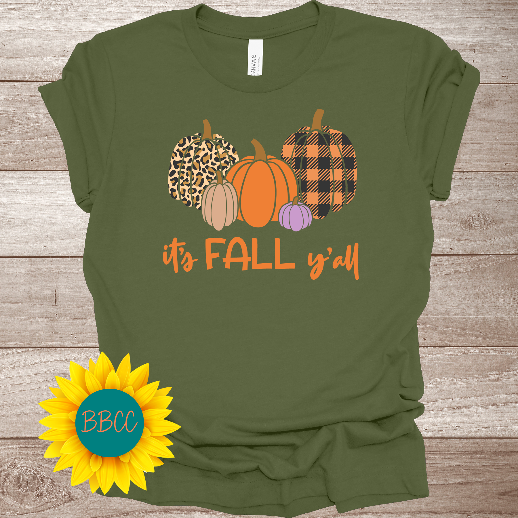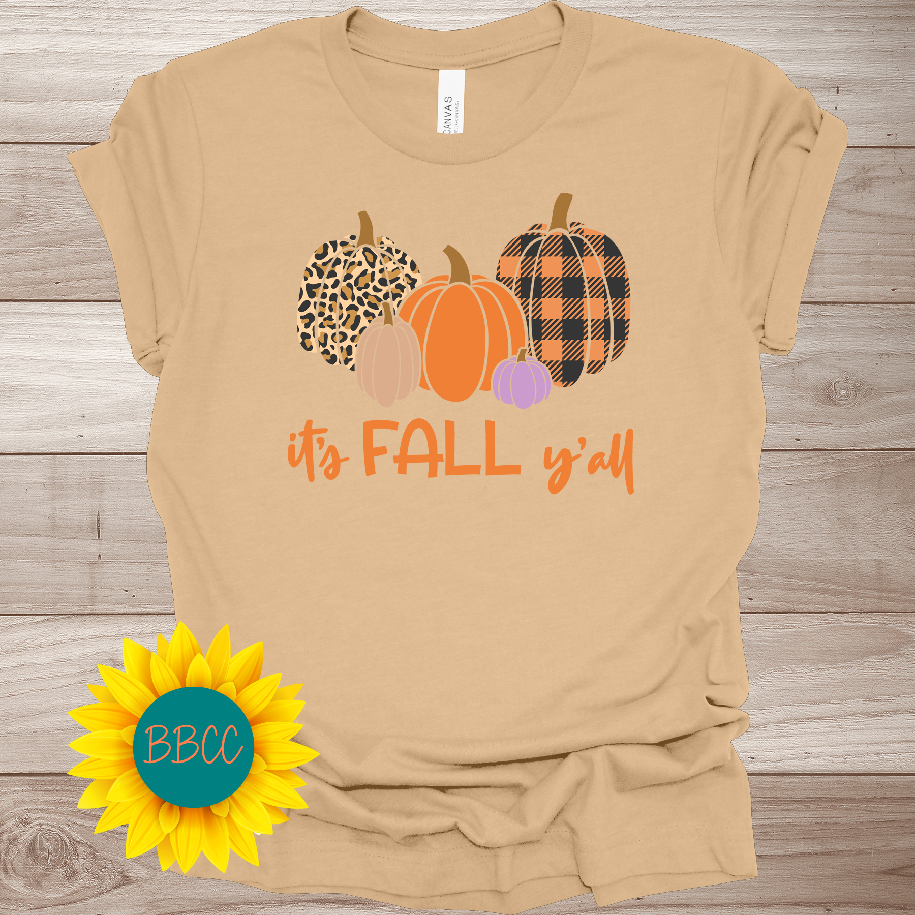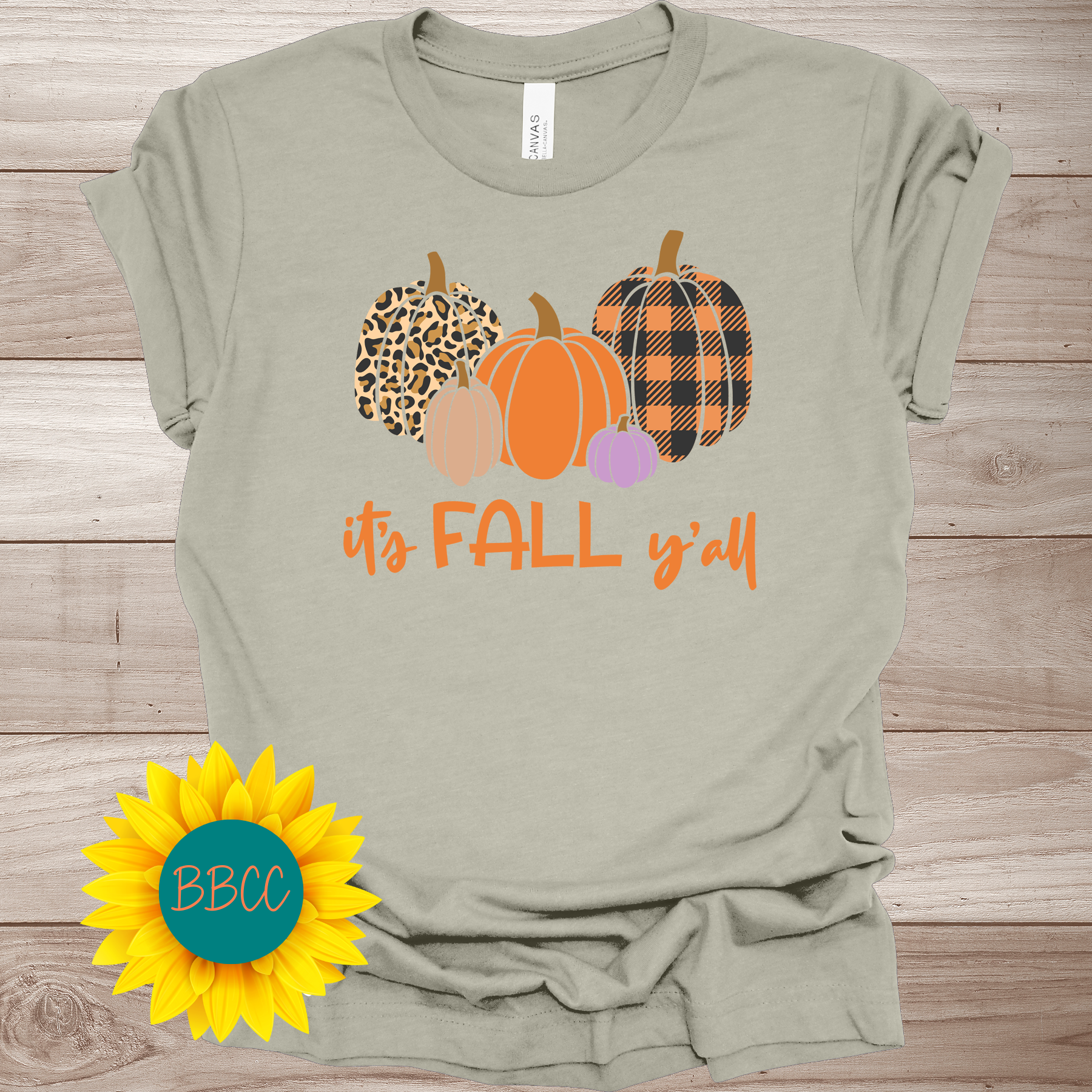 Get in the spirit of autumn with our "It's Fall Y'all" t-shirt! Featuring 5 pumpkins, 1 animal print, and 4 solid color options - orange, purple, beige, and orange and black plaid. Perfect for any fall occasion and a stylish way to show off your love for the season.