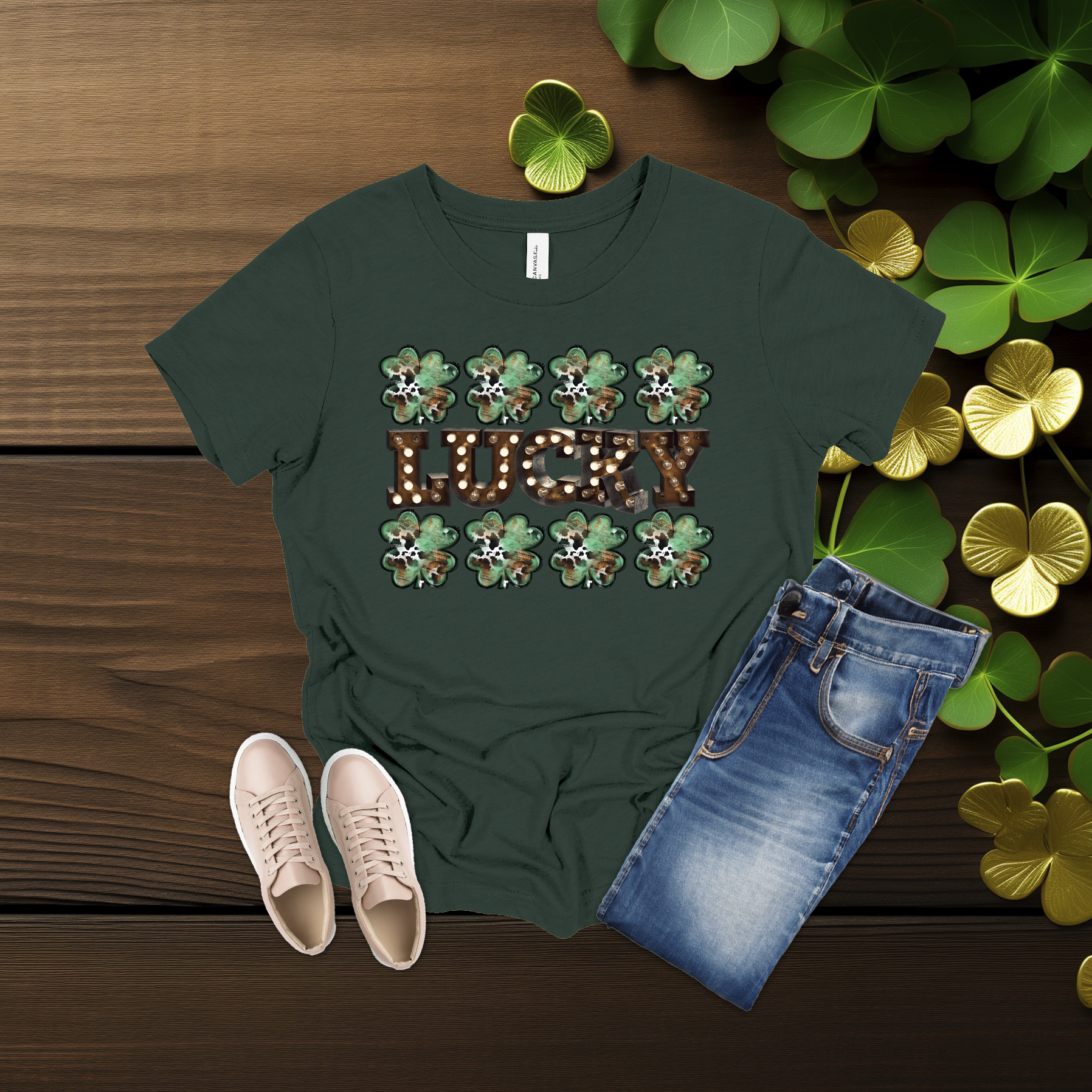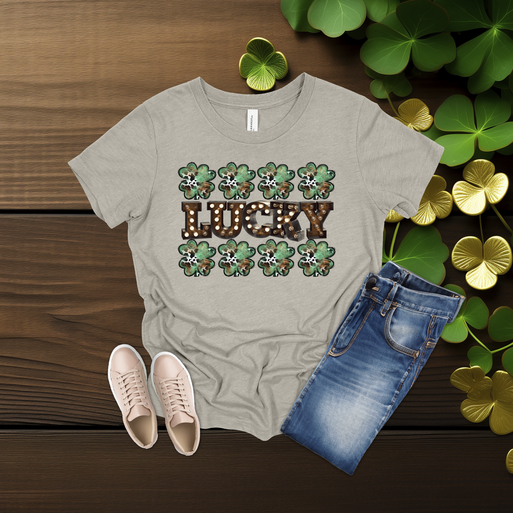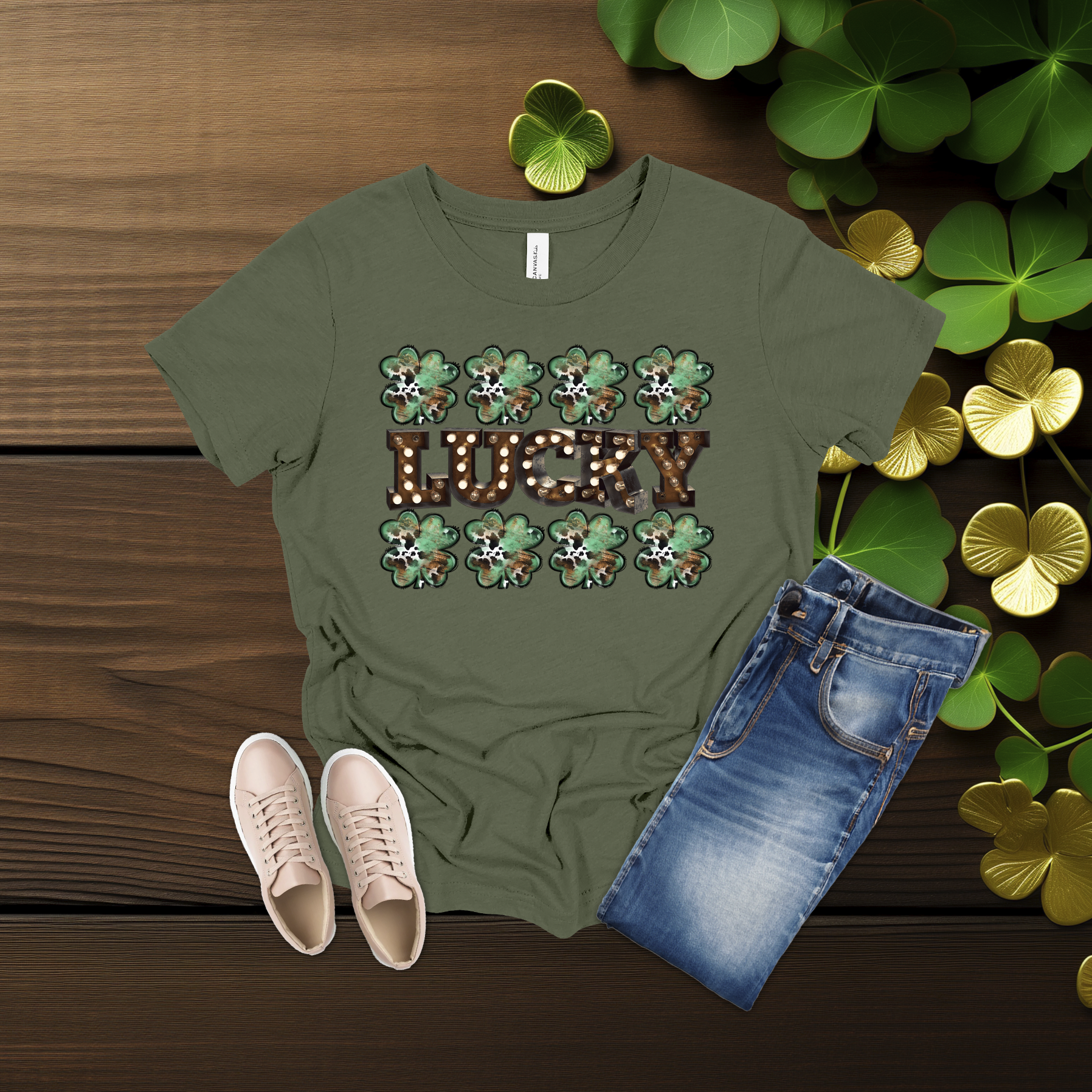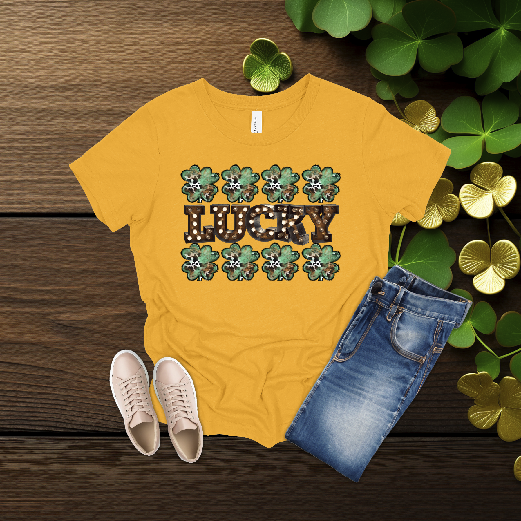 Celebrate the luck of the Irish with this bold Lucky shamrock tee! Featuring festive clovers and a rustic-style design on a bright gold shirt, it’s perfect for St. Patrick’s Day fun or everyday wear. Simple, comfy, and full of Irish charm 💚