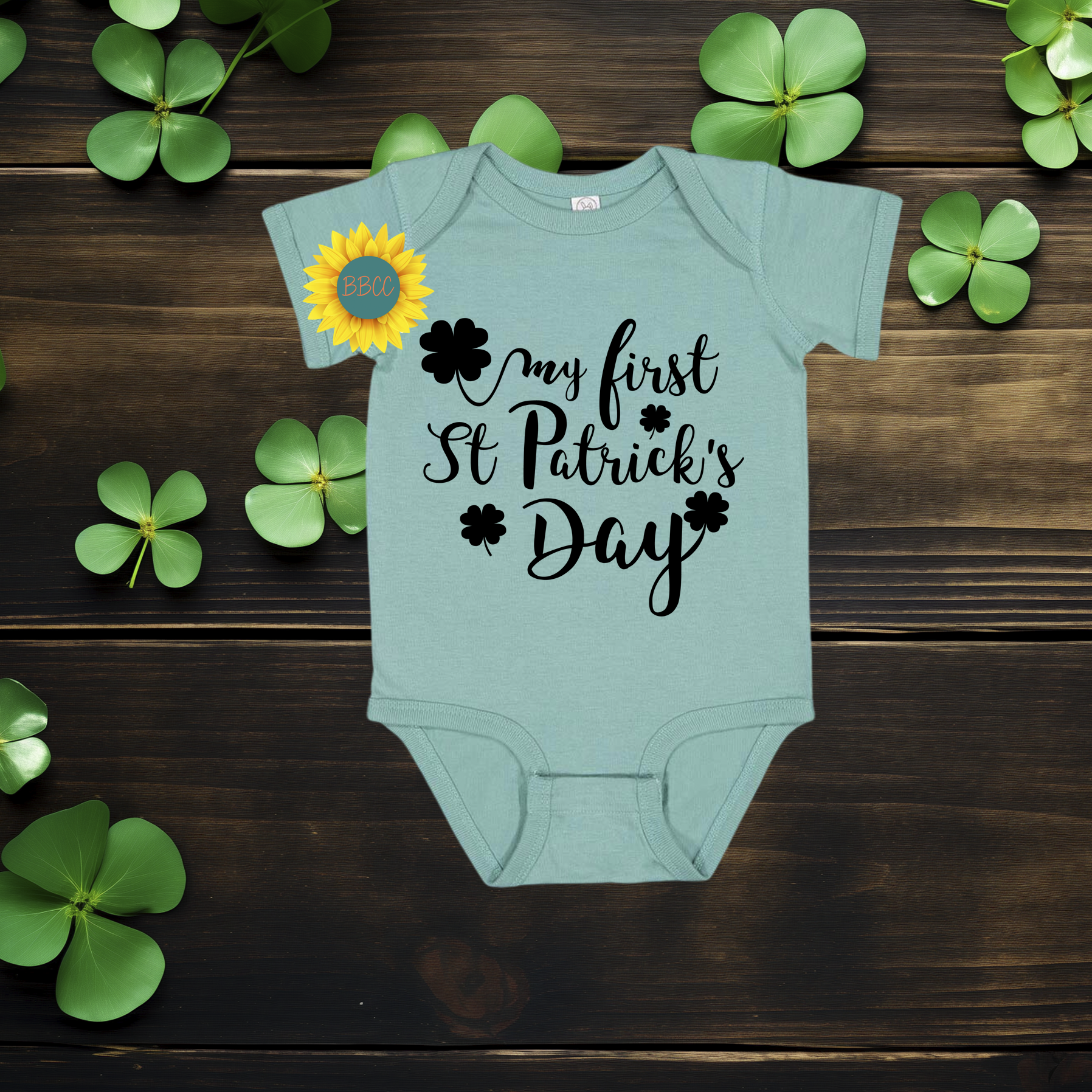 This My First St. Patrick’s Day romper features a sweet, simple design with playful shamrock accents, perfect for celebrating baby’s very first St. Paddy’s Day. The artwork is smooth and printed—no textured or faux yarn effects—keeping it soft and comfy for everyday wear, photos, and festive outings.
