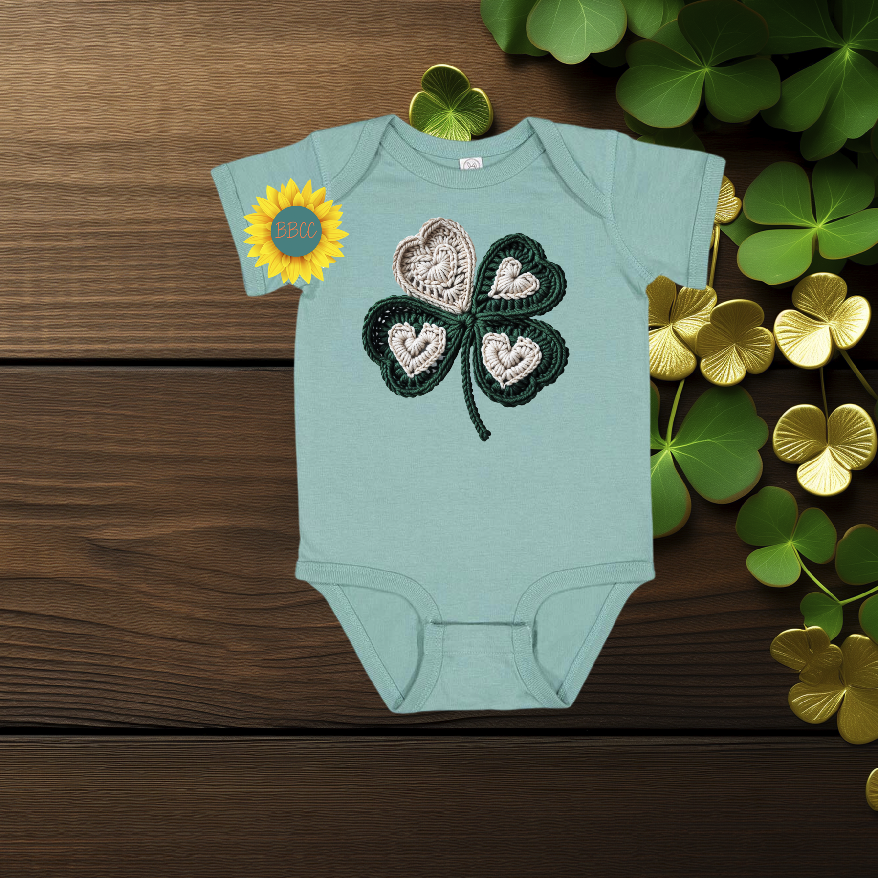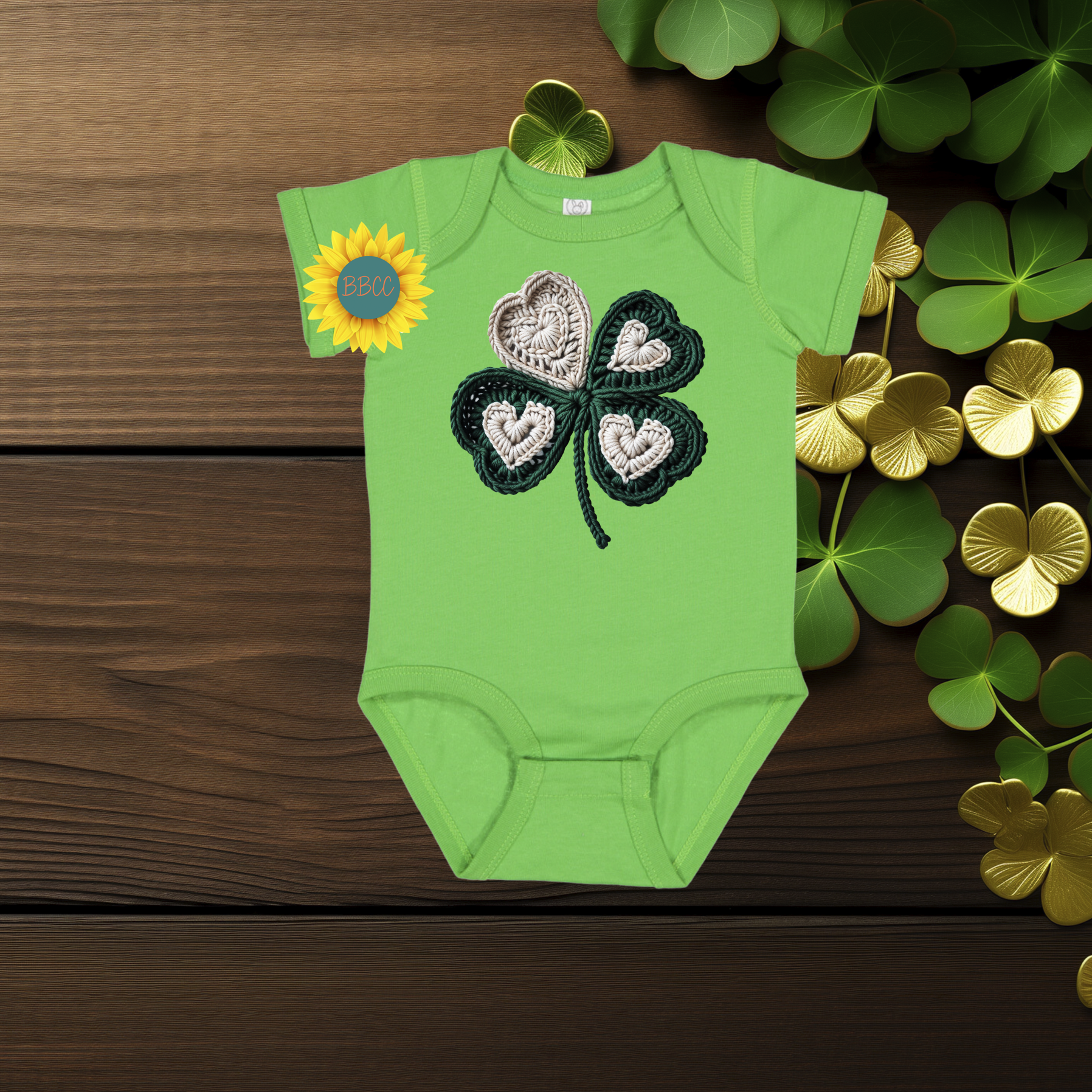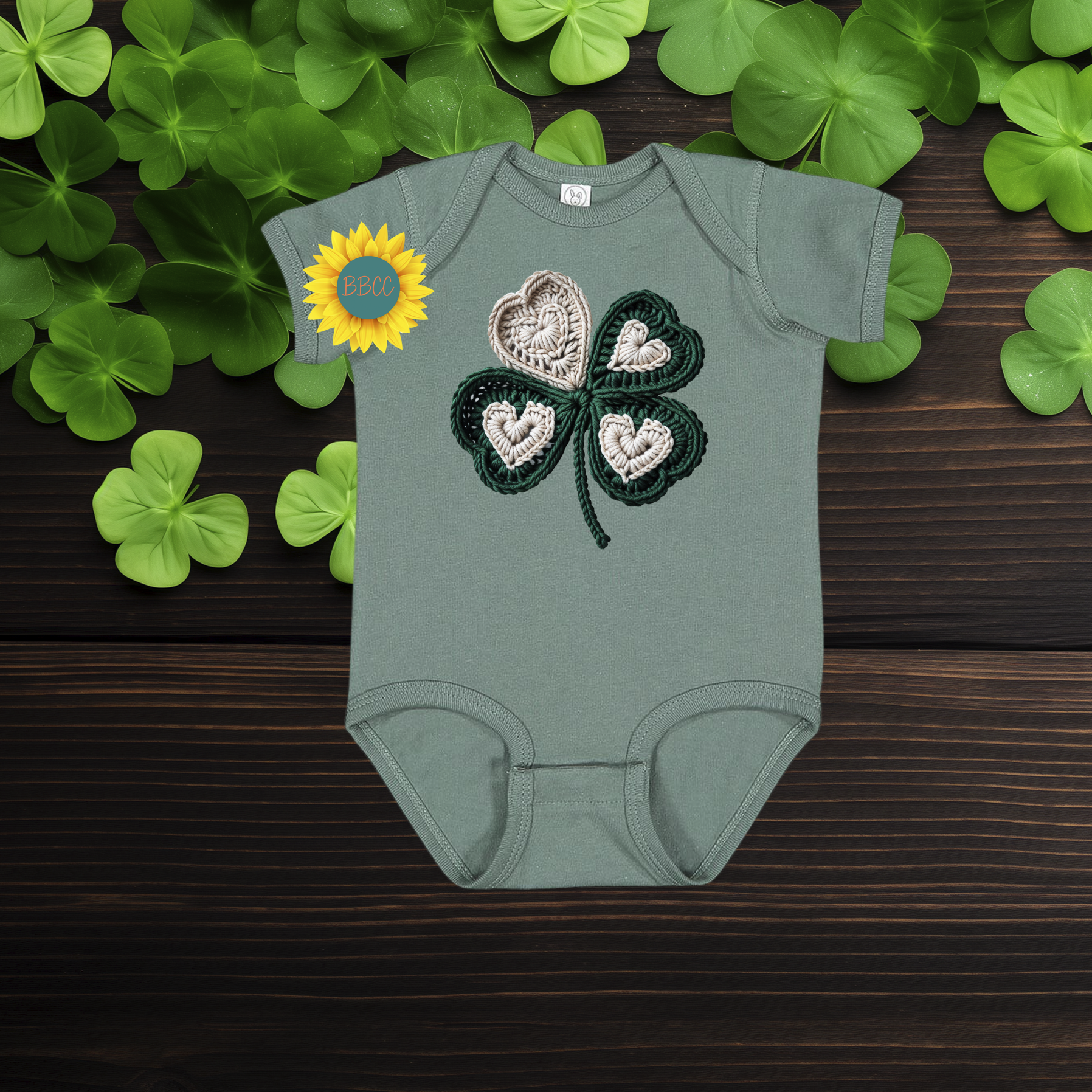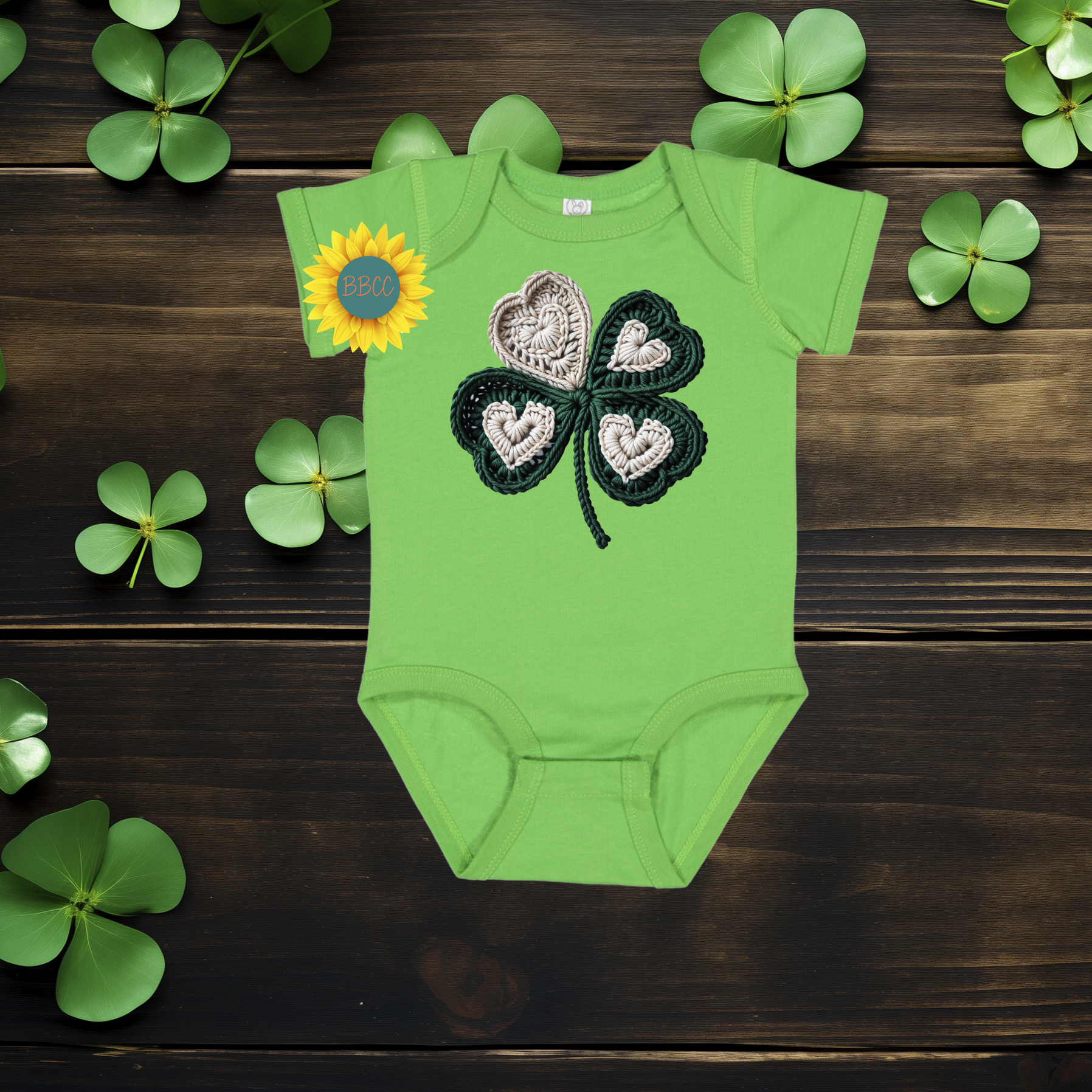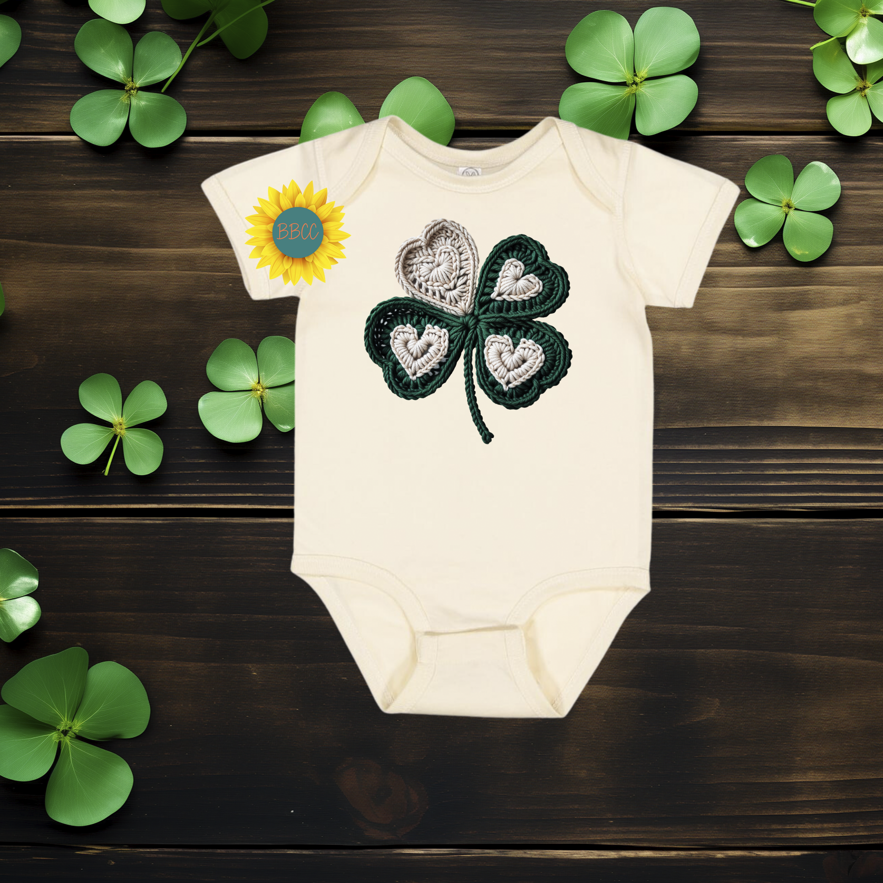 Celebrate baby’s first St. Patrick’s Day with this sweet shamrock romper featuring a cozy faux yarn crochet-style design. Soft, festive, and perfect for photos, parades, and family celebrations.