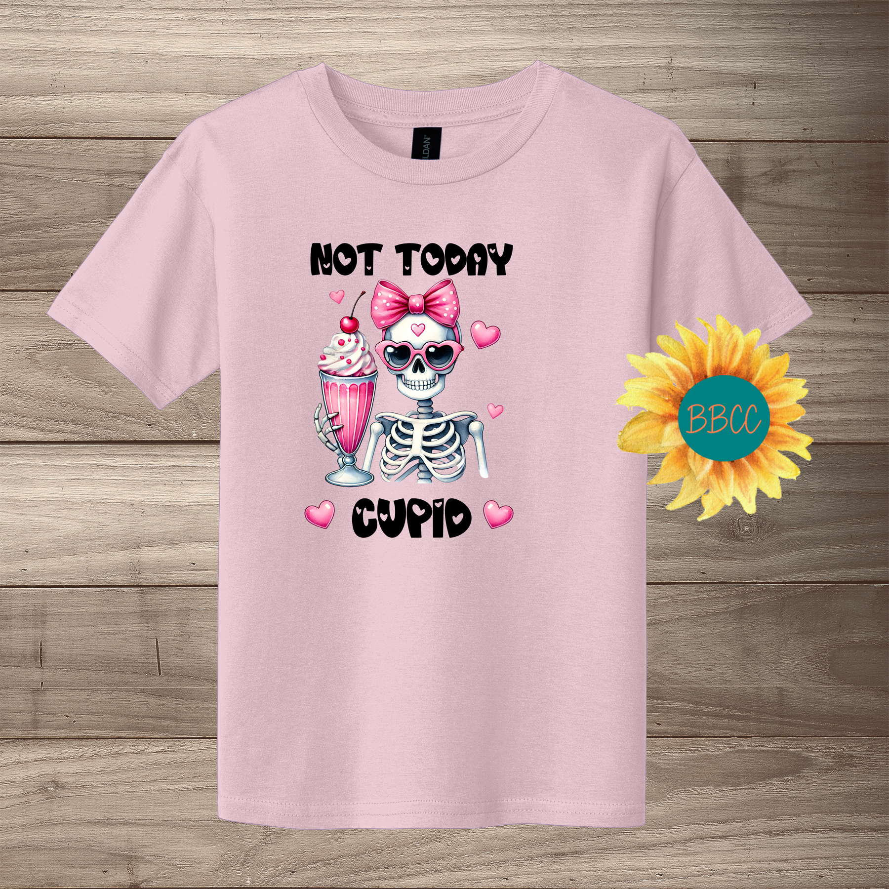 This cute Not Today Cupid T-shirt features a charming skeleton holding a milkshake, wearing pink heart-shaped glasses and a matching bow. Perfect for spreading love and adding a quirky touch to your wardrobe. Available in sizes XS to XL and a variety of colors, this unique shirt is sure to turn heads!