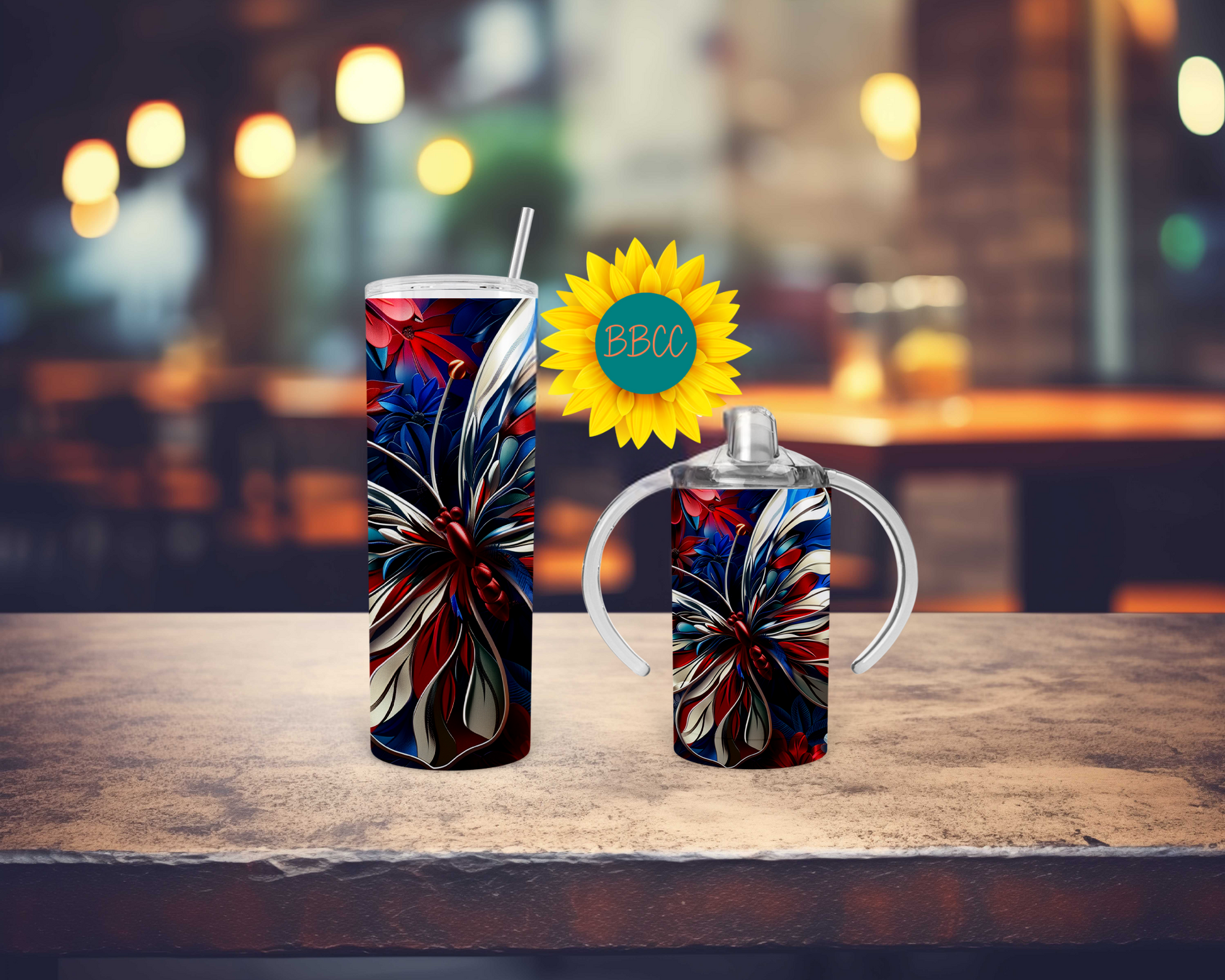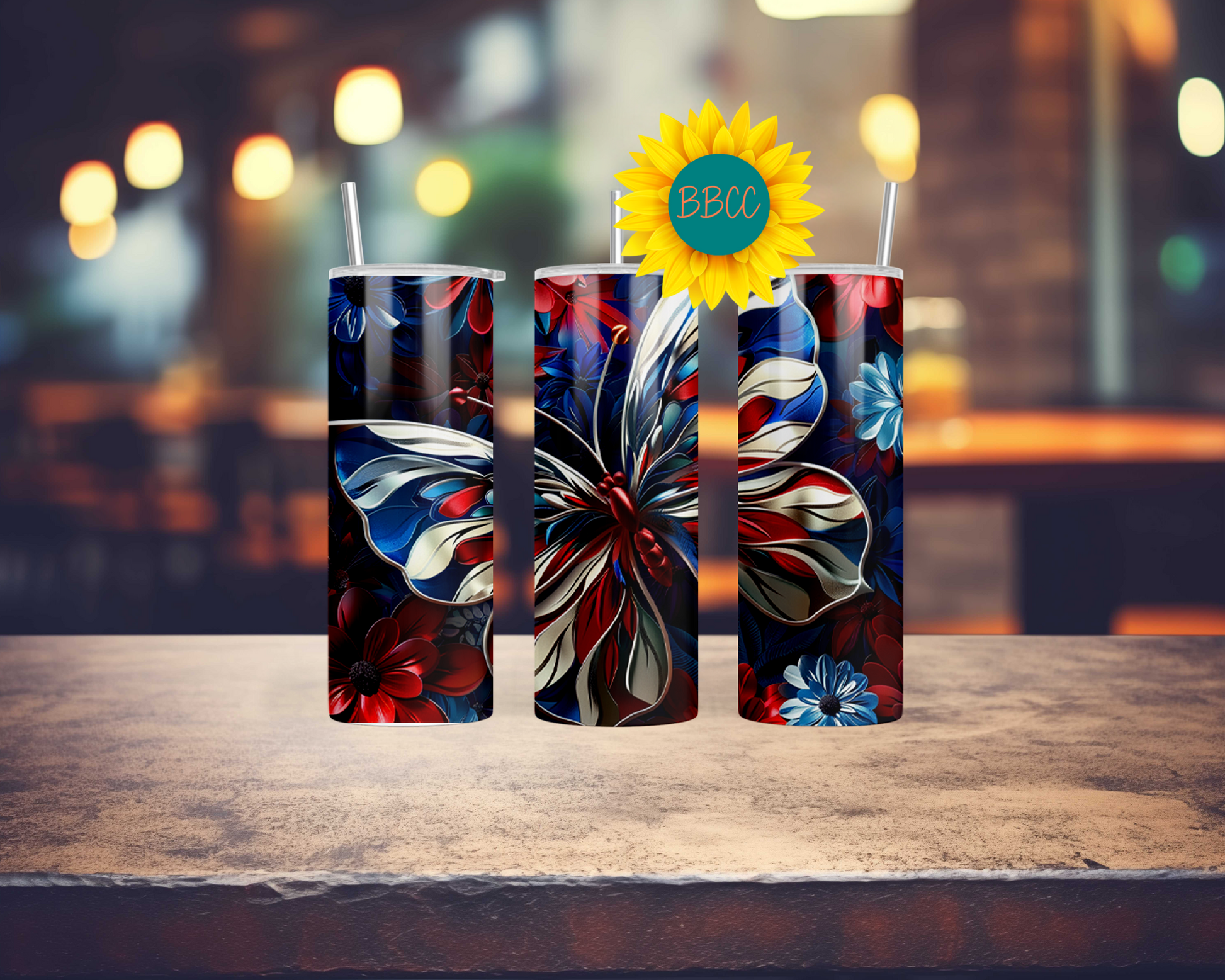 Show off your patriotic side with this beautiful red, white, and blue butterfly tumbler. Perfect for keeping your drinks cold (or hot - we don't judge!) while also looking stylish. Grab one for yourself and spread some patriotic love.