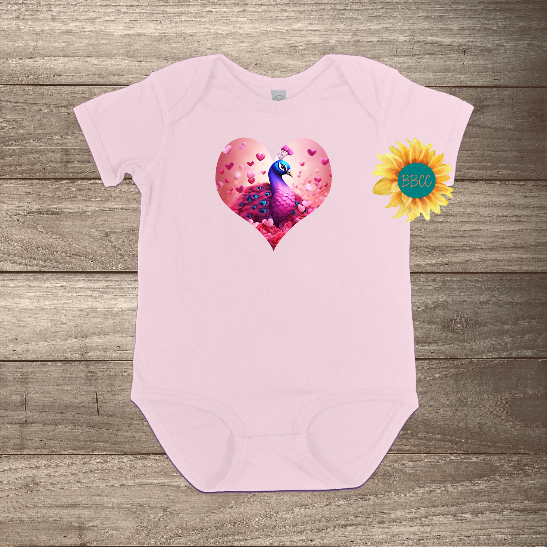 This adorable romper features a colorful peacock resting in a bed of roses and hearts, surrounded by vibrant pink and red hearts. Available in multiple colors and sizes up to 24 months, it’s the perfect addition to your little one’s wardrobe. Bring joy, whimsy, and a pop of color to their day with this lovely romper!
