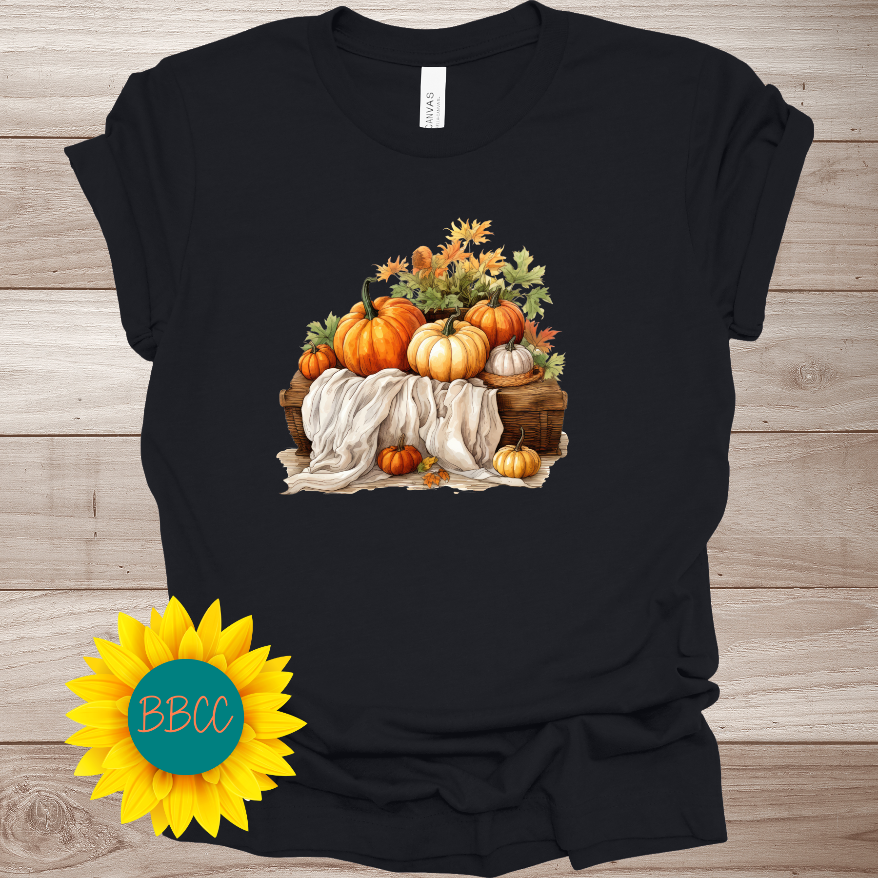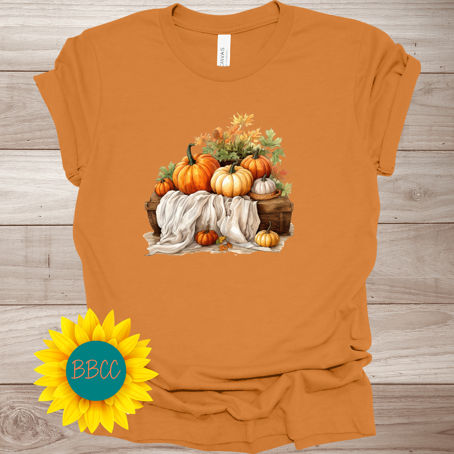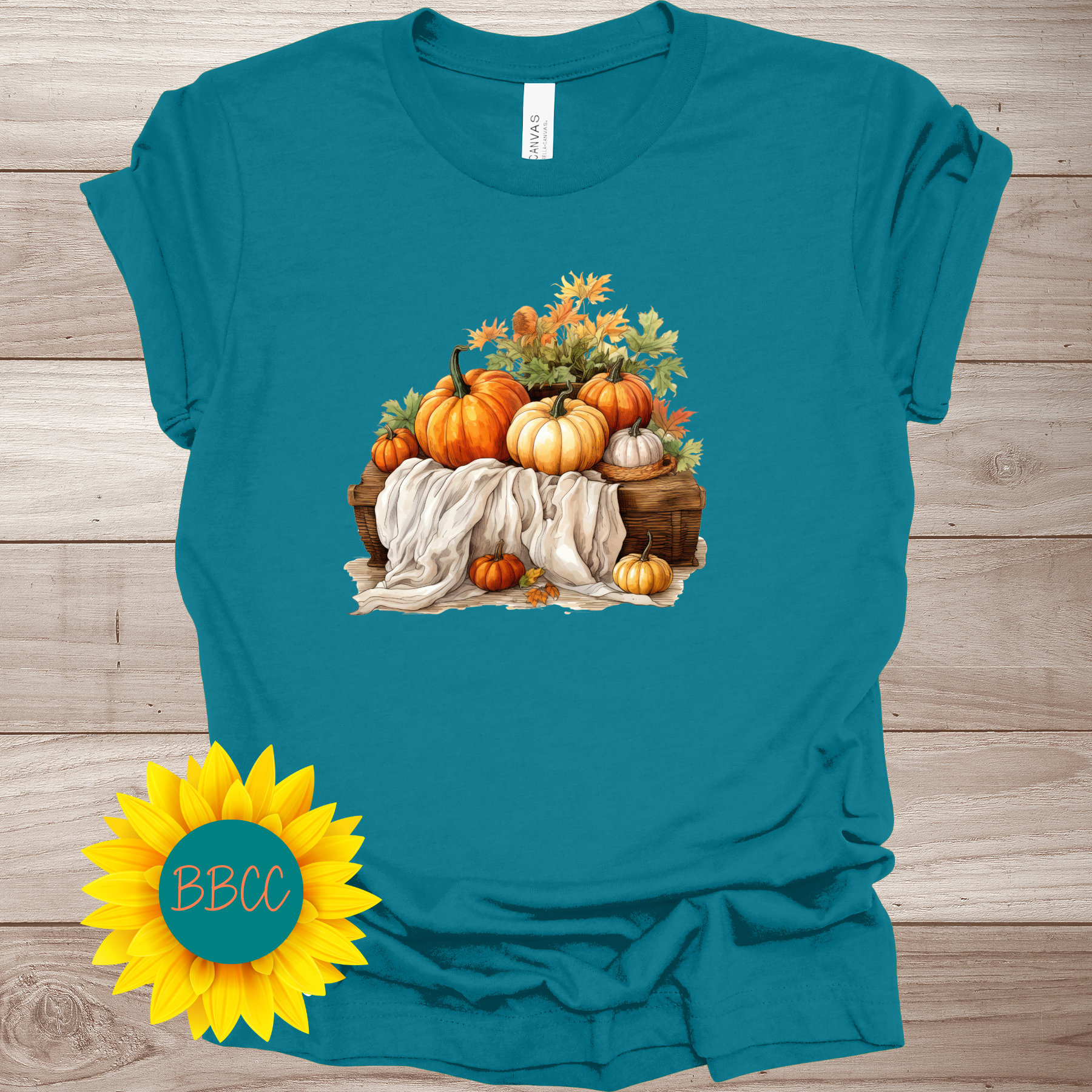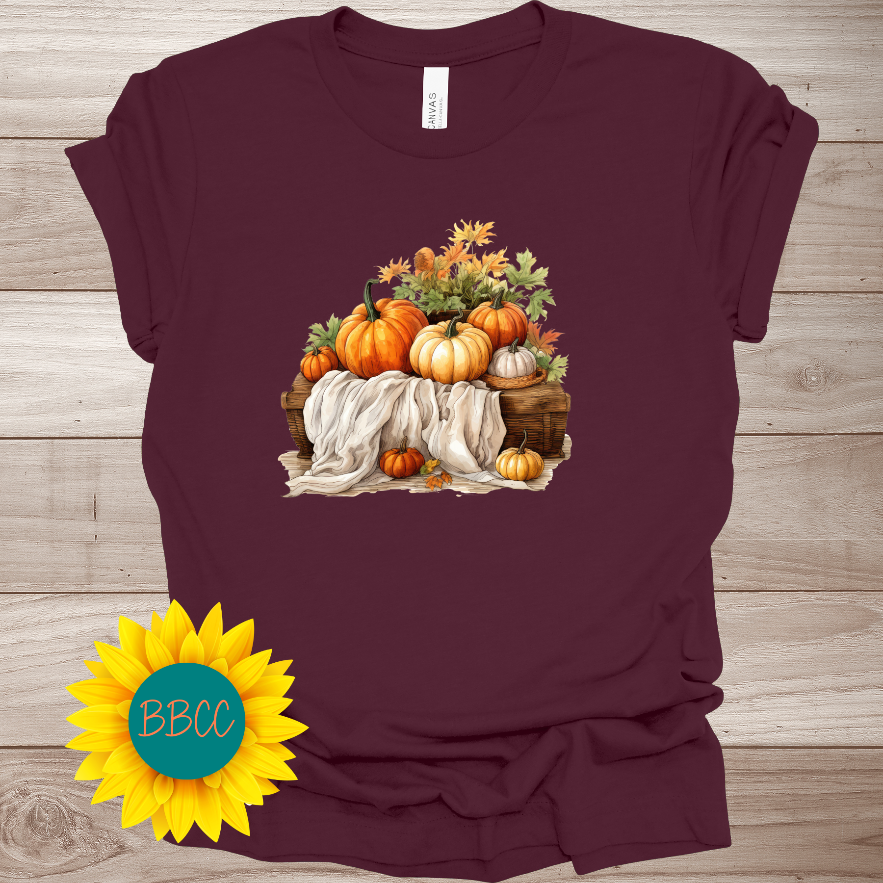 This Pumpkins T-Shirt features a unique wooden crate fabric adorned with a charming arrangement of pumpkins and leaves. With its cozy and autumnal design, this shirt is perfect for showcasing your love for the fall season. Made of high-quality materials, it offers both comfort and style.