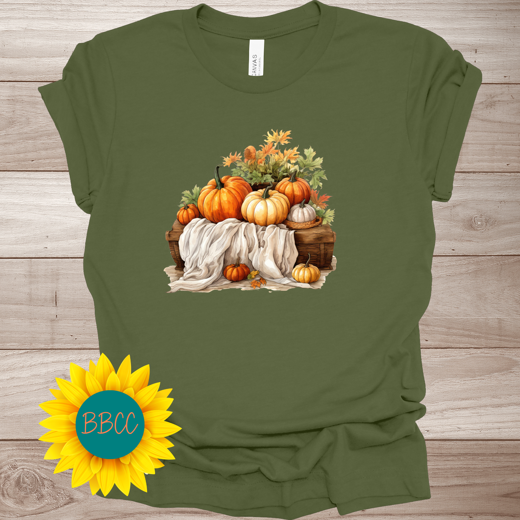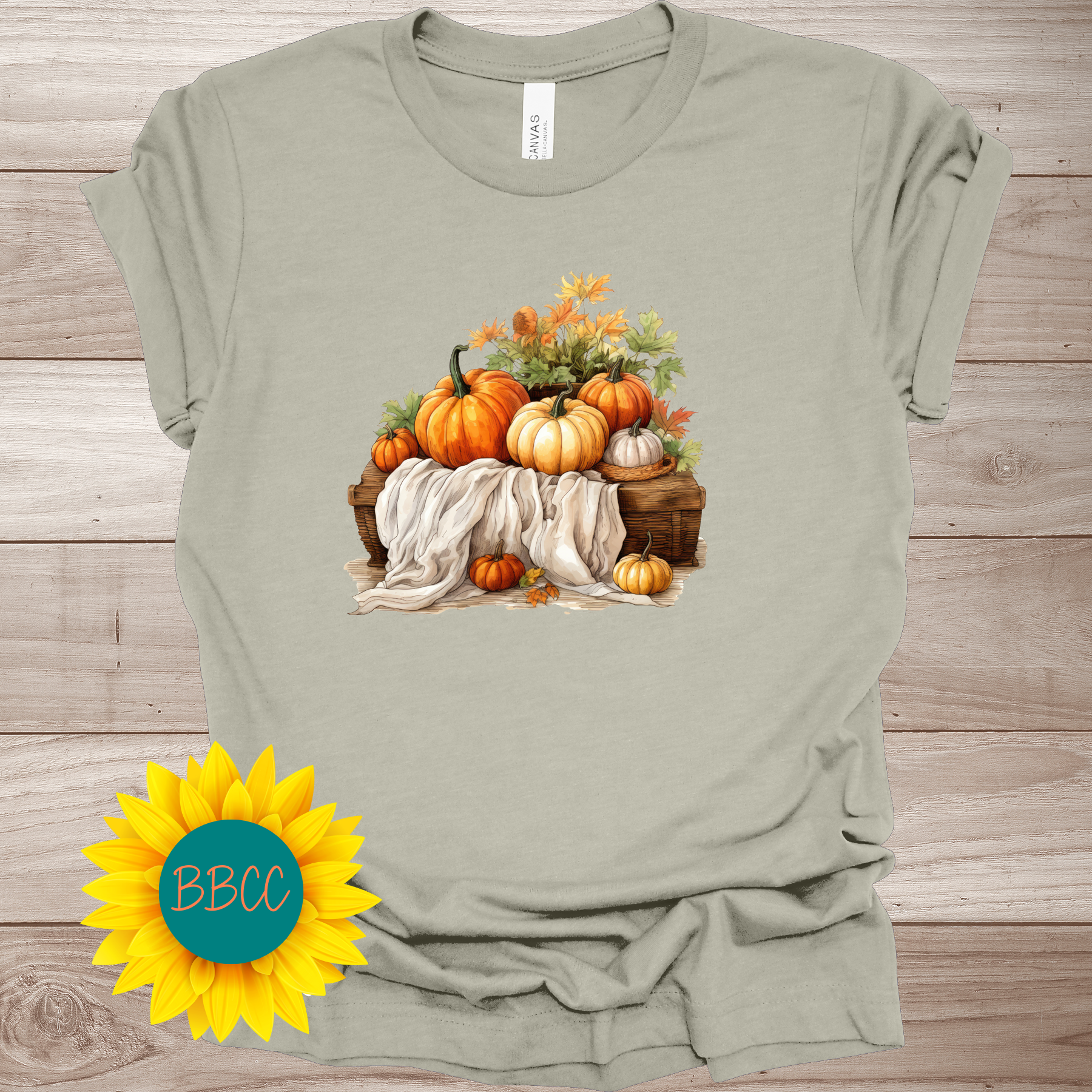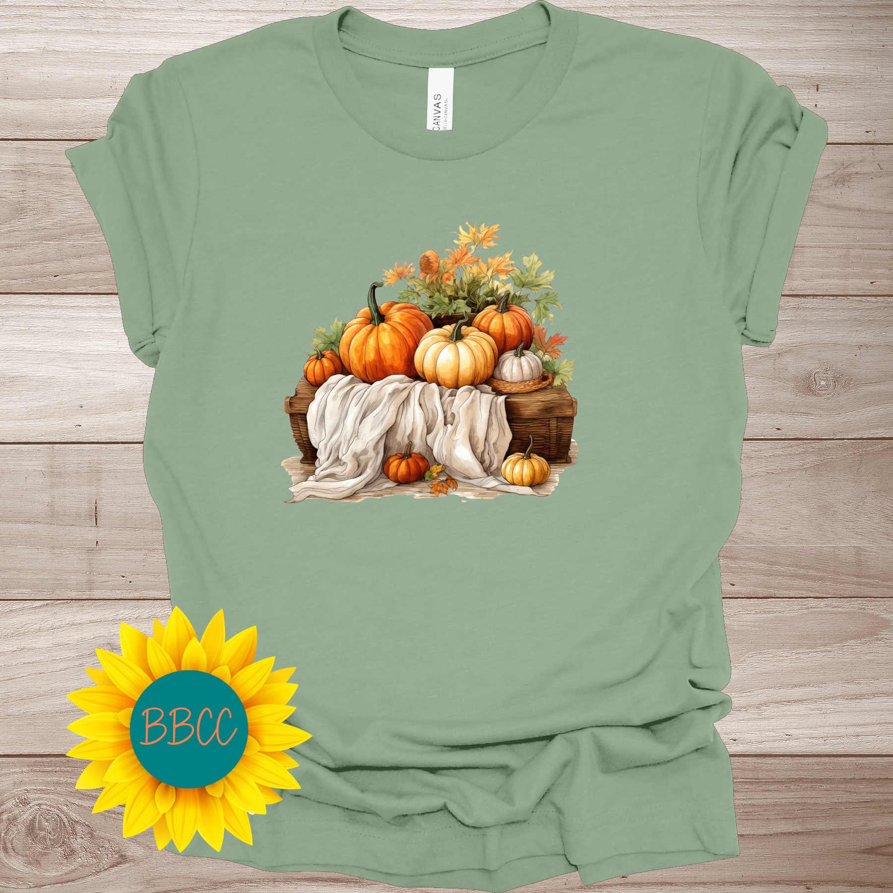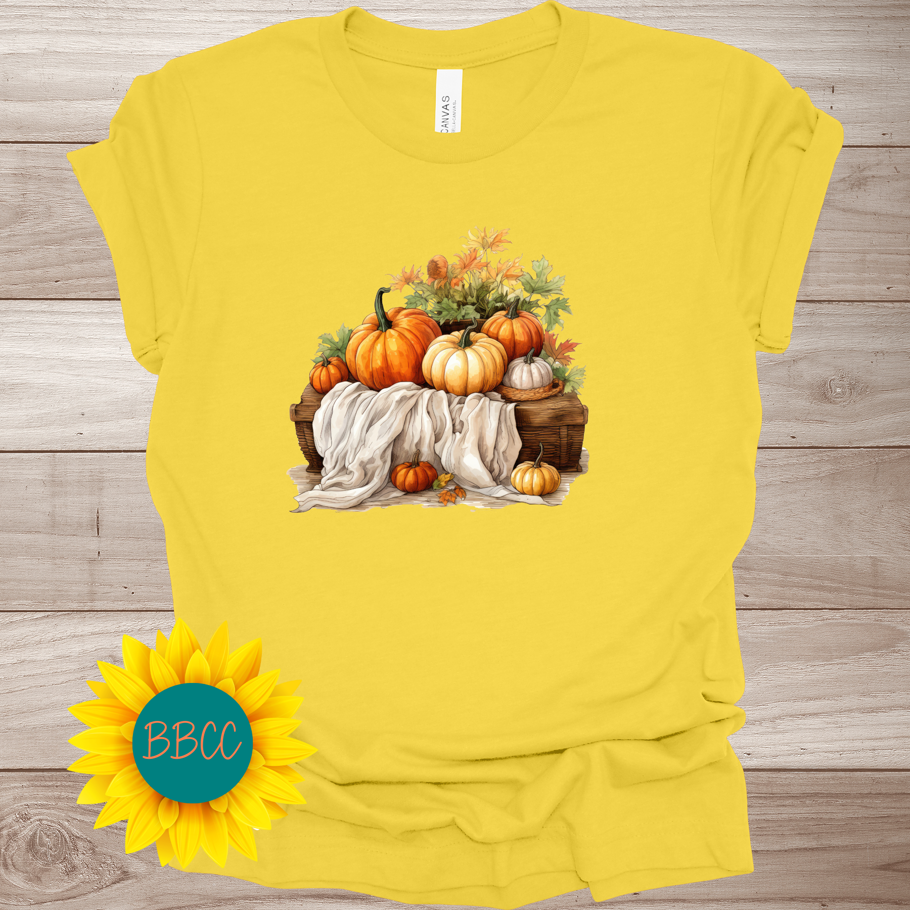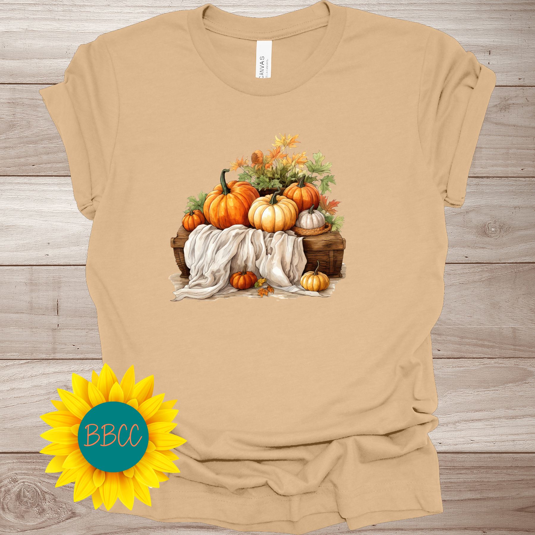 This Pumpkins T-Shirt features a unique wooden crate fabric adorned with a charming arrangement of pumpkins and leaves. With its cozy and autumnal design, this shirt is perfect for showcasing your love for the fall season. Made of high-quality materials, it offers both comfort and style.