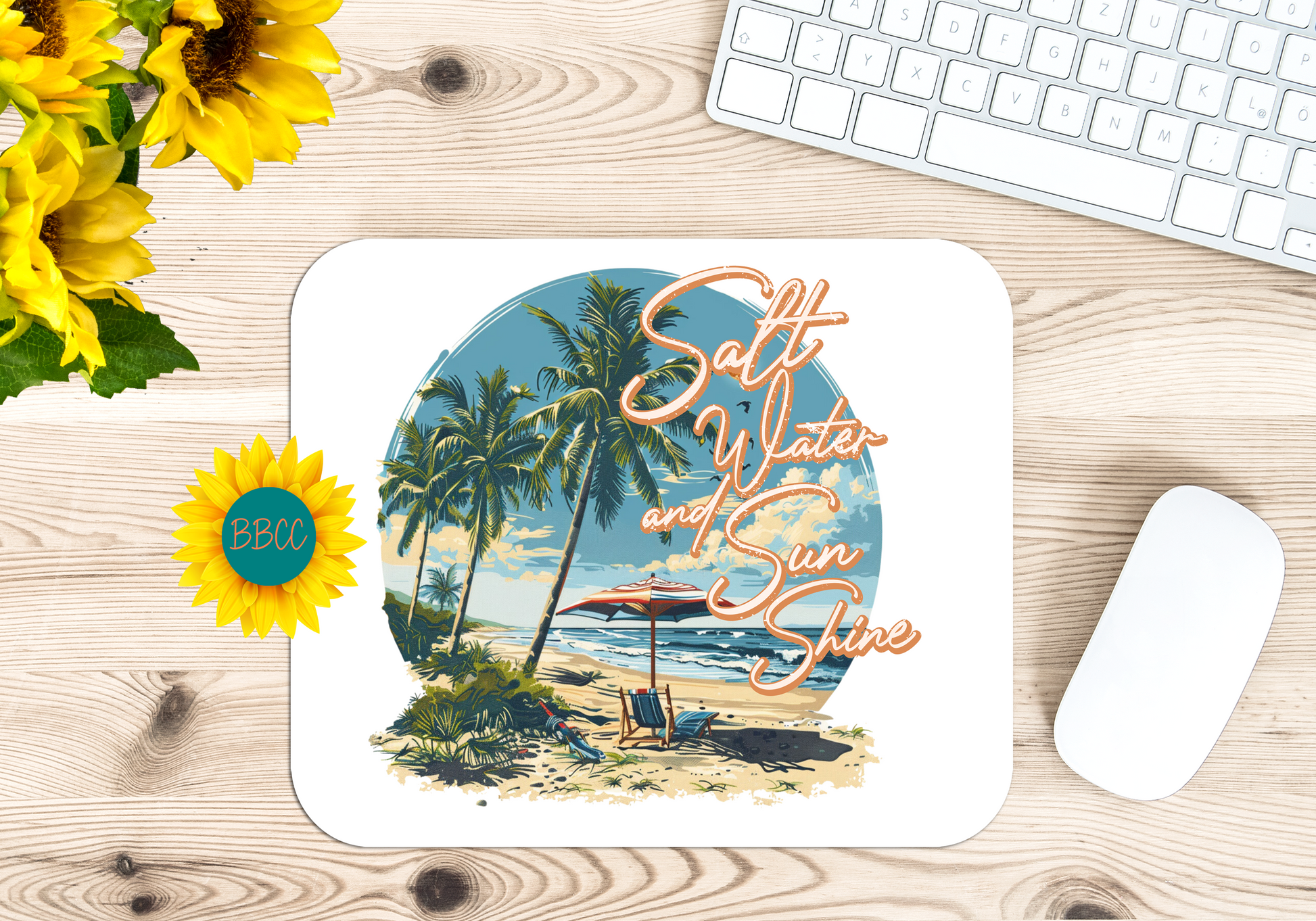 This tropical mouse pad features a circular beach scene with palm trees, ocean waves, and beach chairs under an umbrella. The phrase "Salt Water and Sun Shine" appears in elegant rose gold script across the design. This coastal-themed accessory adds a cheerful summer vibe to any workspace.