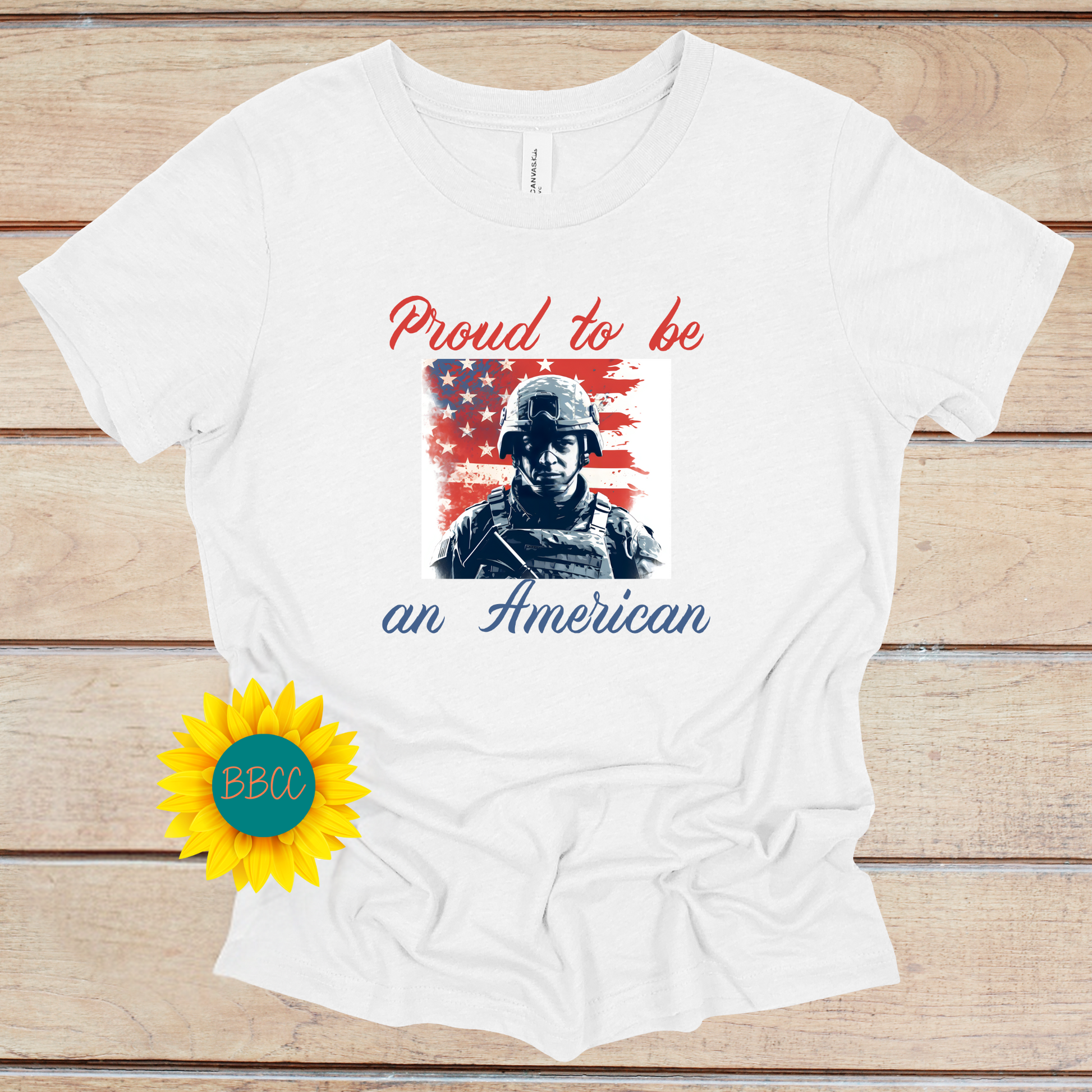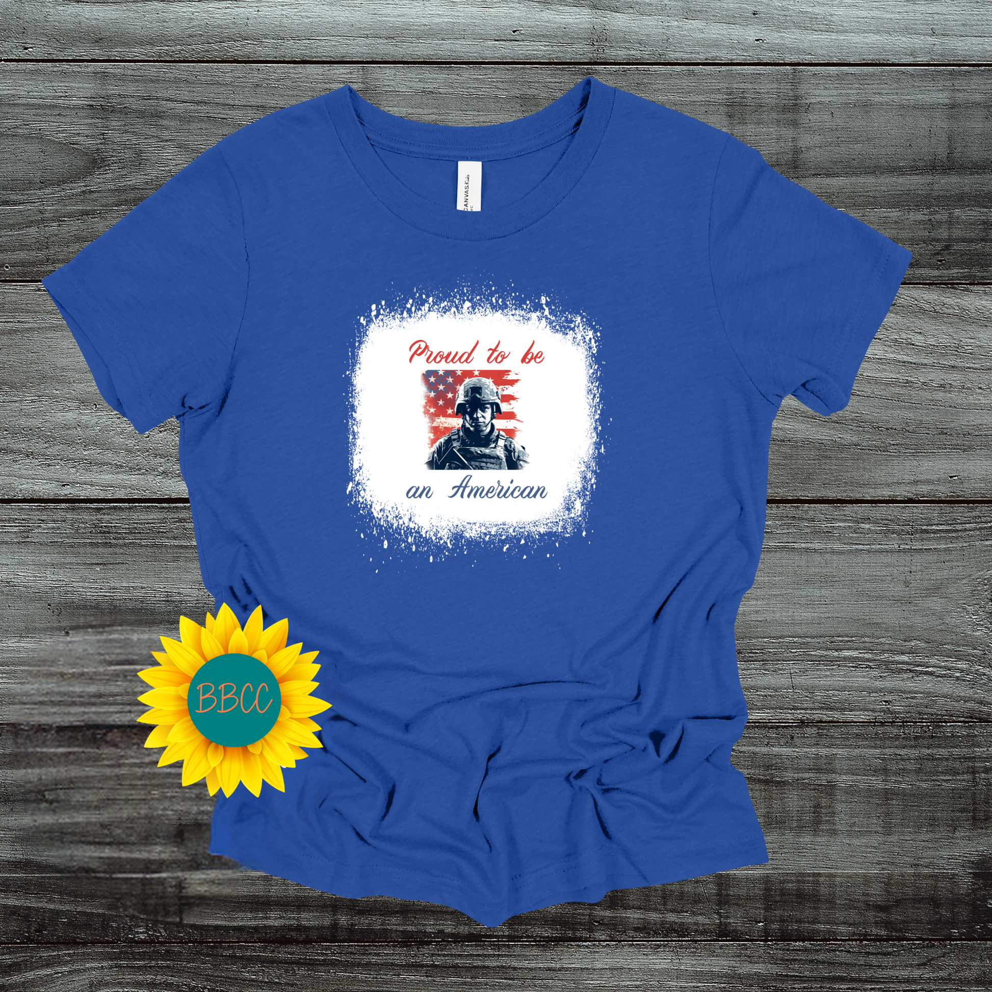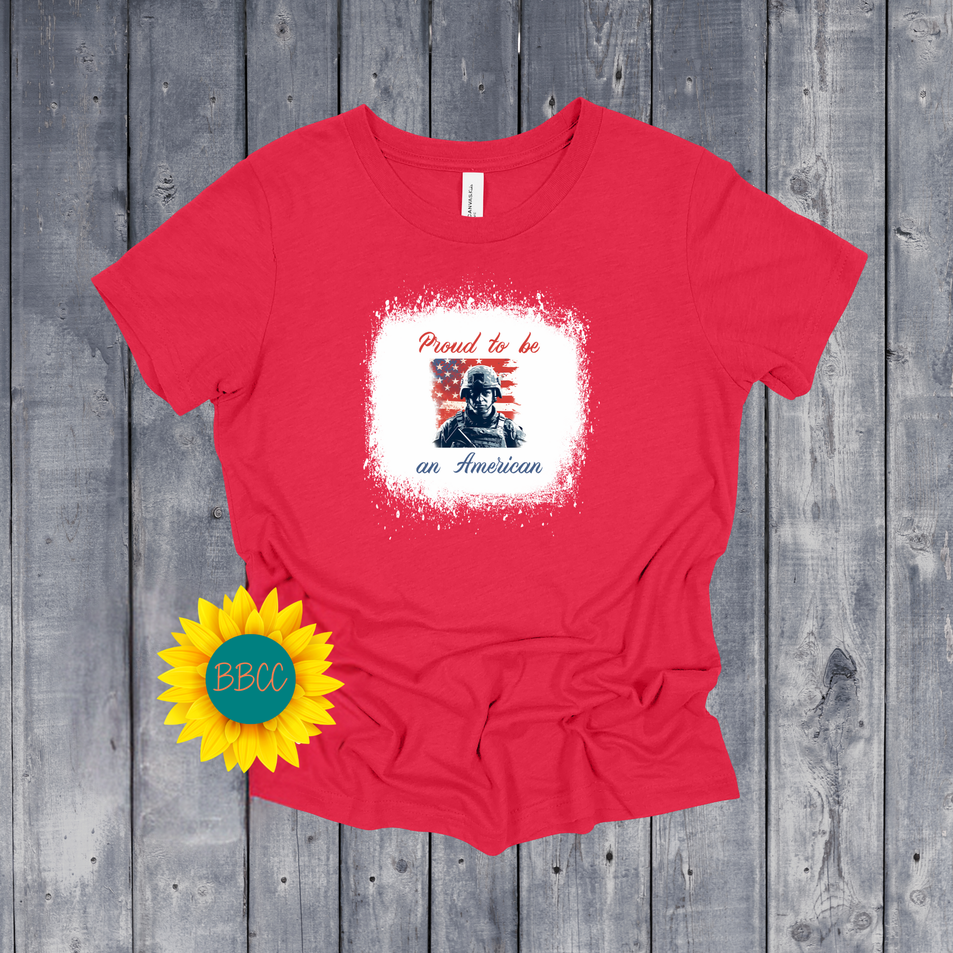 Proudly display your American spirit with our “Proud to Be an American” Soldier T-shirt. Available in vibrant red, white, and blue, the red and blue options feature a unique bleached design for that extra pop. This playful yet meaningful tee is available in all sizes, making it perfect for anyone looking to show support for our troops and country.