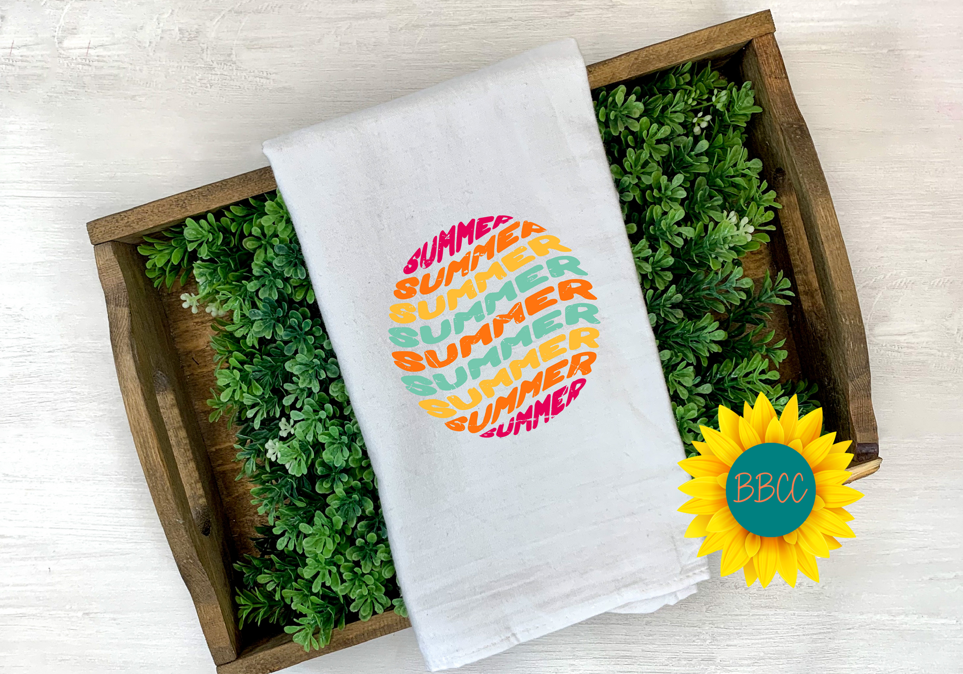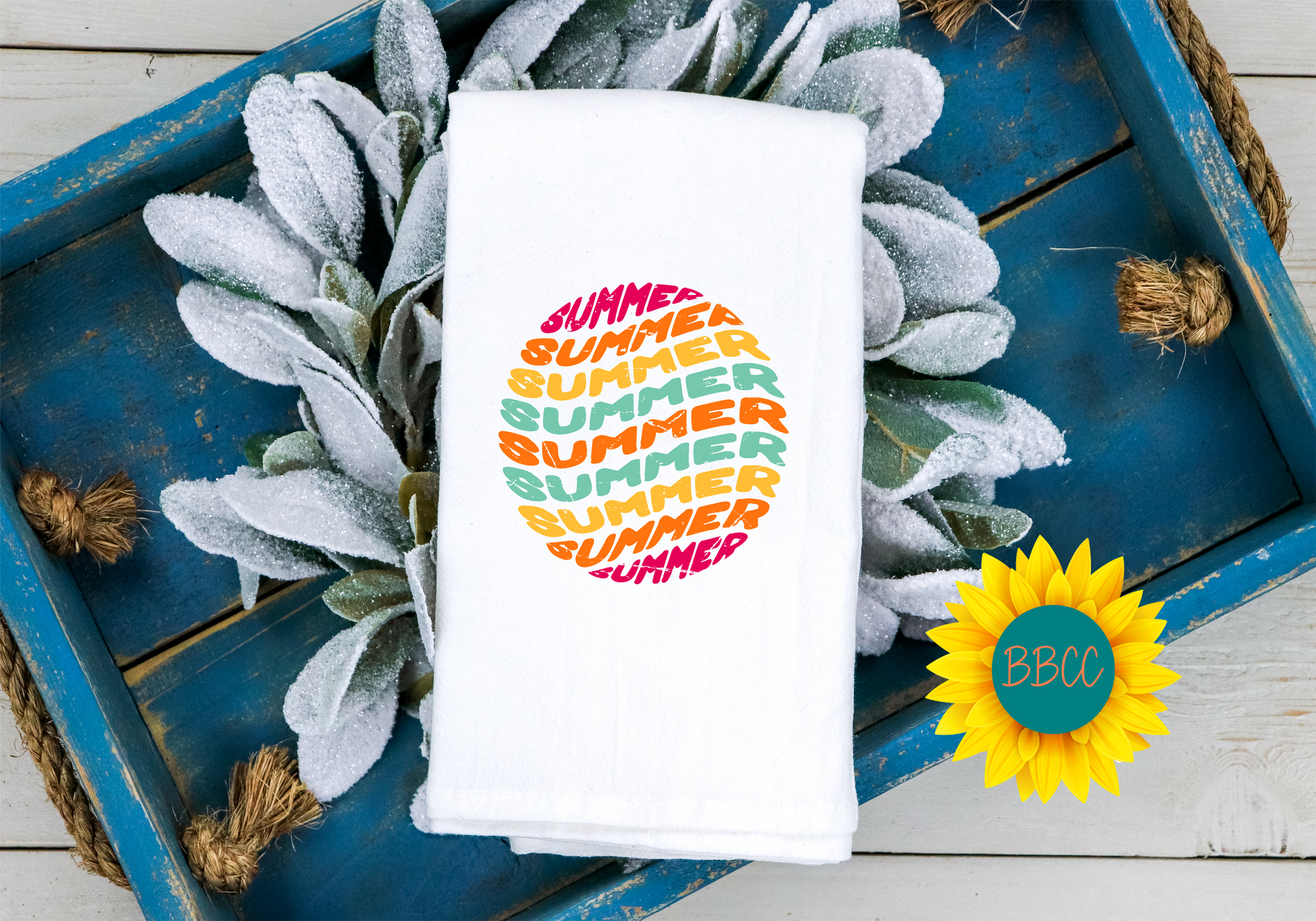 A white kitchen towel displayed on a rustic wooden tray filled with artificial greenery. The towel features a vibrant rainbow design created with the word "SUMMER" repeated in gradient colors - starting with hot pink at the top, transitioning through orange, yellow, mint green, and back to pink at the bottom. The text forms a curved oval shape, creating a cheerful, retro-inspired summer graphic. The entire setup is photographed on a white wooden surface, styled for home décor or gift presentation.