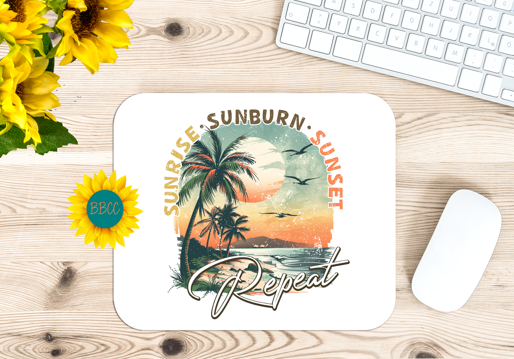 This mouse pad features a vibrant sunset beach design with silhouetted palm trees against a gradient orange and teal sky. The circular artwork includes birds flying overhead and ocean waves below. Text curves around the top reading "SUNRISE SUNBURN SUNSET" in a distressed gold and coral font, while "Repeat" appears in an elegant script at the bottom. The pad is displayed on a white wooden surface with a modern gold and black computer mouse positioned to the right.