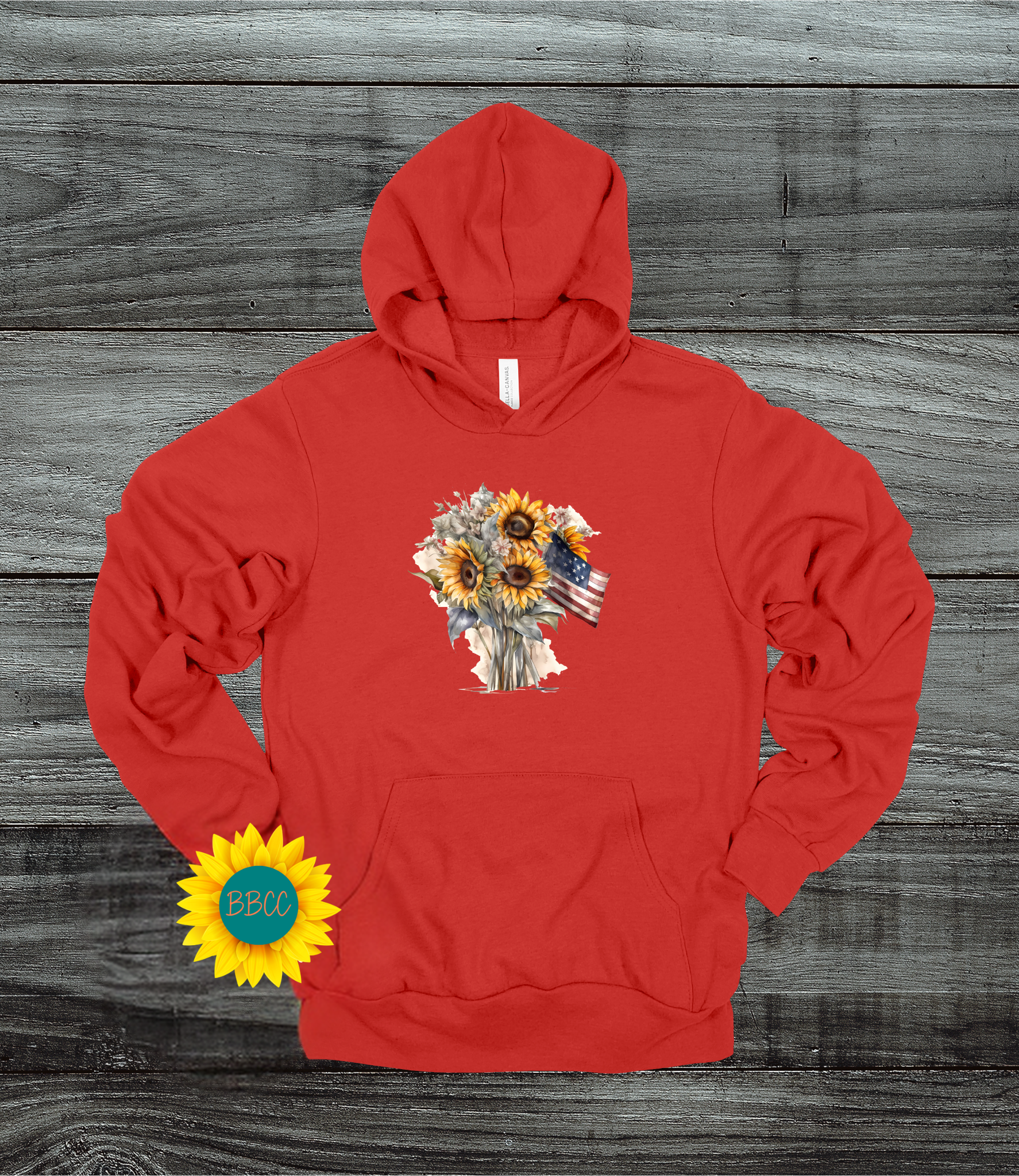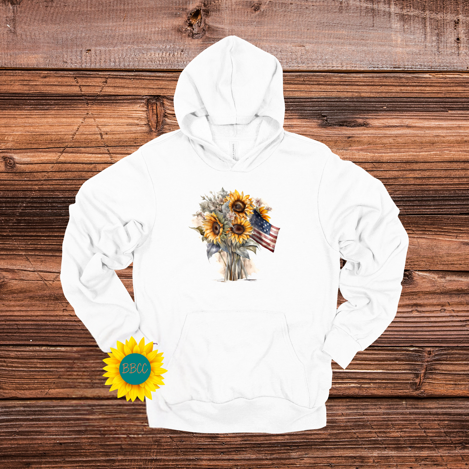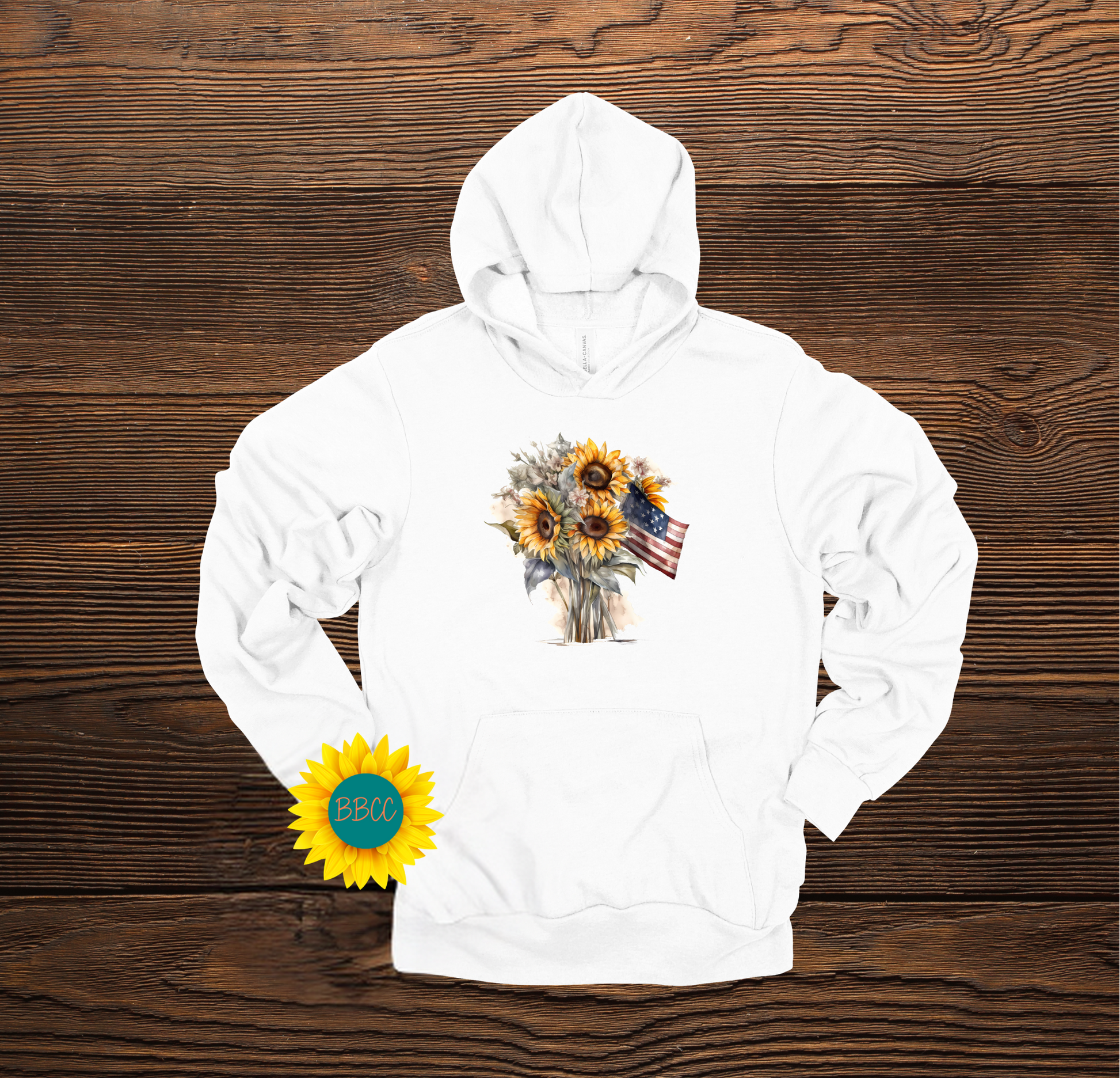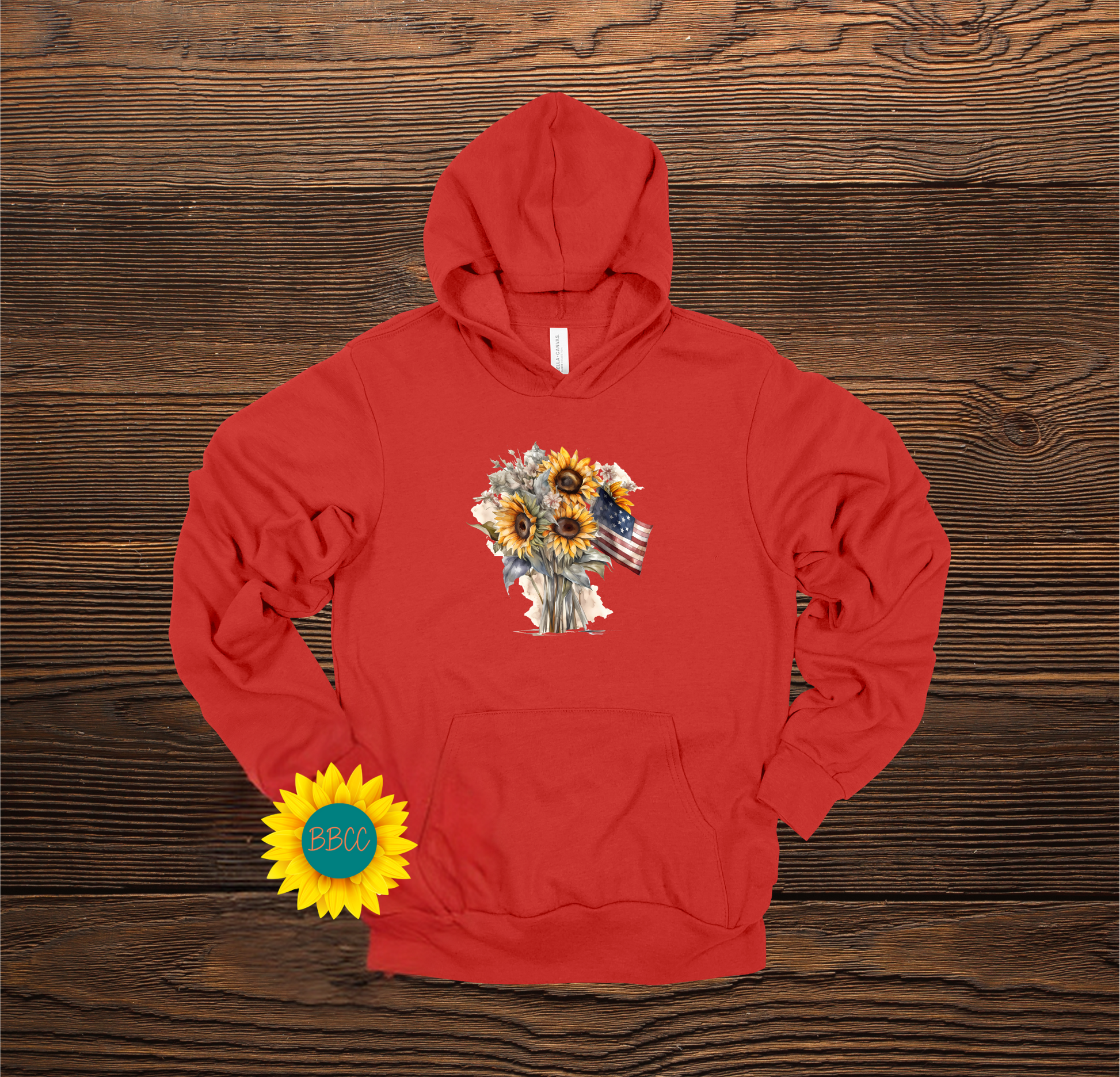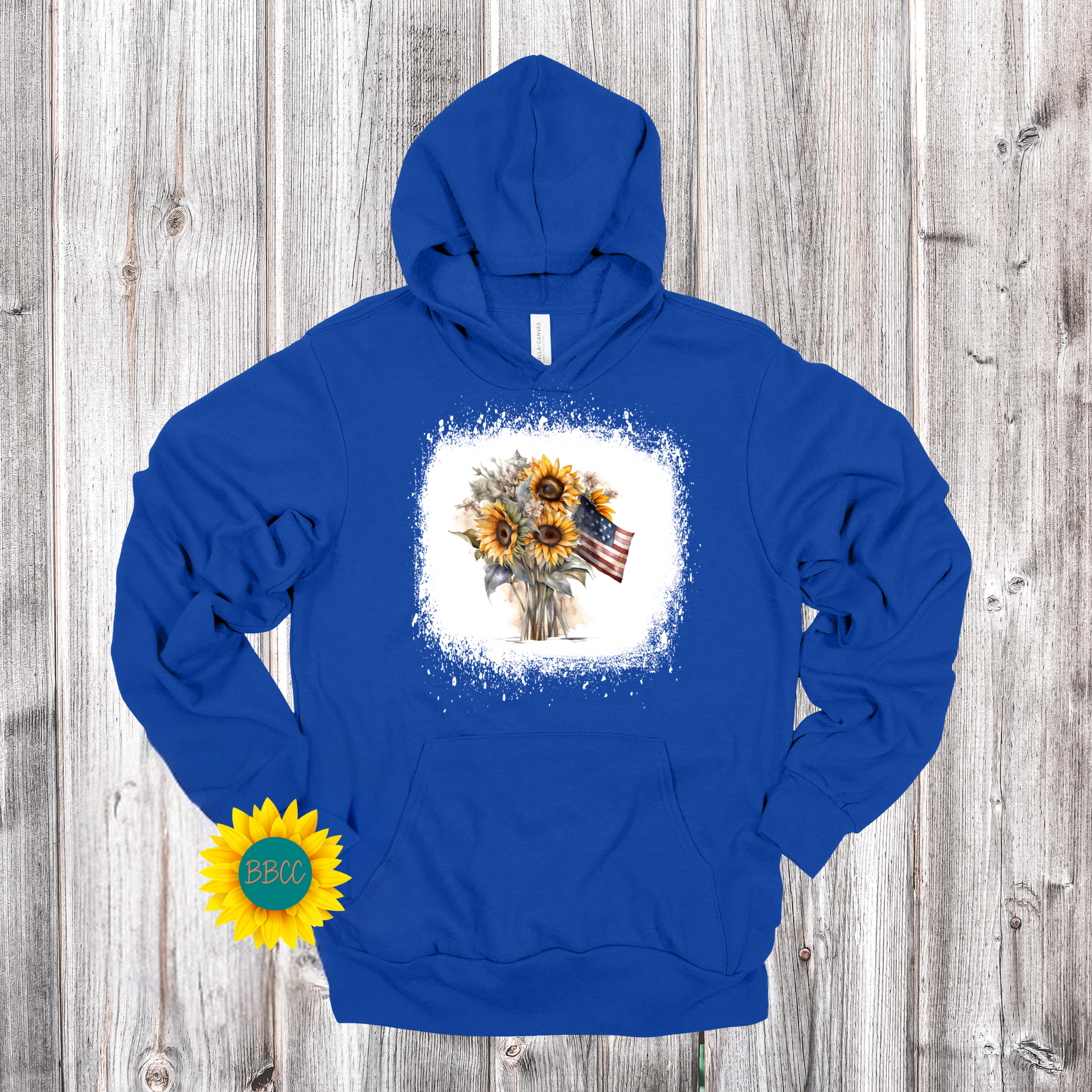 Get ready to bloom in our Sunflowers Hoodie! Perfect for any season, this hoodie features a beautiful bouquet of sunflowers with our flag peeking out. Choose between red, white, or blue, and rock the bleached design on the blue hoodie. Embrace your quirky side with this fun and playful addition to your wardrobe!