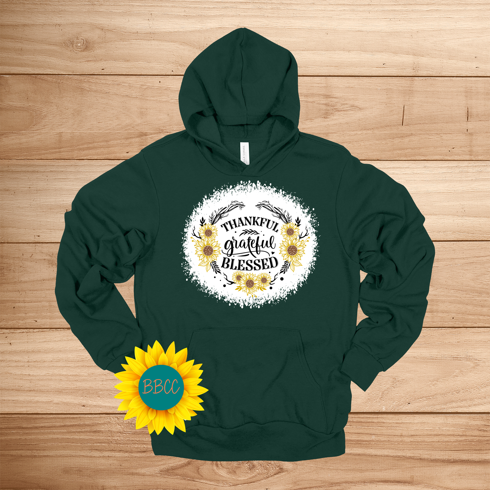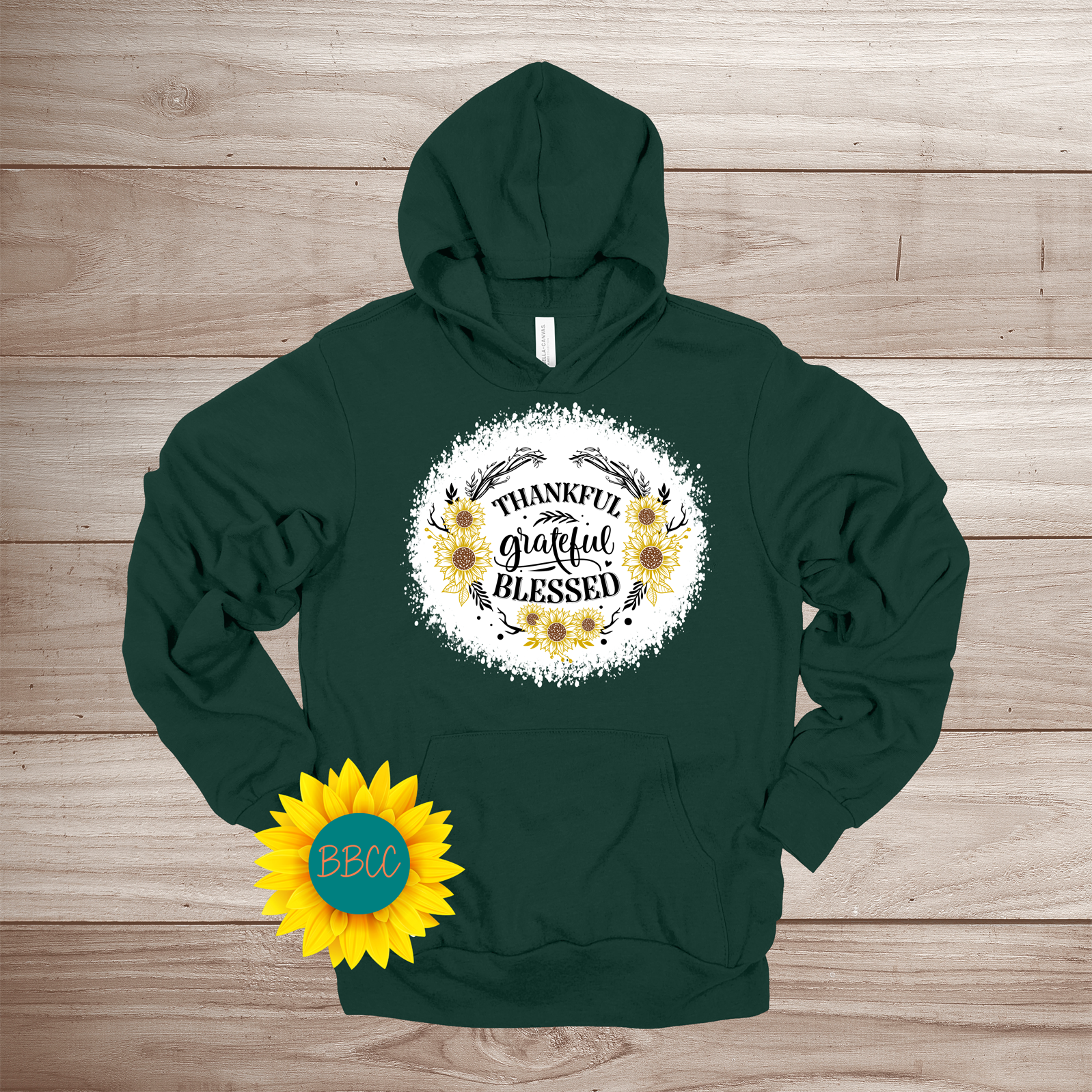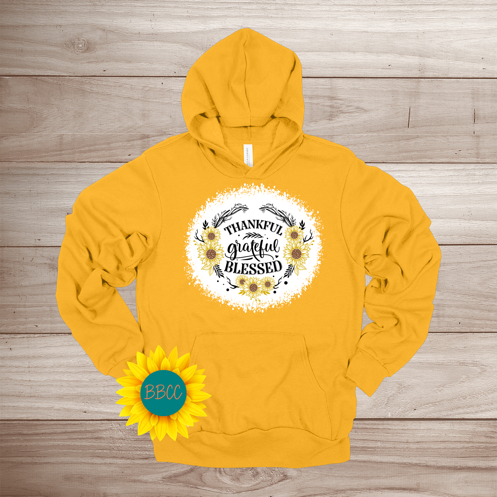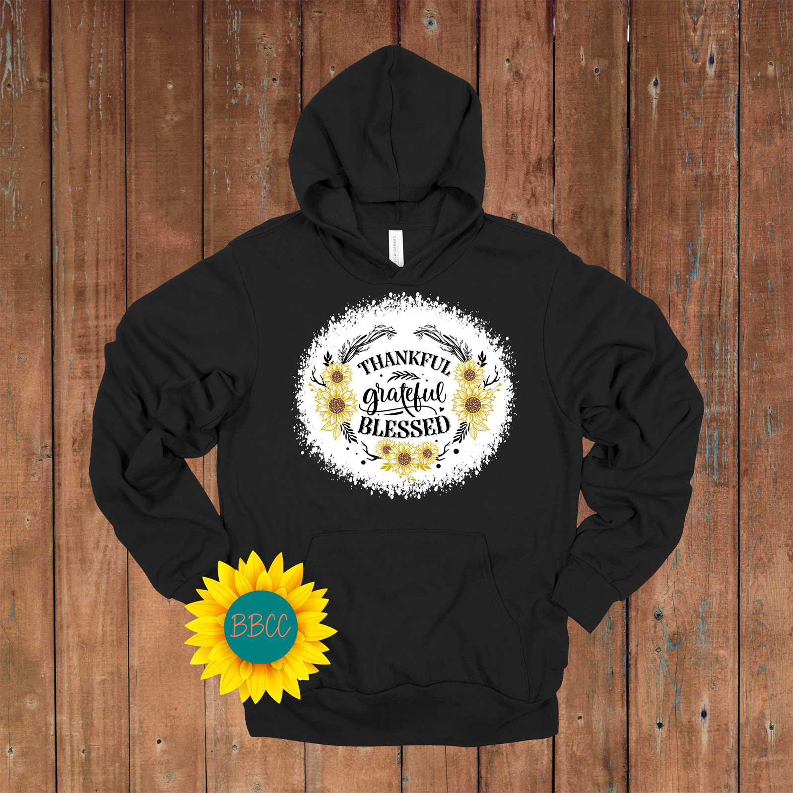 This Thankful, Grateful, Blessed Hoodie features a beautifully bleached spot design with the words "thankful, grateful, blessed" nestled inside a rustic wreath of twigs, complemented by six vibrant sunflowers. Made with high-quality Bella+Canvas materials, this cozy hoodie is available in sizes XS–3XL and is perfect for showing off your grateful spirit in style.