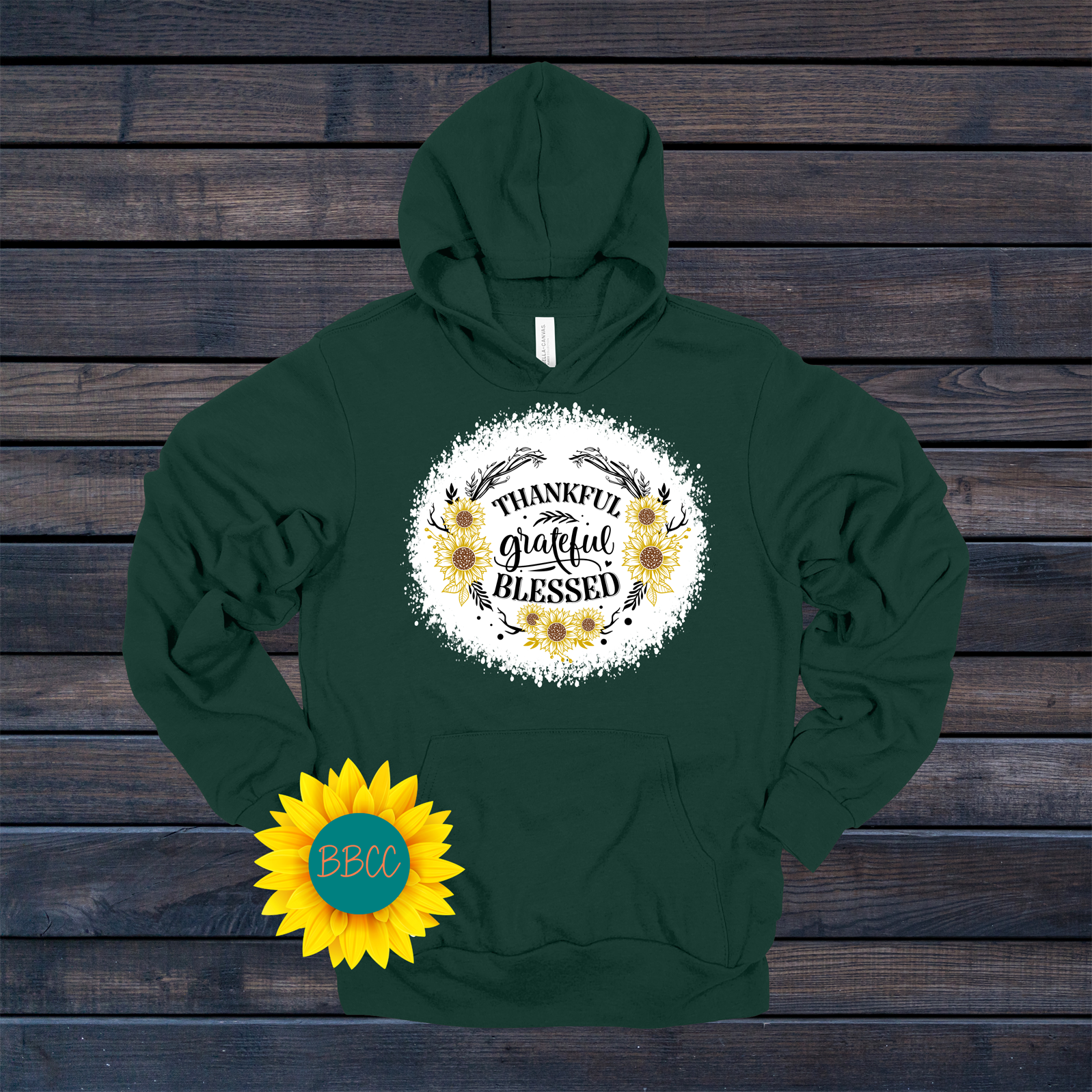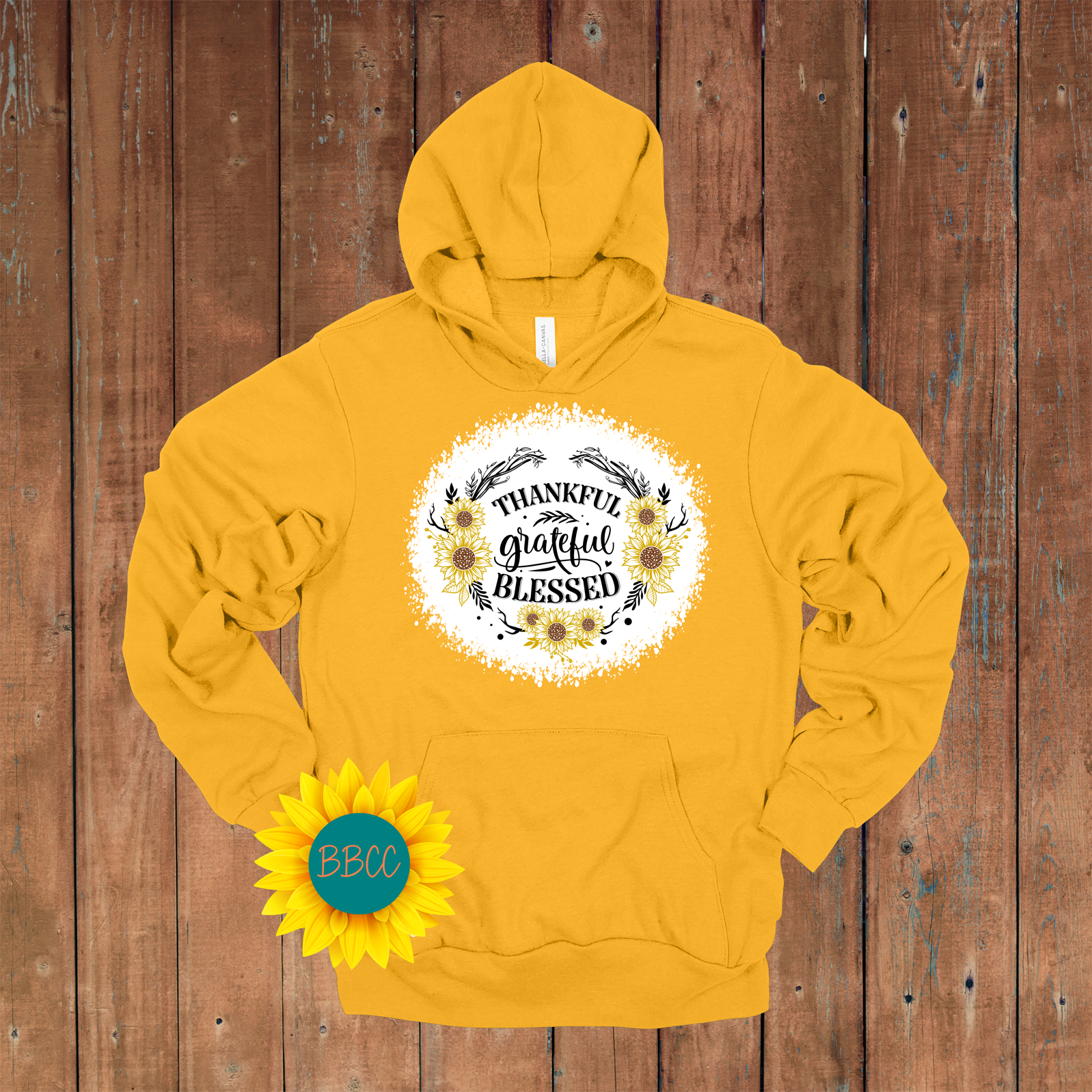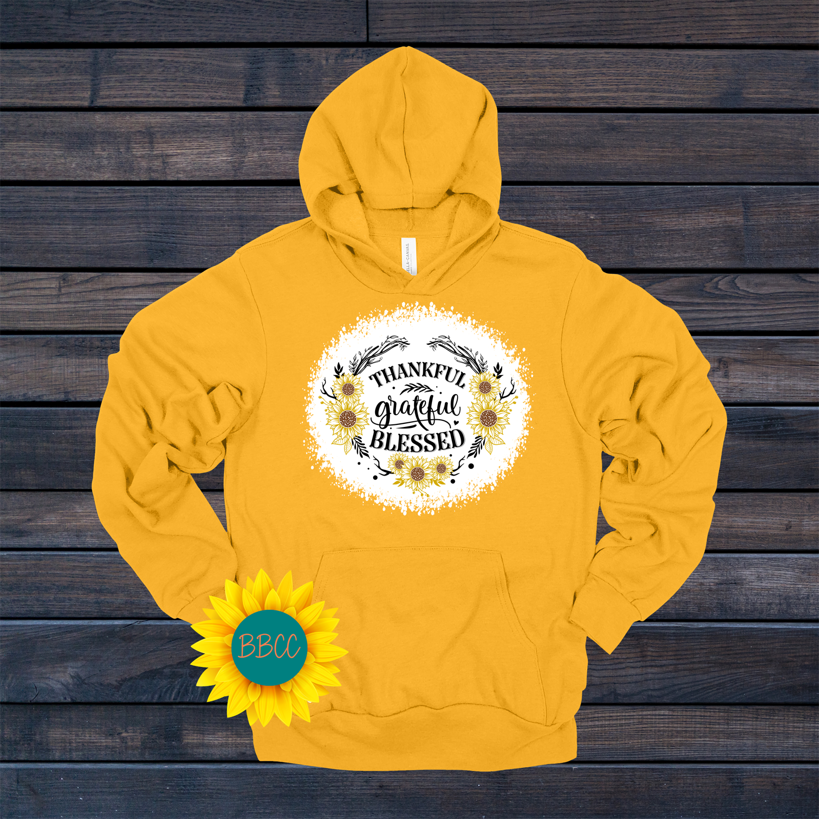 This Thankful, Grateful, Blessed Hoodie features a beautifully bleached spot design with the words "thankful, grateful, blessed" nestled inside a rustic wreath of twigs, complemented by six vibrant sunflowers. Made with high-quality Bella+Canvas materials, this cozy hoodie is available in sizes XS–3XL and is perfect for showing off your grateful spirit in style.