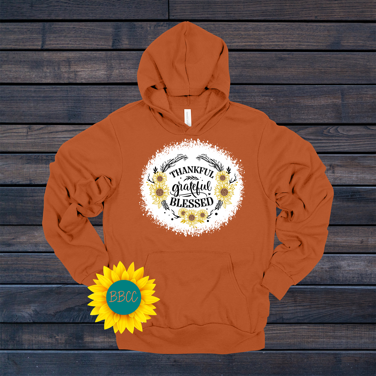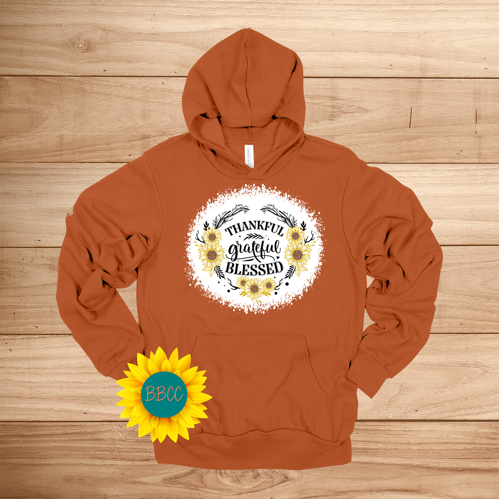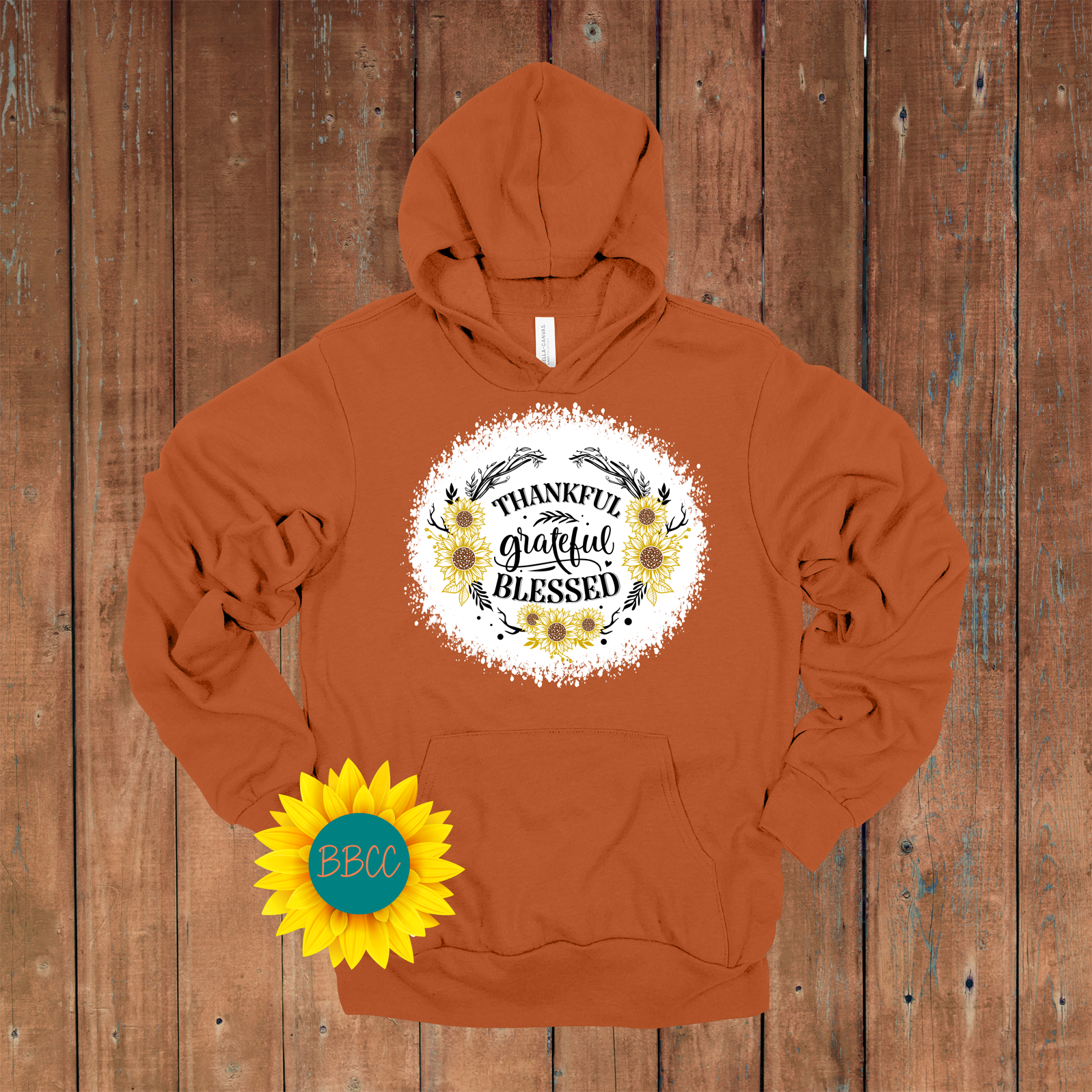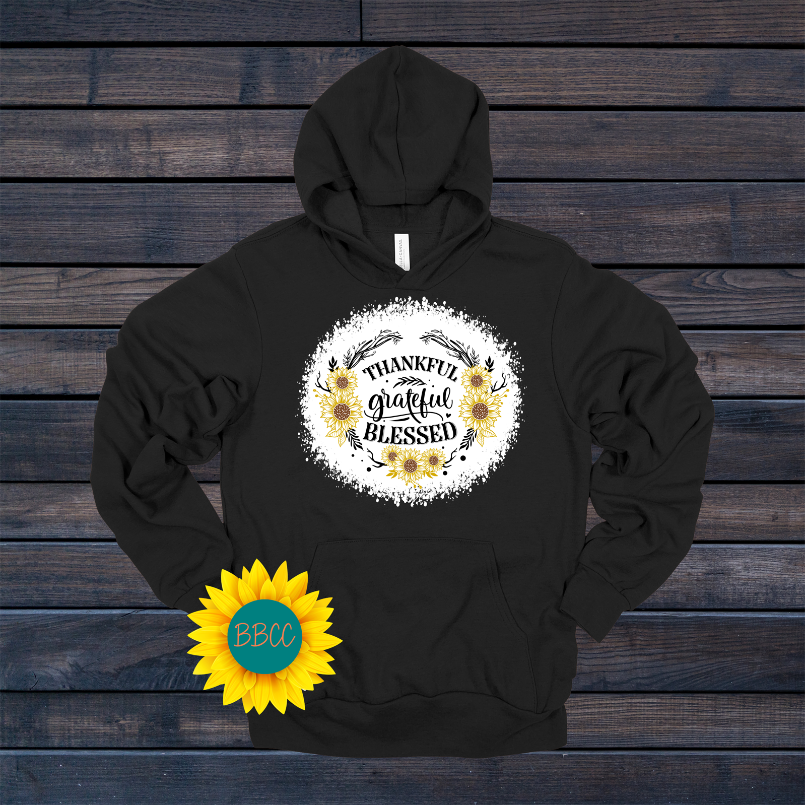 This Thankful, Grateful, Blessed Hoodie features a beautifully bleached spot design with the words "thankful, grateful, blessed" nestled inside a rustic wreath of twigs, complemented by six vibrant sunflowers. Made with high-quality Bella+Canvas materials, this cozy hoodie is available in sizes XS–3XL and is perfect for showing off your grateful spirit in style.