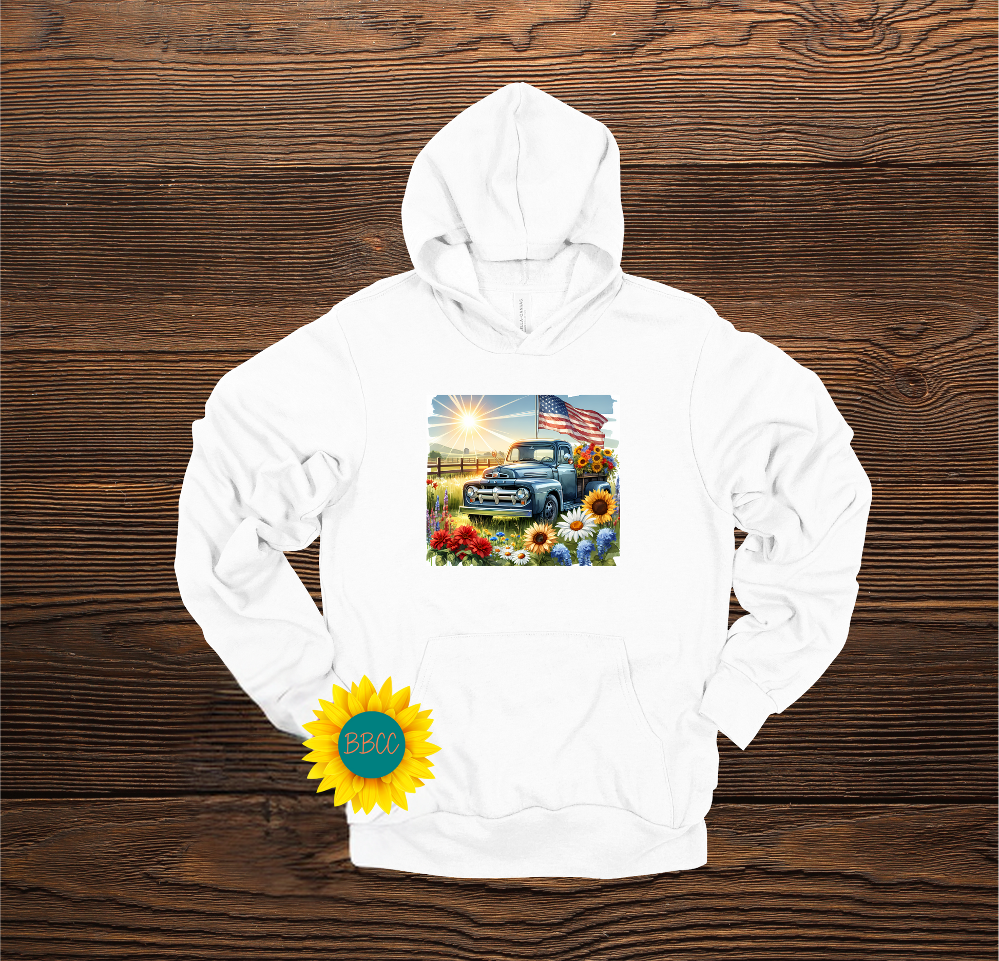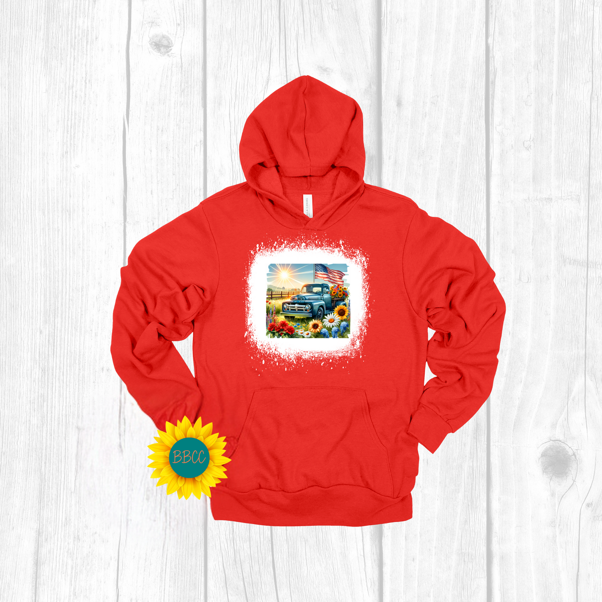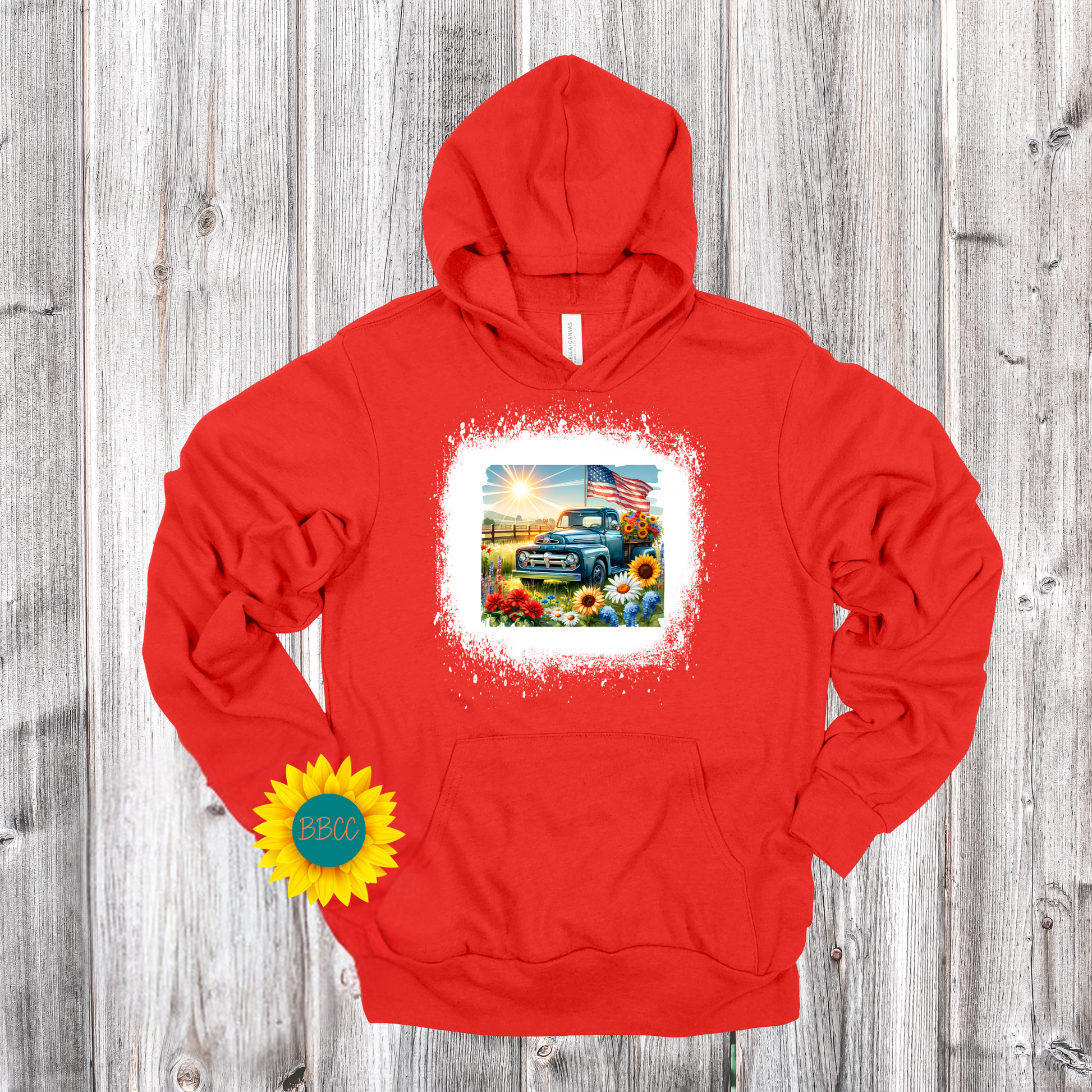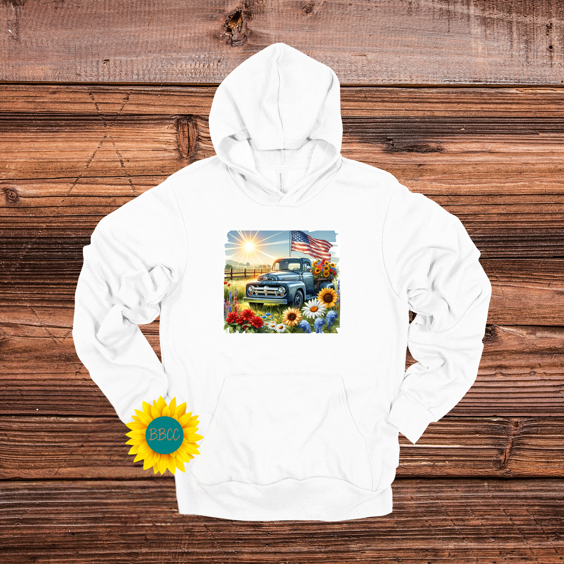 Stand out in our playful Truck Hoodie featuring a picturesque scene of a truck surrounded by wildflowers and sunflowers, proudly flying our flag. Available in red, white, and blue with a unique bleached effect on the red and blue options. Be the talk of the town with this iconic and quirky hoodie.