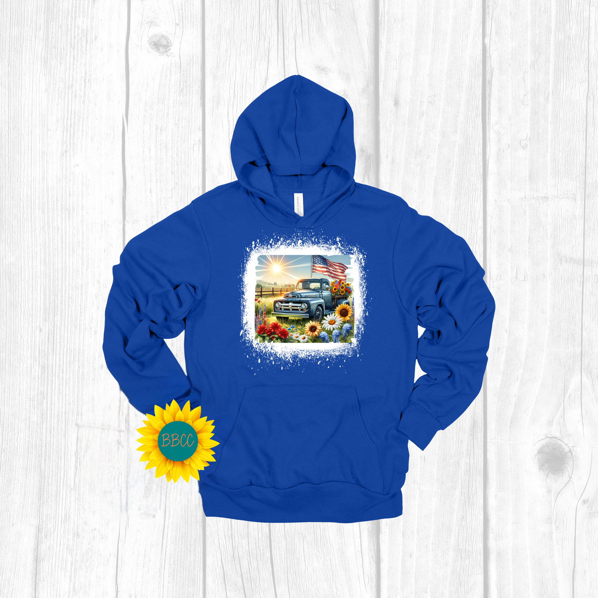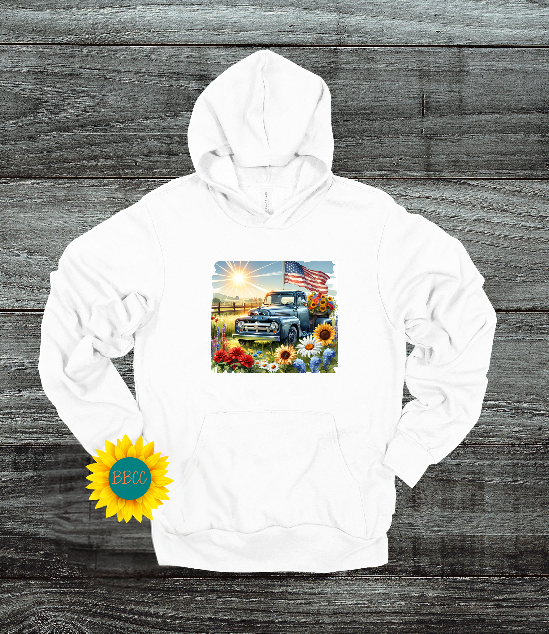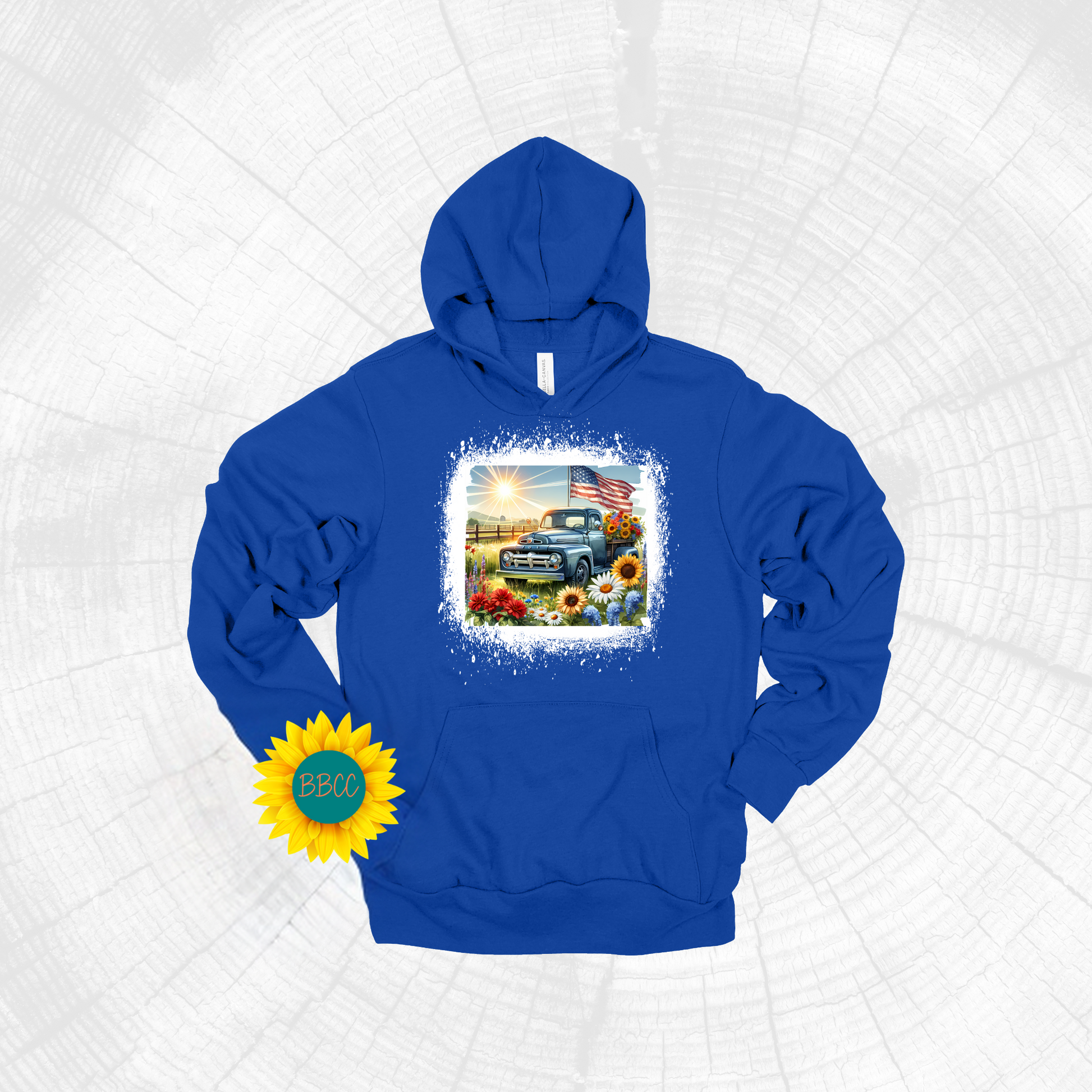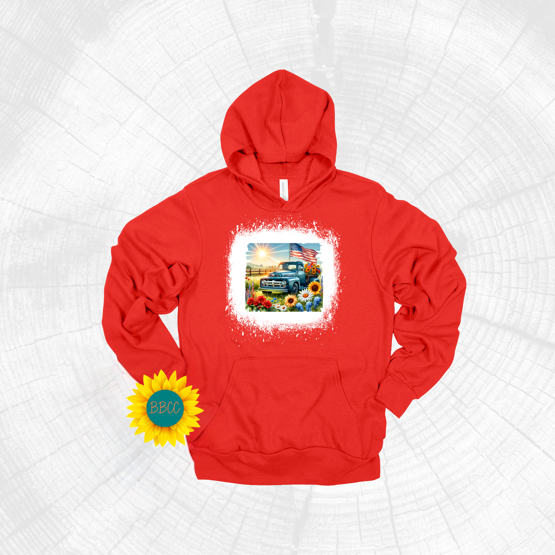 Stand out in our playful Truck Hoodie featuring a picturesque scene of a truck surrounded by wildflowers and sunflowers, proudly flying our flag. Available in red, white, and blue with a unique bleached effect on the red and blue options. Be the talk of the town with this iconic and quirky hoodie.
