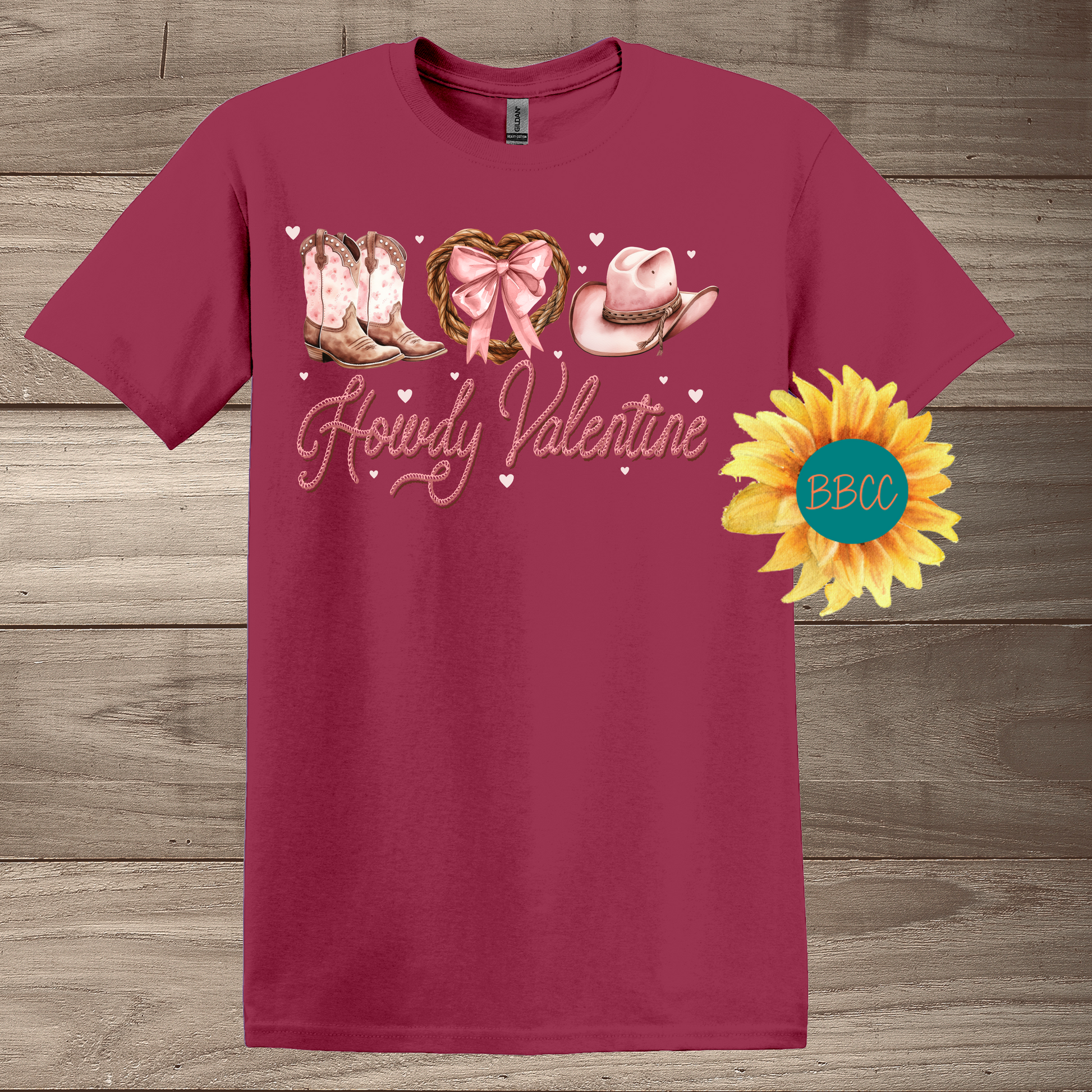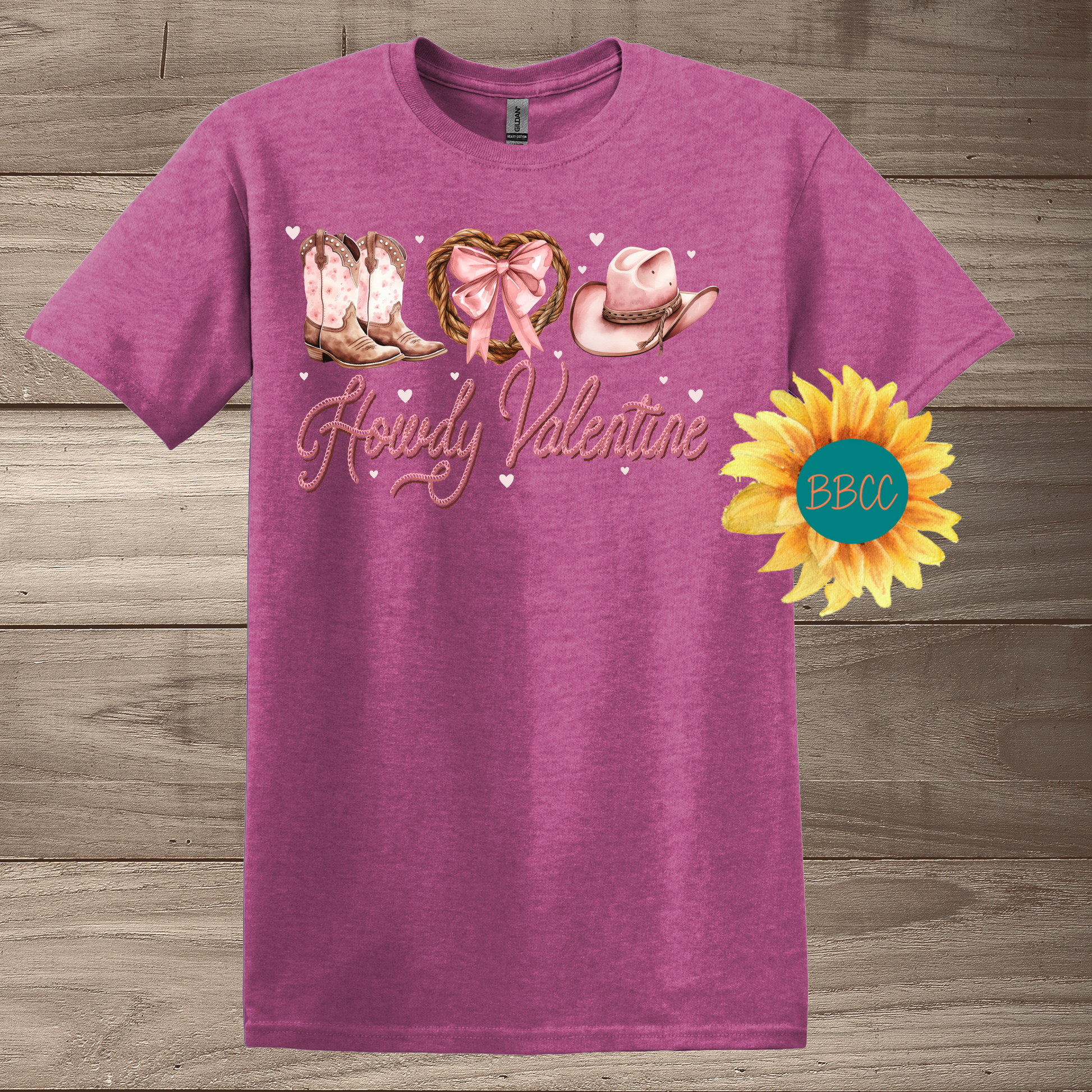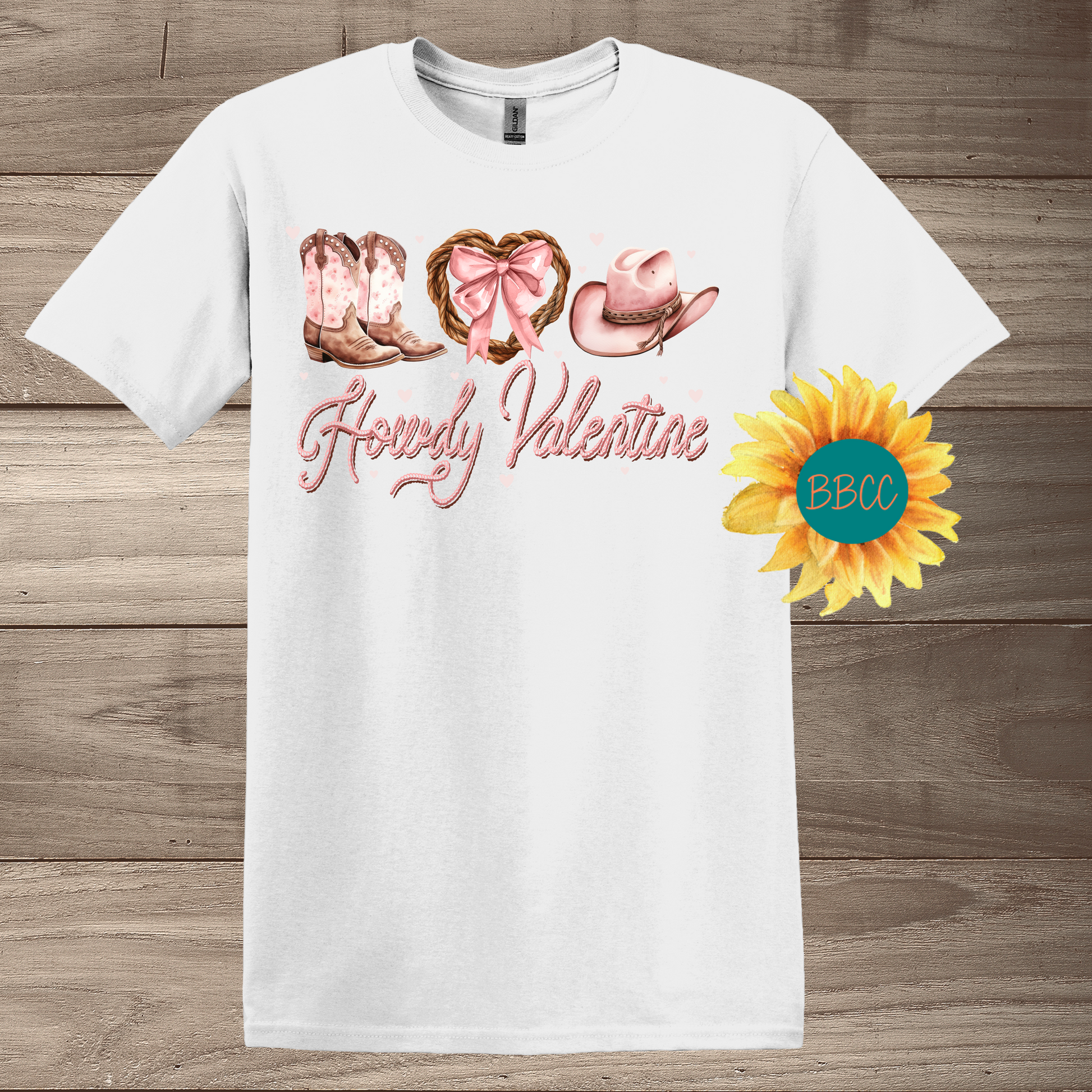 Show off your love for cowgirl fashion this Valentine’s Day with our Valentine Cowgirl T-Shirt. Featuring adorable boots, a hat, and a vine heart with a charming pink bow, along with "Howdy Valentine" in pink rope, this design is the perfect mix of western charm and festive spirit. Available in various colors and sizes, spread the love and style with this cute and unique option!