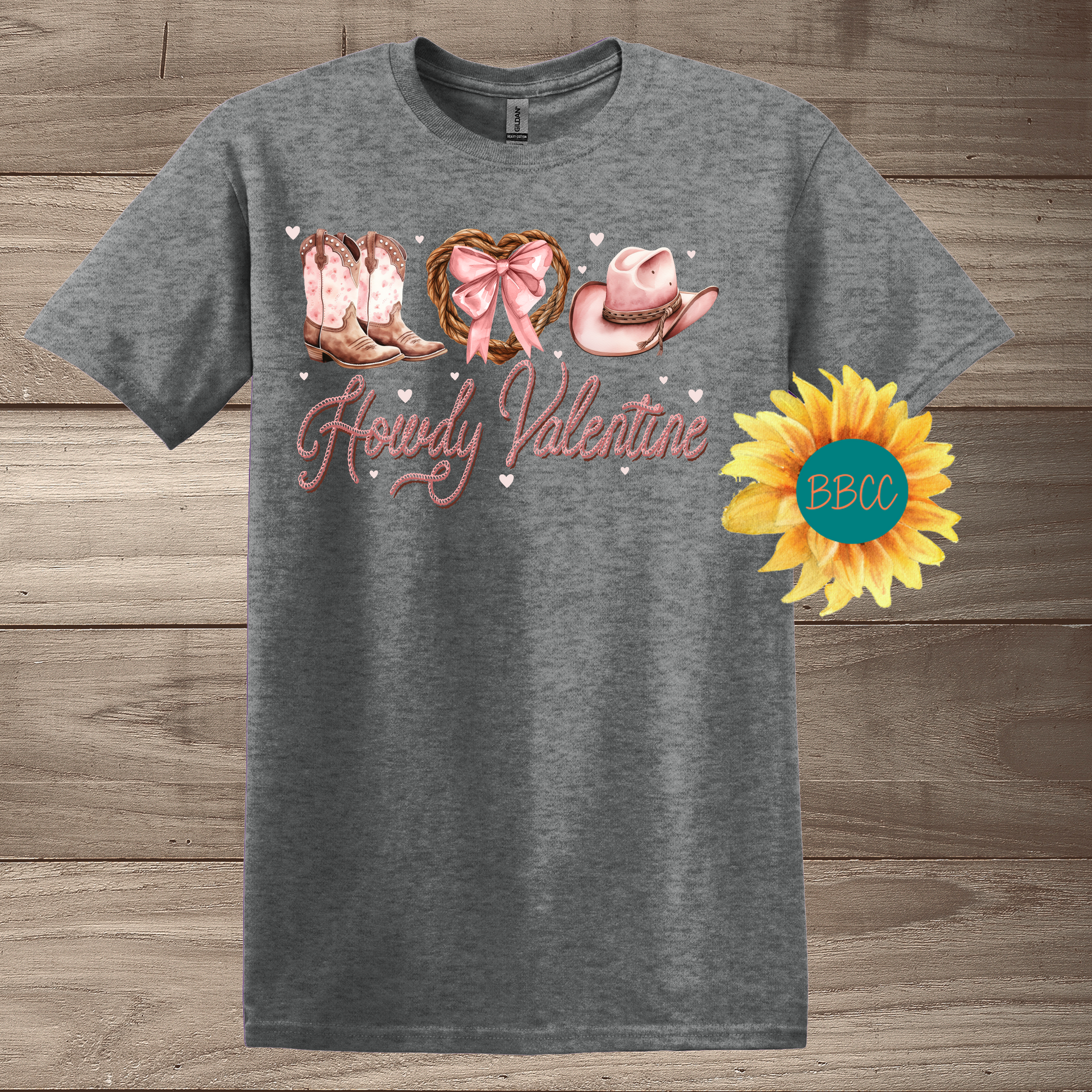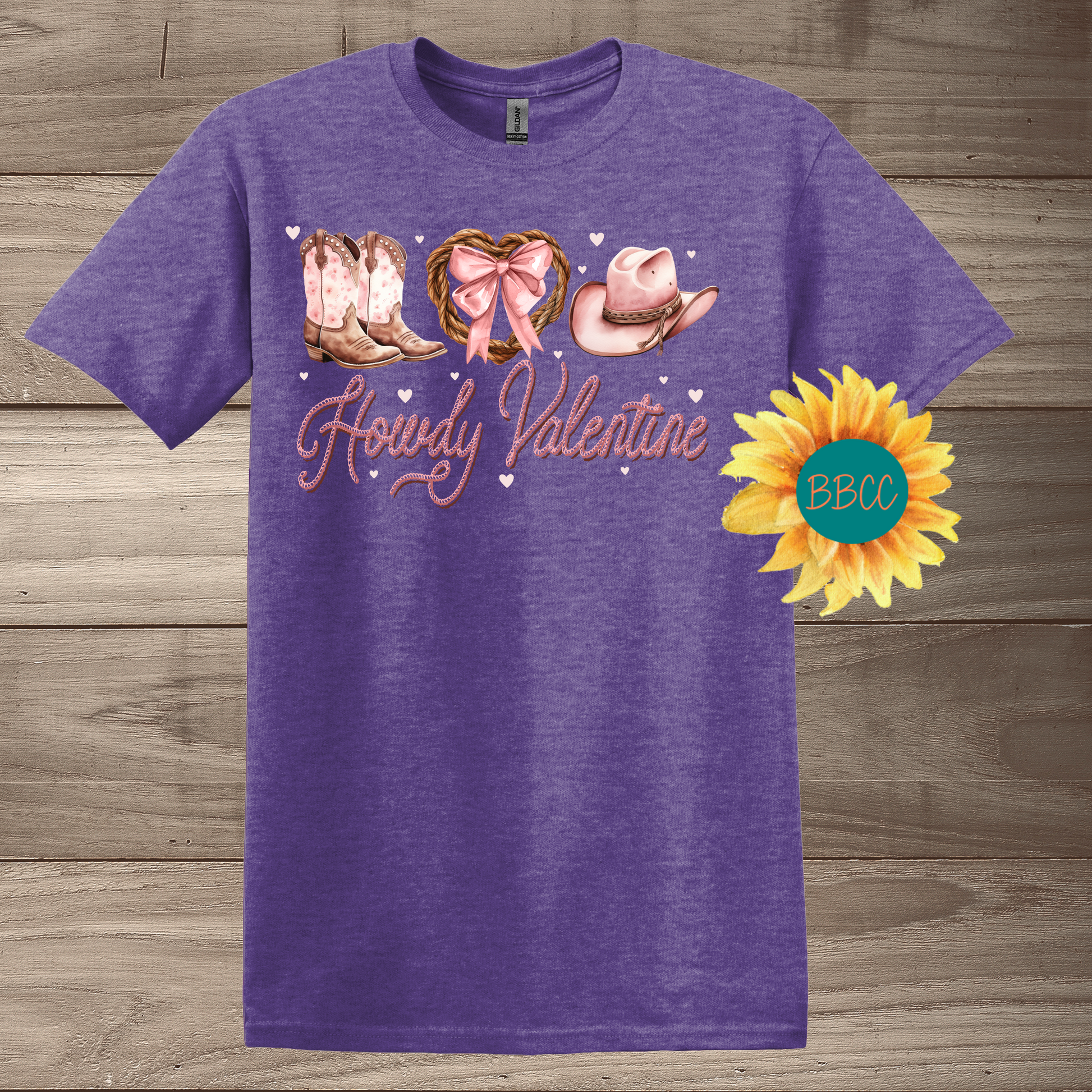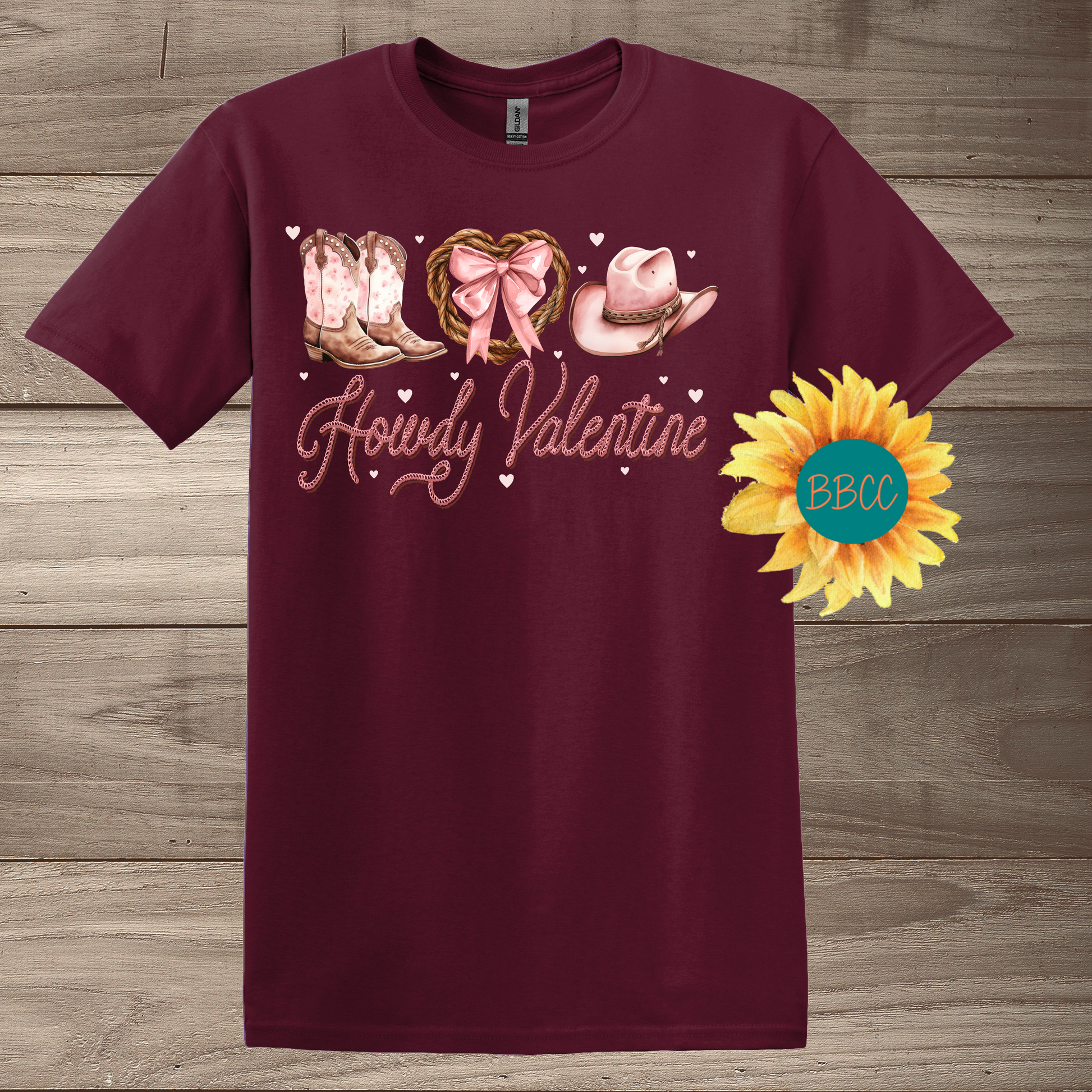 Show off your love for cowgirl fashion this Valentine’s Day with our Valentine Cowgirl T-Shirt. Featuring adorable boots, a hat, and a vine heart with a charming pink bow, along with "Howdy Valentine" in pink rope, this design is the perfect mix of western charm and festive spirit. Available in various colors and sizes, spread the love and style with this cute and unique option!